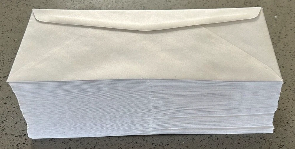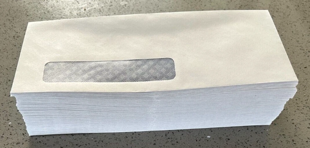 Lot of 100 white window security envelopes #10, 4 1/8 in x 9 1/2in, gummed closure.