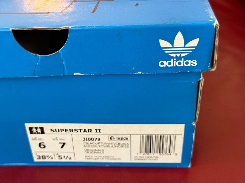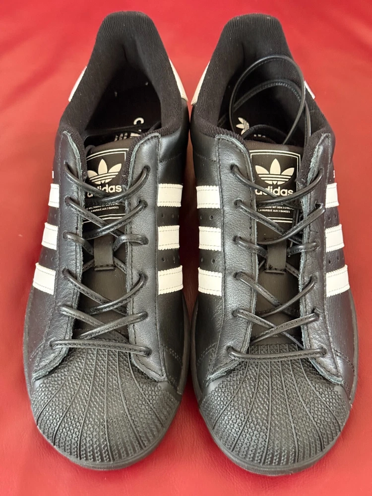 $100.00 MSRP NOTE: Shoes are brand new. Box is a little beat up. Description The beloved adidas Superstar Shoe with a classic rounded shell toe. The iconic adidas Superstar shoes are back. Step into 50 years of sport and street style with these low top sneakers. A smooth leather upper and rubber shell toe evoke memories of basketball courts and city streets. The padded tongue and collar add comfort for all-day wear while the textured rubber outsole provides grip. Whether you're shooting hoops or hitting the town, the adidas Superstar shoes have the versatility and retro appeal to take you there in classic style. Details Regular fit Lace closure Leather upper Padded tongue Textile lining Rubber outsole Imported Product color: Core Black / Cloud White / Core Black Product code: JI0079