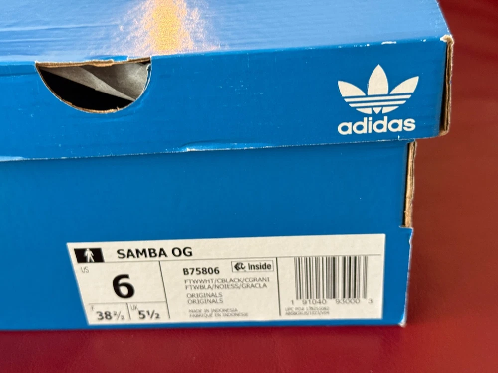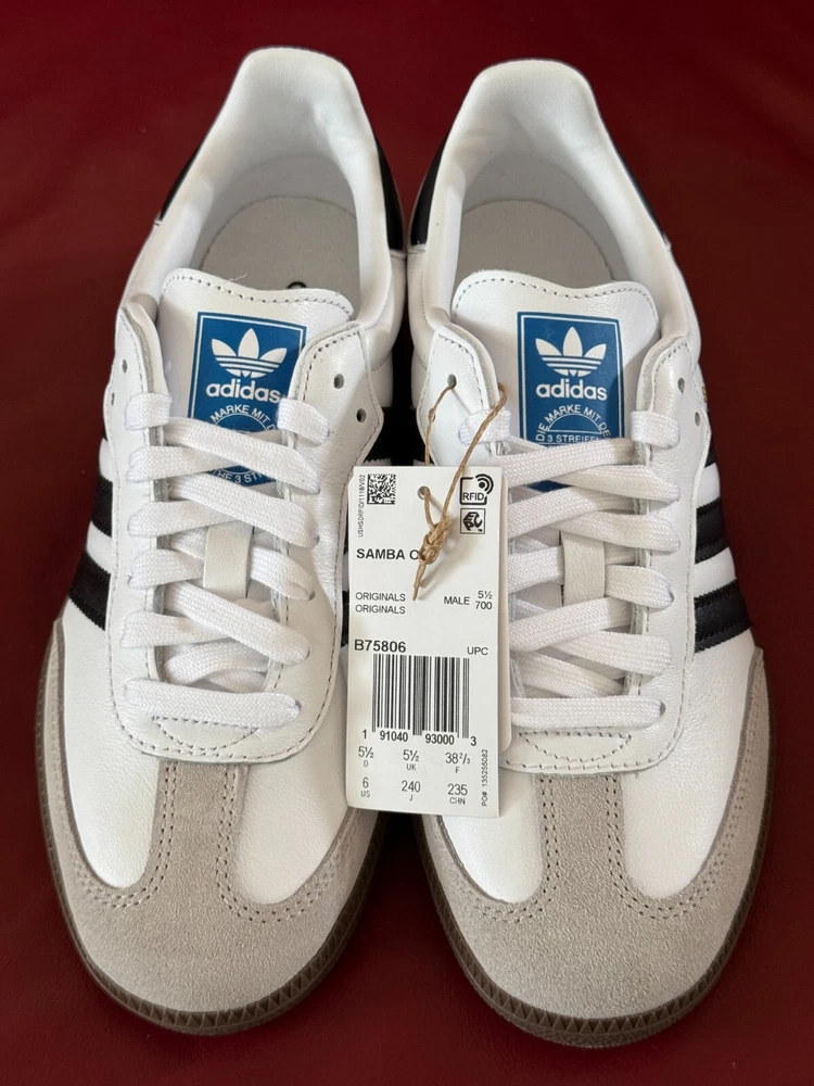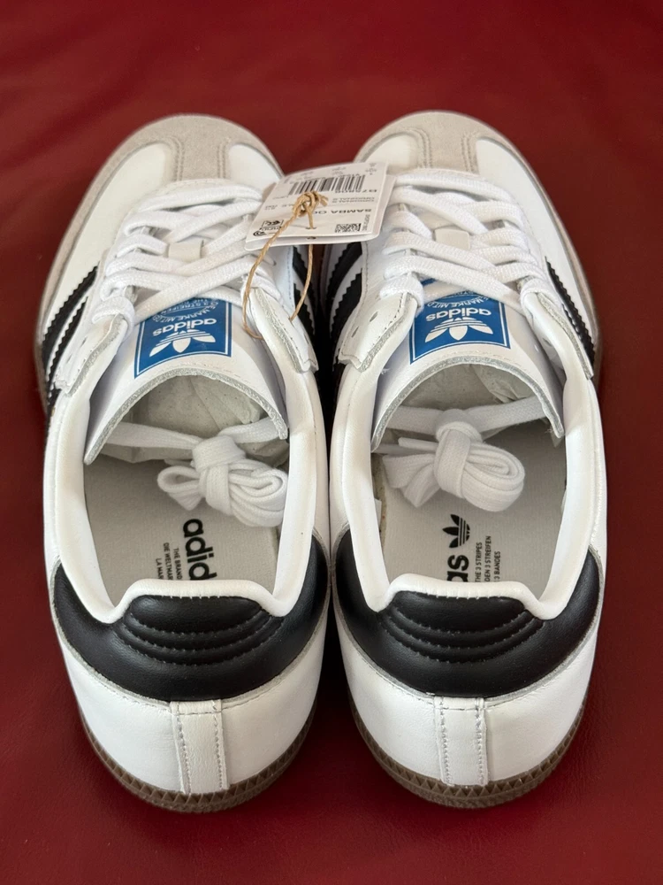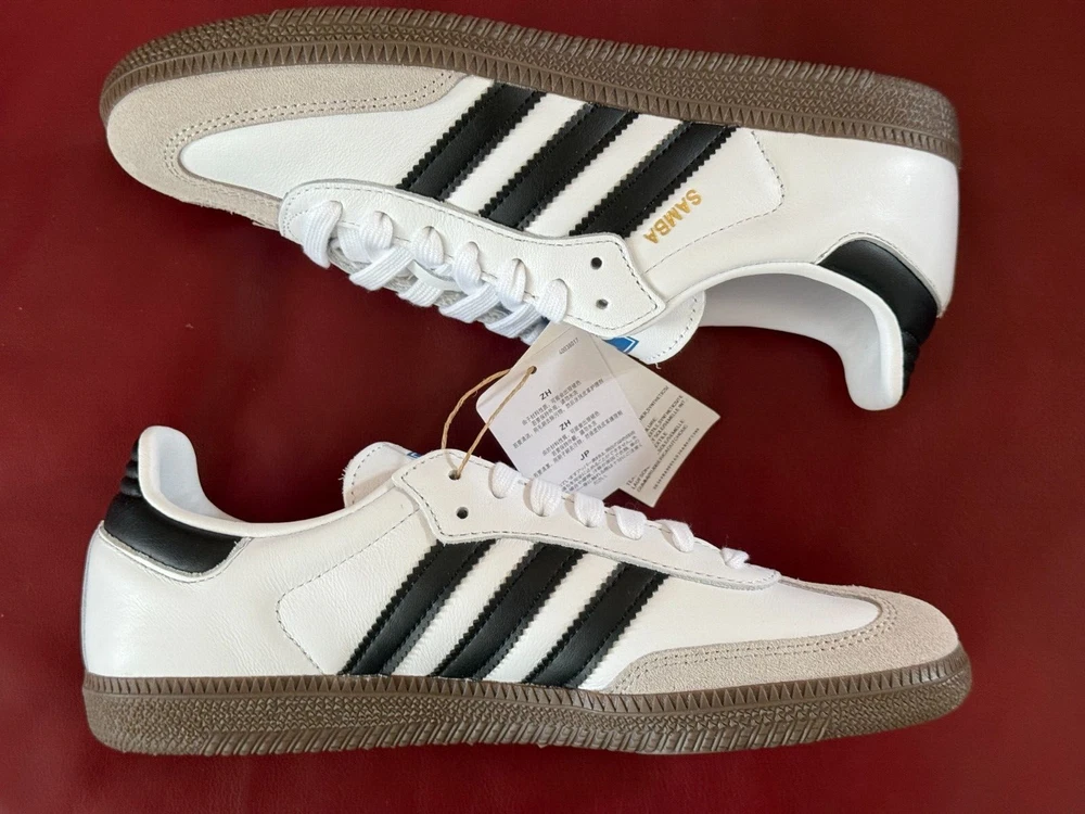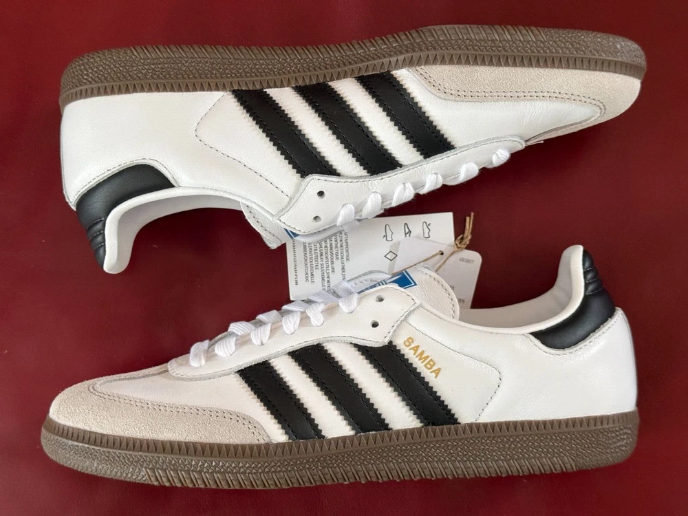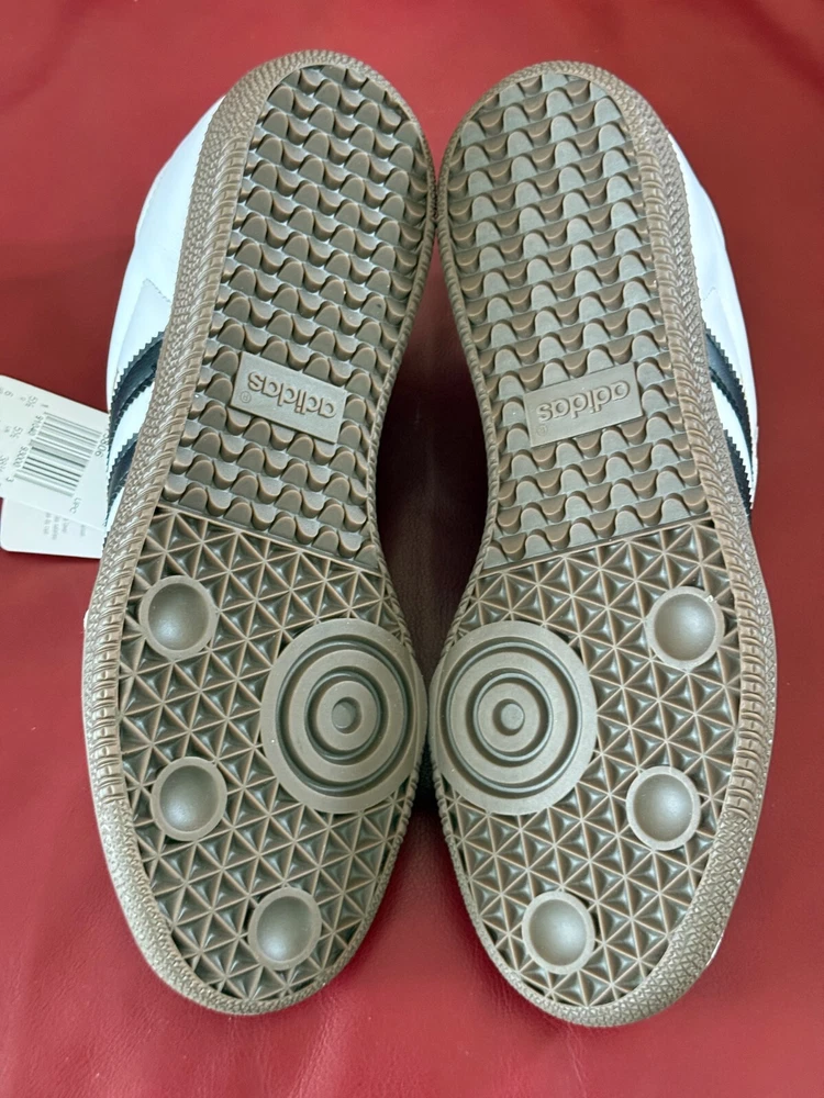 $100.00 MSRP NOTE: Shoes are brand new. Box is a little beat up. Description SAMBA ORIGINALS Born on the pitch, the Samba is a timeless icon of street style. This silhouette stays true to its legacy with a tasteful, low-profile, soft leather upper, suede overlays and gum sole, making it a staple in everyone's closet - on and off the pitch. Details Regular fit Lace closure Full grain leather upper with gritty suede and gold foil details Synthetic leather lining; Gum rubber cupsole Gum rubber midsole Imported Product color: Cloud White / Core Black / gum Product code: B75806