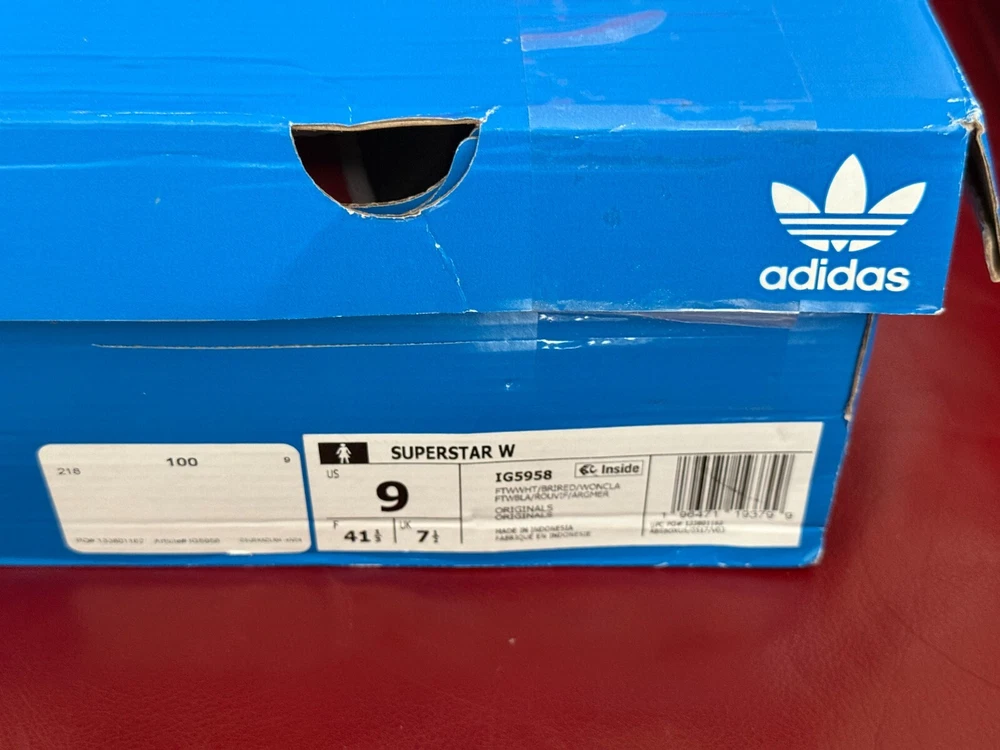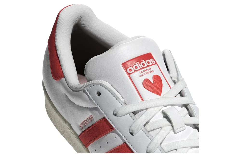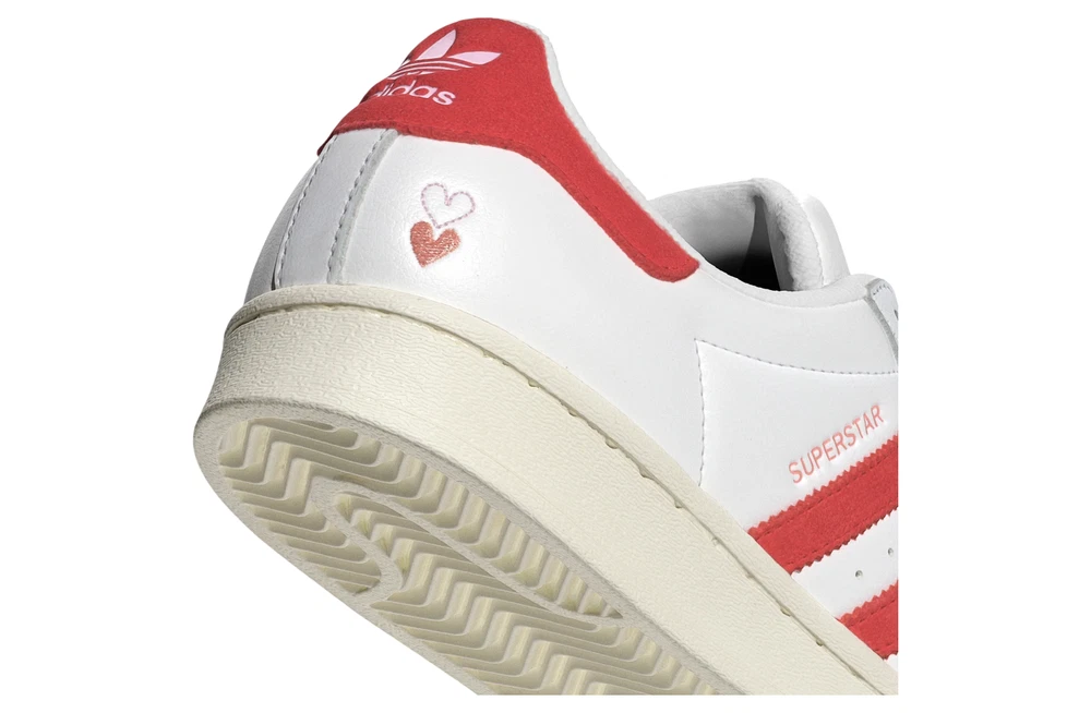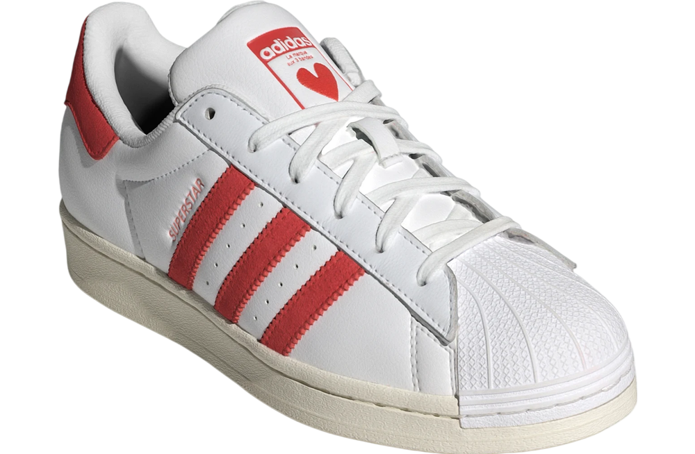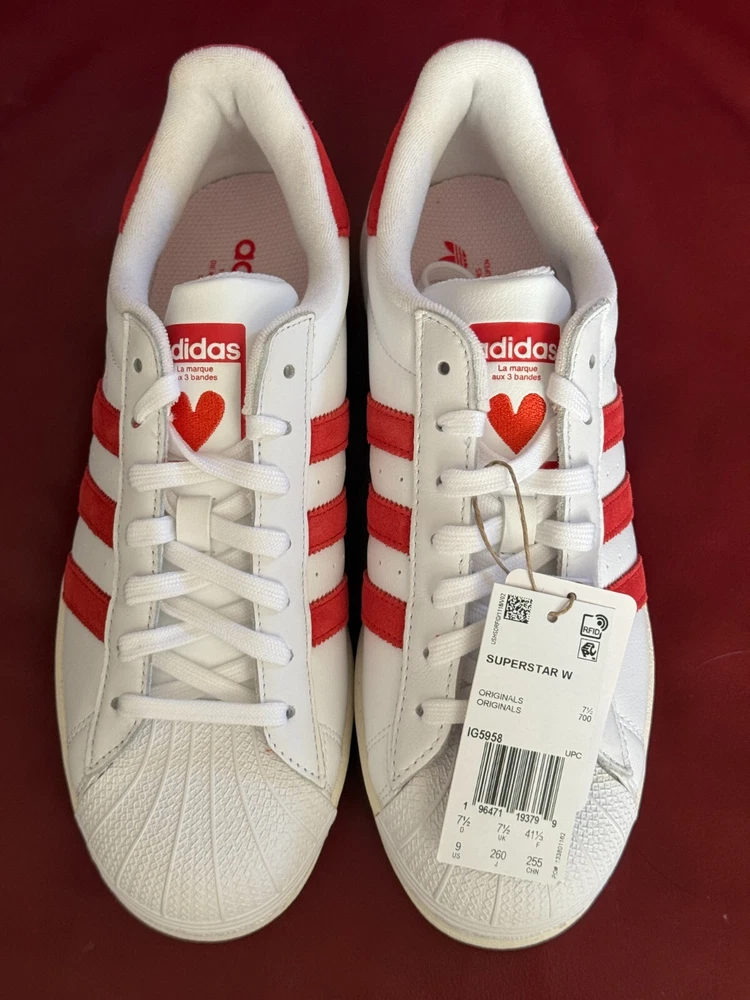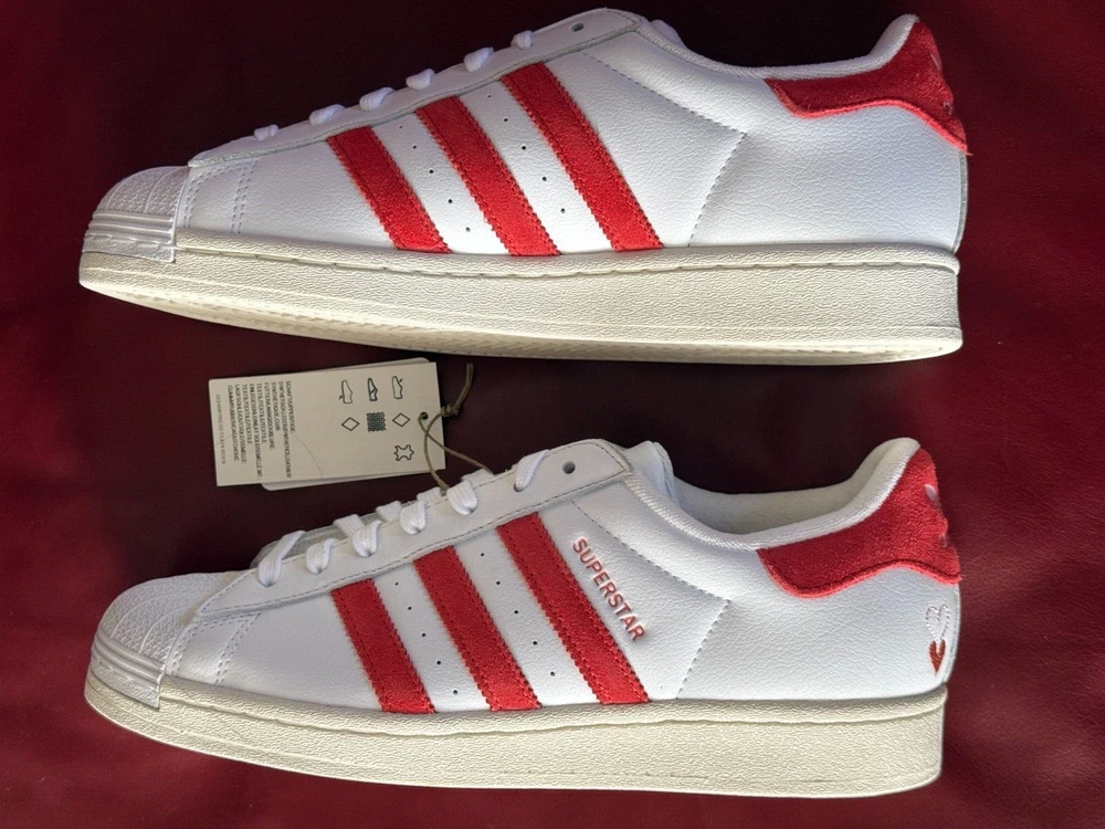 $100.00 MSRP NOTE: Shoes and brand new, pristine, and have never been worn. Box is beat up. The adidas Women’s Superstar ‘Valentine’s Day 2024’ dresses the classic silhouette in a holiday-themed palette in honor of February 14. Crafted from white leather with a tonal rubber shell toe, the upper features red suede detailing on the signature three-stripes and Trefoil-branded back tab. A pair of hearts are embroidered on the lateral heel, while an additional heart graphic adorns the adidas tongue tag. A vintage off-white finish is applied to a rubber cupsole, featuring a herringbone traction pattern underfoot. Details & care Serrated 3-Stripes and a textured clamshell toe bring iconic detailing to a sneaker that's been a footwear favorite since it hit the streets in 1969. Its low, lace-to-toe profile and herringbone tread keep the heritage vibes alive and on the move. Lace-up style Leather and synthetic upper/textile lining/rubber sole Imported PRODUCT INFORMATION Model: IG5958 Release Date: 2024-01-01 Series: Superstar Nickname: Valentine's Day Thickness: Regular sole Upper Material: Leather Closure: Lacing Sole Material: Rubber Sole Upper: Low Top Toe Type: Round Toe Occasion: lifestyle Color: white Colorway: Cloud White/Bright Red/Wonder Clay