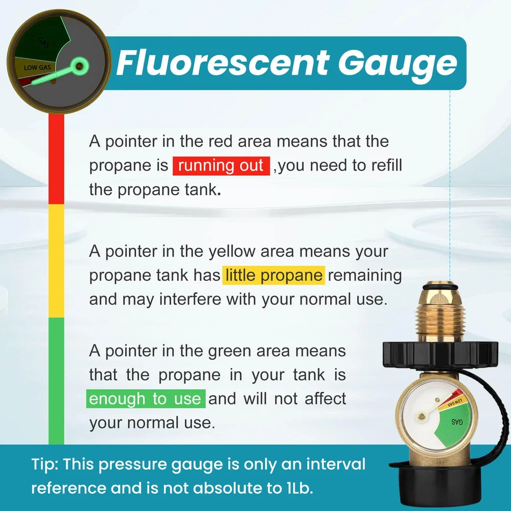 【Role and Function】The upgraded pol to qcc1 adapter converts your large propane tank's POL connection to QCC Type1 & POL connection, It offfers both types of connections for your propane tank. It is more convenient for daily use by using this pol propane tank gauge. 【Fluorescent Pointer】The pointer of this 100 lb propane tank gauge is made of fluorescent material, you can clearly know the propane level of the propane tank in dark environment. The rotatable gauge allows the gauge to be in a position suitable for reading. (Tips: This propane tank gauge 100lb only provides a reference interval and it is not accurate to every pound.) 【Preferred Material】The pol lp tank valve to qcc1 kit is made of 100% solid brass with high strength and hardness, so it can withstand harsh weather and hot and cold changes, dent corrosion, scratches, etc. It will provide you with long term secure connection, more worry free. 【Packing list】Propane adapter pol to qcc1 X 1, dust cover X 1. This pol to type 1 propane adapter is equipped with an handwheel, you just need to tighten the propane tank adapter by the handwheel and then you can put it into use, tools is no need. (tips: before starting to use, please make sure the installation is correct, no gas leakage)