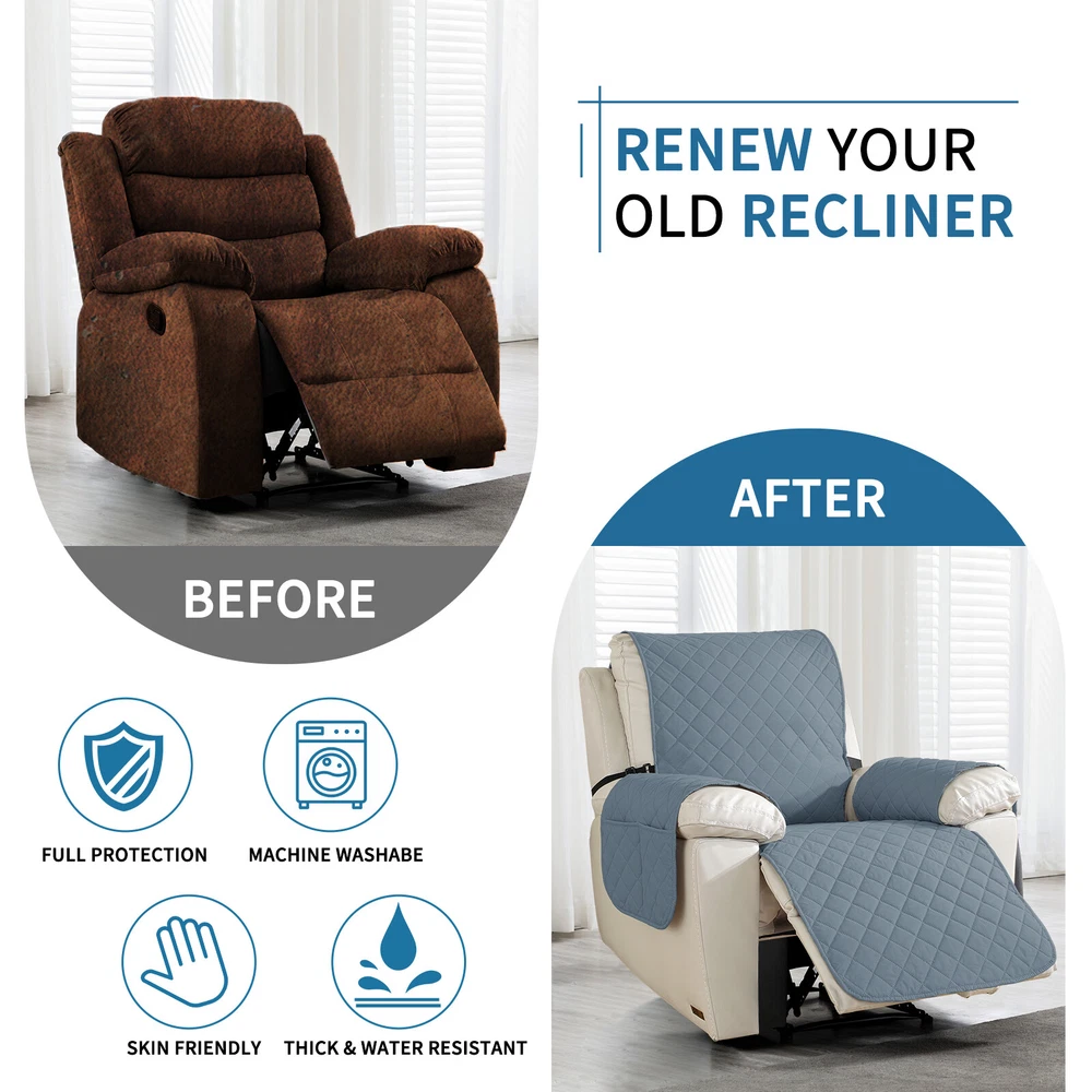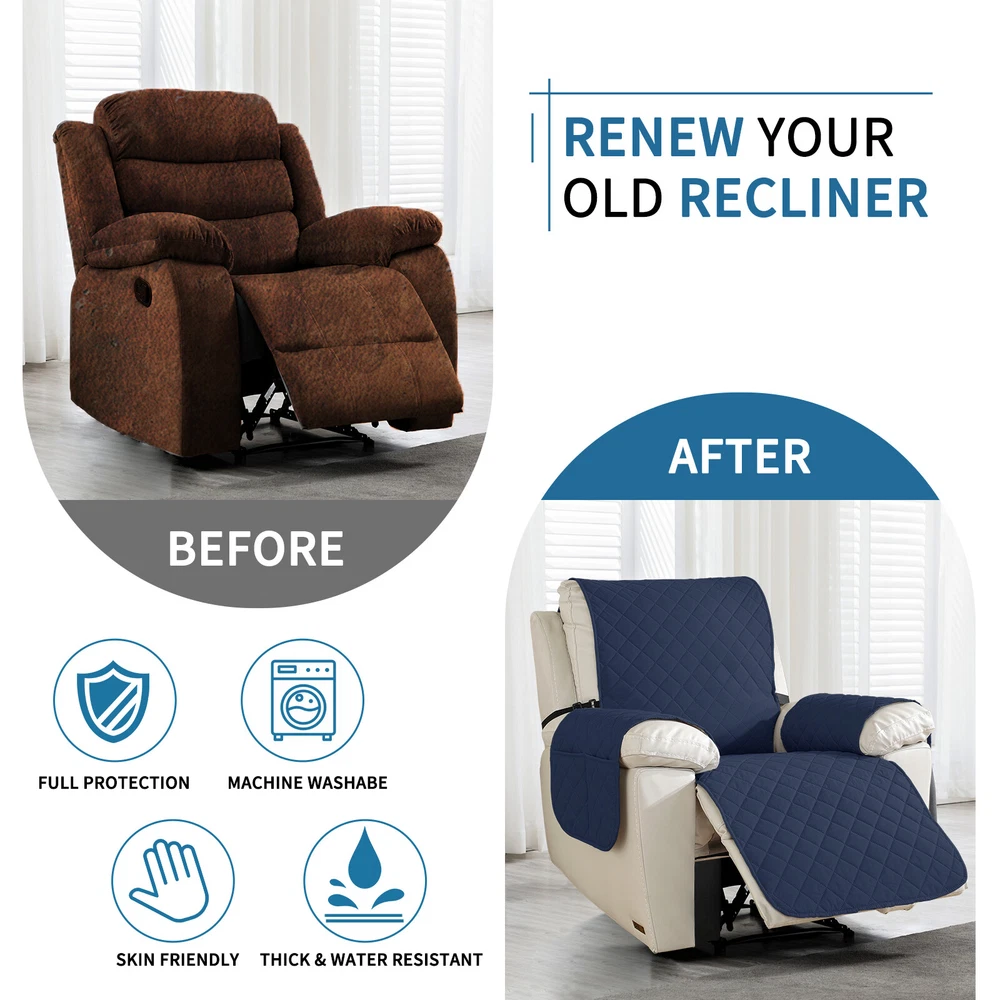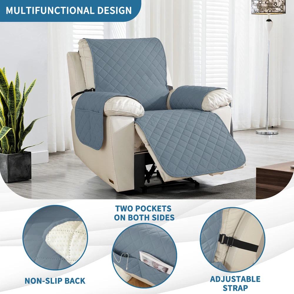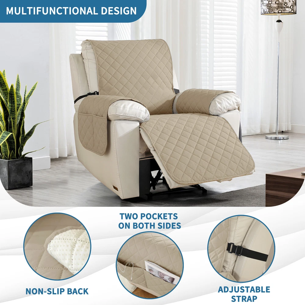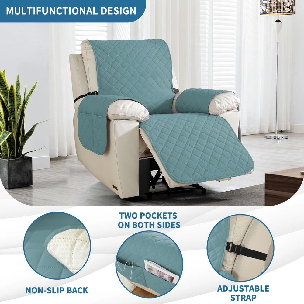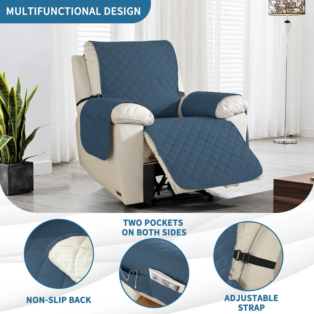 About this item 【100% WATERPROOF FABRIC】We use high-grade fabric to undergo waterproof treatment by coating a waterproof layer on the top, to ensure our recliner chair cover provides 100% guaranteed waterproof and leak-proof features. This new waterproof feature (can be tested), is a great way to protect your sofa from any drinks, spills, daily wear and tear. Making sure your furniture are clean at all times. 【HIGH QUALITY MATERIAL】 reclining chair cover are made of choiceness material, quilted from 5 layers of durable fabric, and the inner-layer is filled with soft texture fabric to make it more comfortable, soft, durable and strong, it would be a great choice for homes with kids and pets. 【REDUCE SLIP-OFF CONCEPT】Reduce movement around! 1. Solid round colloid design on the back of our recliner cover; 2. Additional flexible elastic straps; 3. Two elastic bands at seat's back side and the matching buckle, to reduce the sliding of the recliner chair slipcover, even on the leather furnitures. 【DIMENSIONS GUIDE】 Small pet recliner cover fit a chair with a seat width of 20 in, see measurement guide in photos. NOTE: Please confirm the size before purchasing.(Due to some lighting reasons, the color of each display will be different, so please refer to the actual color.) 【Easy to install & Easy care】Care instruction: Hand or machine washable, wash at a temperature around 30 degrees Celsius, mild laundry detergent advice. Do not bleach. Do not iron. (Service Guarantee: If have any questions on the product, please contact us for help.)