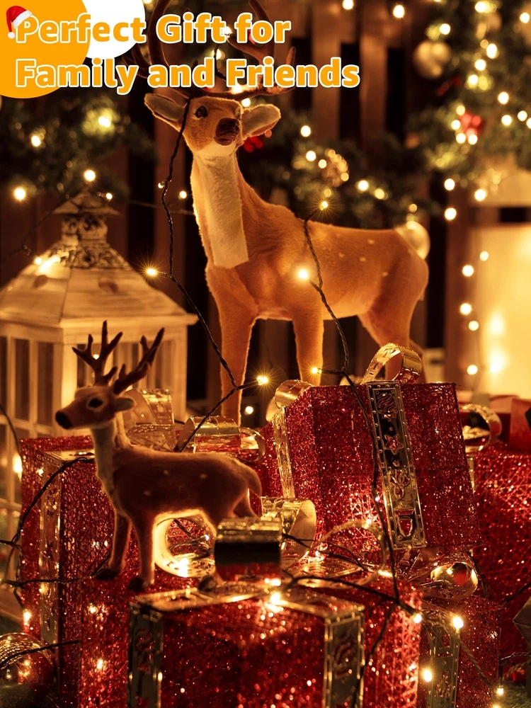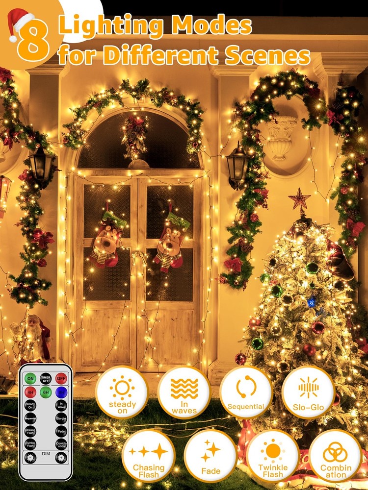 Why choose our Christmas lights for tree ? 1: The led Christmas tree lights are 1000 LED 328 FT in length and emit a soft, romantic glow that will create a cozy atmosphere in your space; The lights are extra bright and perfect for both indoor and outdoor decorations. 2: The outside christmas lights has 8 lighting modes (Steady ON, In Wave, Sequential, SLO-GLO, Chasing Flash, Fade, Twinkle Flash, Combination); With remote You can easily customize the lighting mode to match different occasions. 3: The outdoor led christmas lights features 3 timer function, (4 hrs on & 20 hrs off); (6 hrs on & 18 hrs off); (8 hrs on & 16 hrs off ); The lights also come with a built-in memory chip that will save the previous mode settings. 4: The outdoor xmas lights have 4 brightness adjustments, Range from 25%, 50%, 75%, to 100%; You can adjust the different brightness of the string fairy lights by remote control to suit different scenes. 5: The christmas led lights are certified by UL588, operate at 29V low-voltage, making them safe to touch when on; With IP44 waterproof rating, the lights remaining bright and sparkling even during extreme weather. Specification: Length: 328 FT Voltage: 30V Material: Plastic Power: 9W Dimmable: 4 Dimmable ways with Remote Control Waterproof Grade: IP44 Mode: 8 Lighting Modes Quantity of Bulbs: 1000 LED Package Included: 1 x Chrismtas String lights 1 x User Manual 1 x Remote Control Extra Long and Bright Christmas Lights: The LED outdoor Christmas lights are 1000 LED 328 FT in length and emit a soft, romantic glow that will create a cozy atmosphere in your space 8 Lighting Modes: The Christmas lights for tree has 8 lighting modes; (Steady ON, In Wave, Sequential, SLO-GLO, Chasing Flash, Fade, Twinkle Flash, Combination) Timer Memory Function: The LED Christmas lights features 3 timer function; 4 hrs on & 20 hrs off; 6 hrs on & 18 hrs off; 8 hrs on & 16 hrs off; The memory mode will save the previous settings 4 Dimmable Ways for Widely Use: The outside Christmas lights have 4 brightness adjustments range from 25%, 50%, 75%, 100% to choose Waterproof and UL Certification: The warm white Christmas lights are certified by UL588; With IP44 waterproof rating; the lights remaining bright even during extreme weather