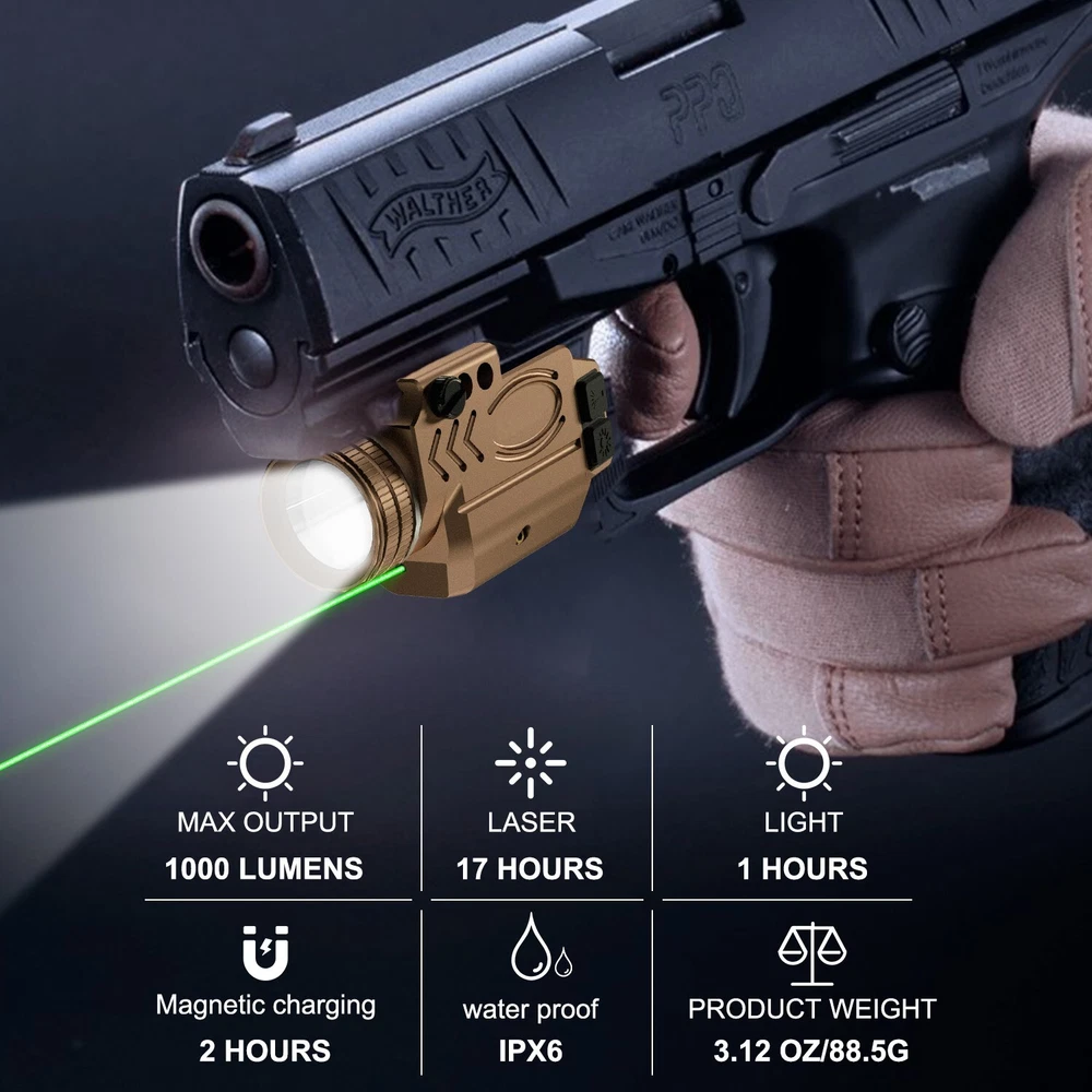 1000 Lumens Compact Rail Mount Weaponlight with Green Beam and White LED Combo, Magnetic USB Rechargeable Tactical Flashlight Green Laser Light Combo Built-in Magnetic Rechargeable Battery Detailed Parameters Item Name Green Laser Sight with 1000 Lumens Tactical Flashlight Model GL50-G Green Laser 515-520nm, Class IIIA, ≤5mW LED Light Max Output 1000 Lumens Light Source CREE 12 watts LED Continuous Laser Runtime 17 Hours Continuous LED Light Runtime 75 minutes Laser Light Combo Runtime 50 minutes Charging Voltage 4.2v - 7v Operating Temperature -10℃-- +50℃ Charging Time 2 Hours Waterproof Rate IPX6 waterproof Material Hard-oxidized aluminum alloy Weight 3.12 OZ