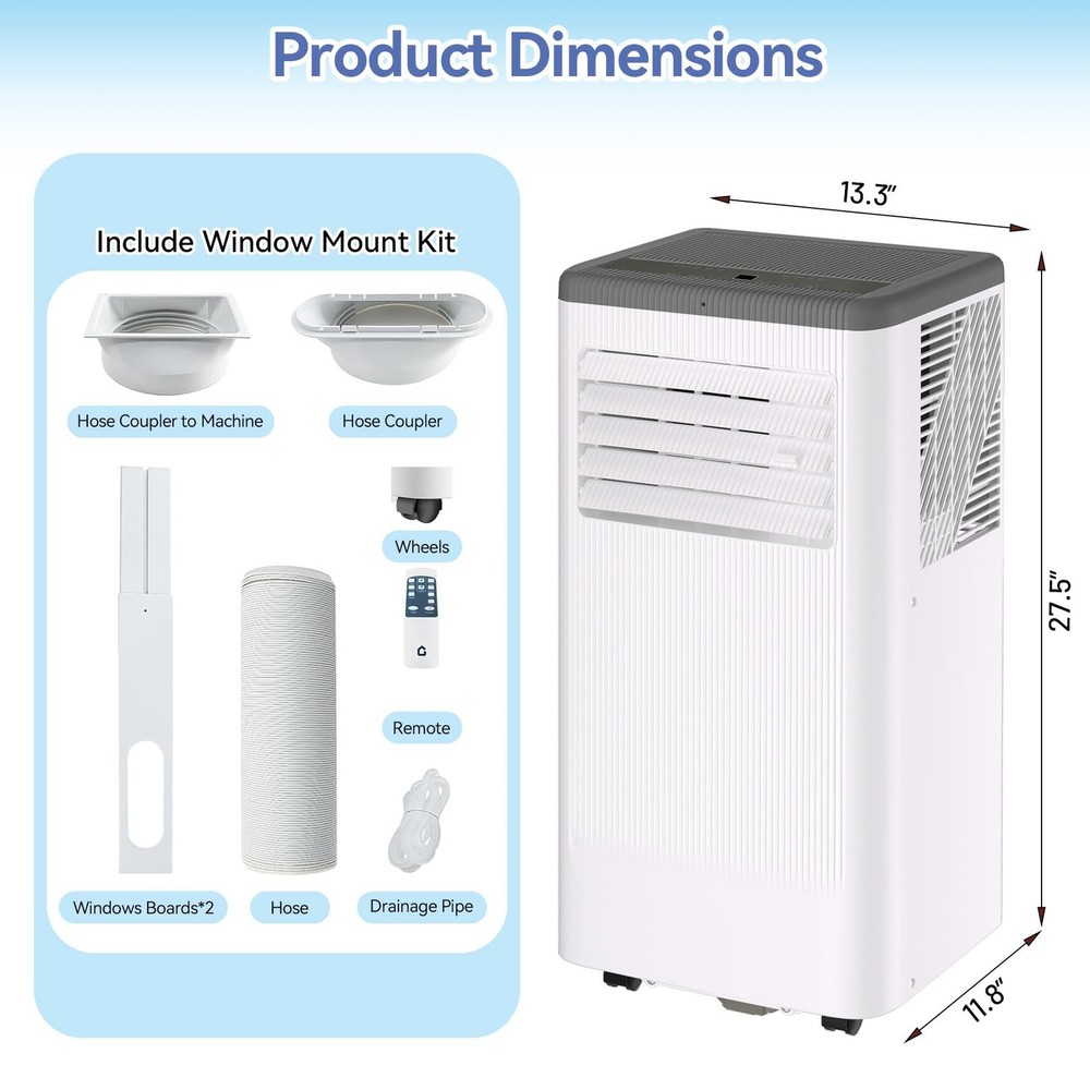 【Powerful Cooling and Quiet Operation】This portable air conditioner comes in a variety of sizes to provide efficient cooling for spaces of different sizes. A noise level of just 65 dBa provide a quiet and comfortable environment for your room. 【3-in-1 Functionality】Experience year-round comfort with three modes: cooling, fan and dry. Whether you need to cool down, circulate air or reduce humidity, this portable AC adapts to your needs. Ideal for living rooms, bedrooms, kitchens, offices, basements and more, it creates a healthy and pleasant atmosphere. 【Programmable Timer】Enjoy peaceful nights with a noise level of approximately 65dB in sleep mode. The 24-hour timer allows you to preset cooling times, ensuring energy efficiency and convenience. Wake up refreshed in a cool, comfortable space tailored to your schedule. 【Portable & Easy to Assemble】Designed for hassle-free mobility, this AC unit features 360° wheels and side handles for smooth movement between rooms. The included window sealing kit and exhaust hose make installation quick and easy, fitting most vertical and horizontal windows. Perfect for renters or anyone seeking a flexible cooling solution. 【User-Friendly Design】Equipped with an LED display and a remote control (up to 17 ft range), this air conditioner offers effortless operation. Adjust modes and temperature settings from your couch or bed, ensuring personalized comfort. Its self-evaporating system enhances efficiency, making it simple to use and maintain.
