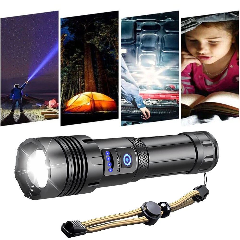 Feature: High Brightness & Long Distance Lighting: This white LED spotlight for long distance lighting is far different from ordinary torches, because it's much brighter than them with luminance of up to 1000000 Lumens, and its lighting range can reach about 3000 Meters, while others only have about 500 meters. 7 Gears: There are 7 work modes for you to switch freely, meeting your different requirements of lighting. COB Side Light: Double light source from different directions make the outdoor environment brighter and safer. More importantly, the COB side light can work as a red warning light. IPX5 Waterproof: Waterproof level up to IPX5 plus the flashlight body made of quality splash-proof aluminum alloy ensure that it can be used in rains, suitable for outdoors. Specification: Type: LED Flashlight Material: aluminum alloy Battery Life (Bright light): 4-8 hours Charging Method: Type-C Waterproof Grade: IPX5 Size: 17*4.3*3.5cm Gears: 7 gears (strong light, medium light, flash light, cob strong light, cob weak light, cob red light, cob red flash light, double click the button to turn on cob light) Fixed Focus: telescopic ZOOM Conversion Method: button Package Include: 1 x LED Flashlight 1 x Type-C Cable 1 x Built-in Battery