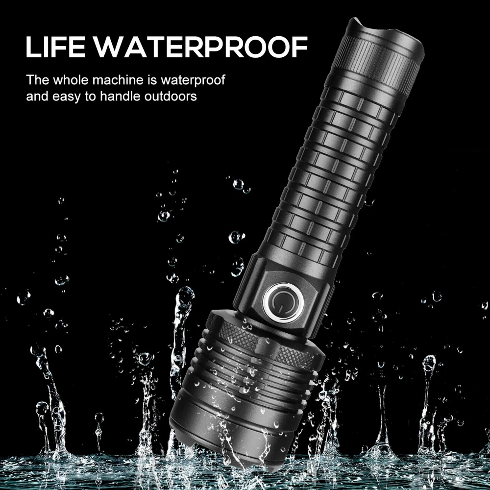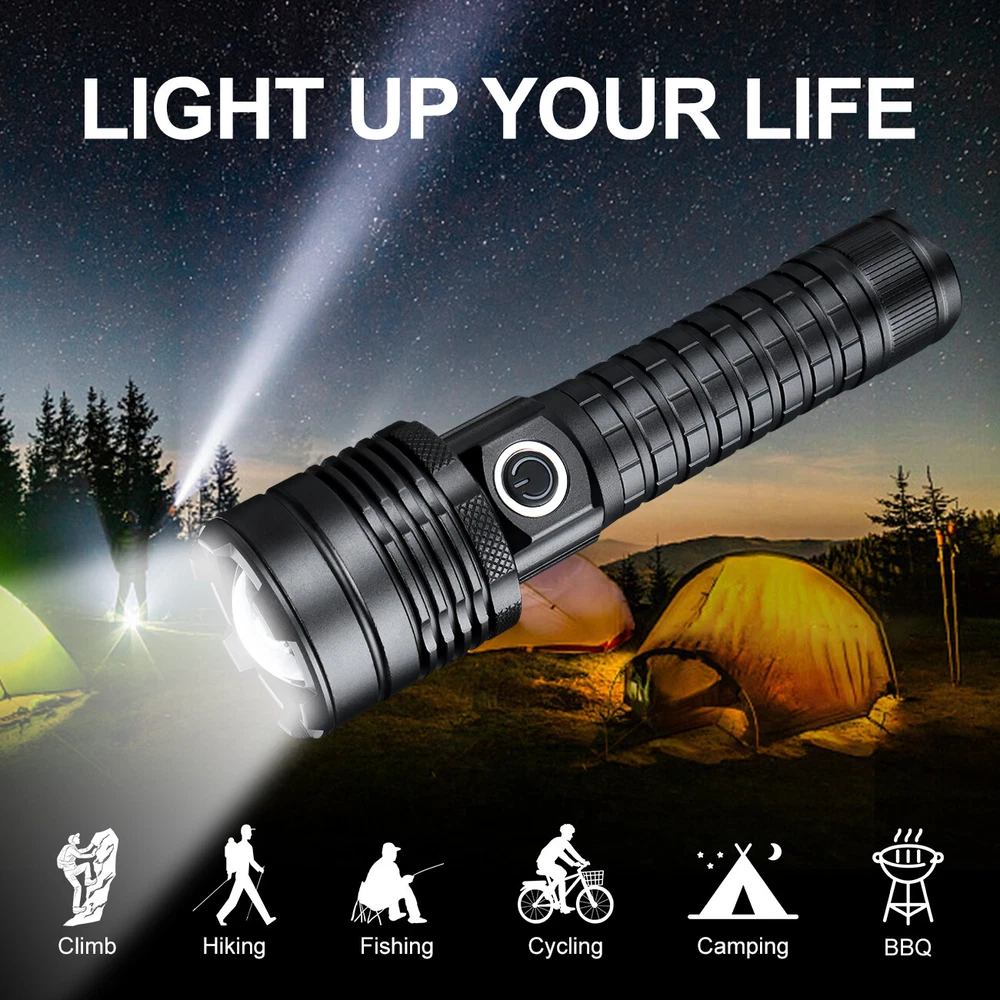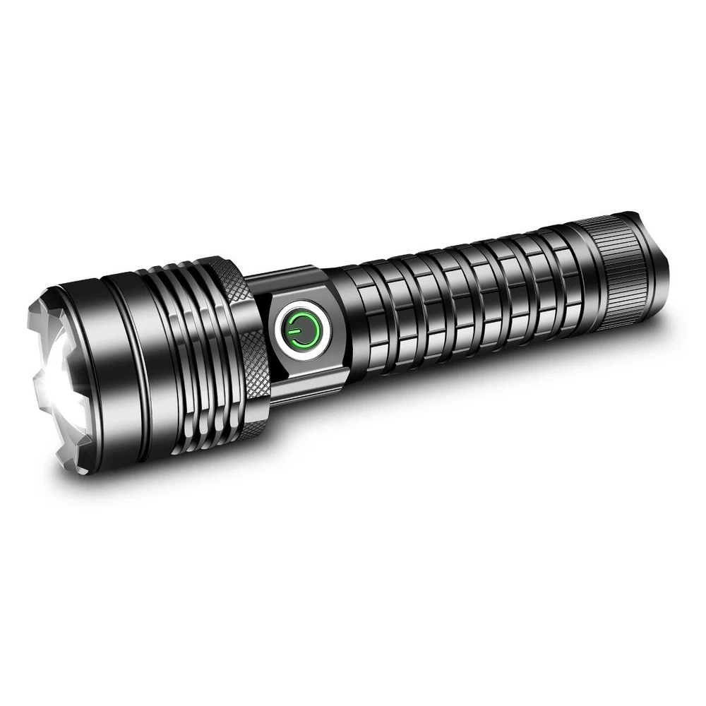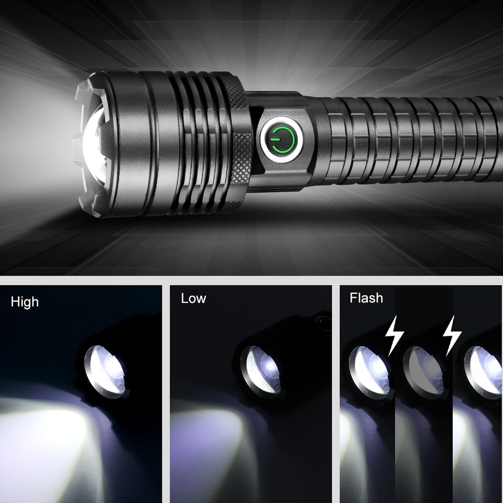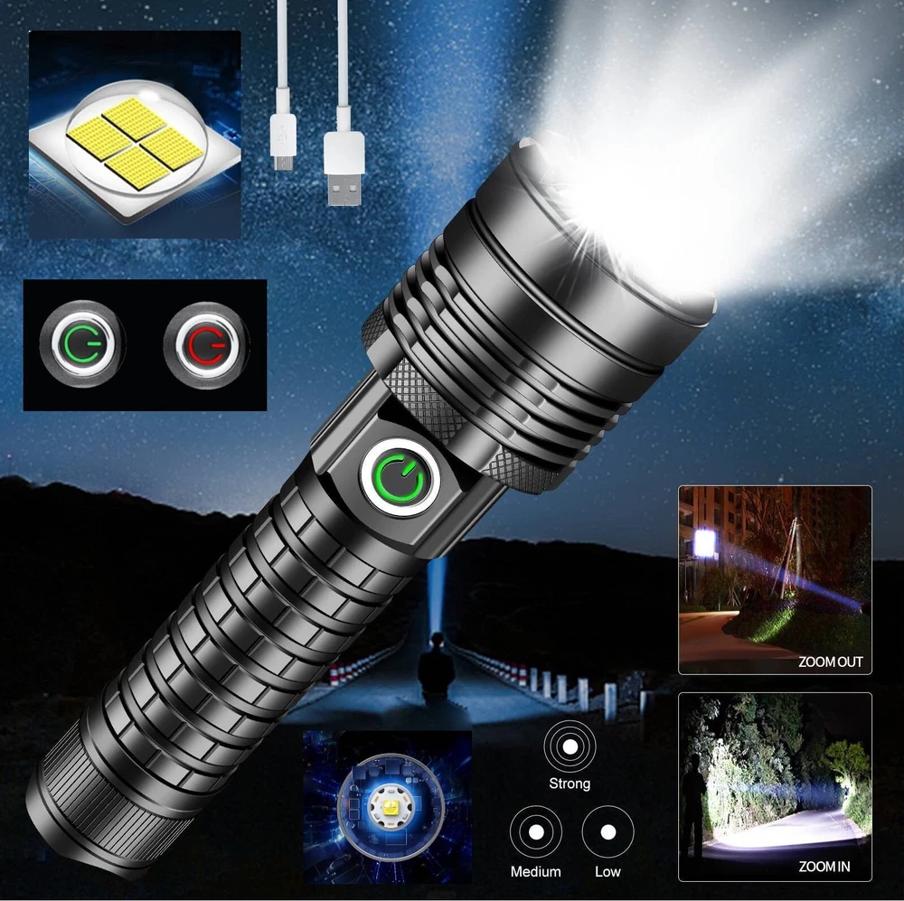 1000000LM Super Bright LED Flashlight Rechargeable USB Working Torch Zoomable Not Include battery!!! Not Include charger!!! LED Flashlight Features: XHP60 Led Flashlight 3 Light Working Modes Smart Indicating System Using advanced LED chip. XHP60 LED flashlight is brighter than other flashlight and easily lights up your entire back yard, never lets you caught in the dark.Light your way forward. Simple and Classic.Simply zooming this flashlight in or out for a spot light or as flood light; It features only 3 light modes (High / Low / Strobe) which effectively reduces the trouble of switching 5 modes. All for the best using experience! Smart charging status indicator , when the battery is charging, the LED indicator is RED, after fully charged, the indicator turns GREEN,Micro usb for laptop, power bank, plus socket, computer Zoomable & Ajustable Focus IPX65 Waterproof Widely Application Adjustable Focus by zoom in and zoom out the flashlight. Zoom in the flashlight can get more wider beam and bright wider area.Zoom out the flashlight can get narrow beam and bright further. Pocket-friendly, 5.94in x 1.65in (L x D), 6.0 ounces; Anti-slip knurling and wrist strap enable a firm grip in your hand IPX65 waterproof rating can protect your torch against splashing water from all angles This is the best flashlight tool for working, fishing, camping and outdoor activity etc. Come with Strobe Light and SOS function light, suitable for emergencies, power failure, circuit maintenance car breakdowns. Specification: Type LED Flashlight Rechargeable USB Product color Black Material Aluminum alloy Gear 3 modes (strong-weak-flash) Power Source 1*3.7v rechargeable battery(not include) Charging mode Take out the battery for external charging, or charge with USB Type-C data cable Zoom Telescopic zoom Note: Battery is not included!!! Package Includes: 1 x LED Flashlight USB Rechargeable (Without Batteries) On Jan 11, 2025 at 14:01:33 PST, seller added the following information: