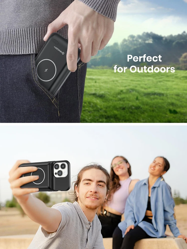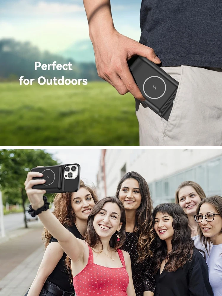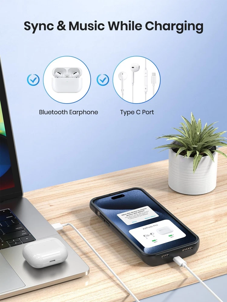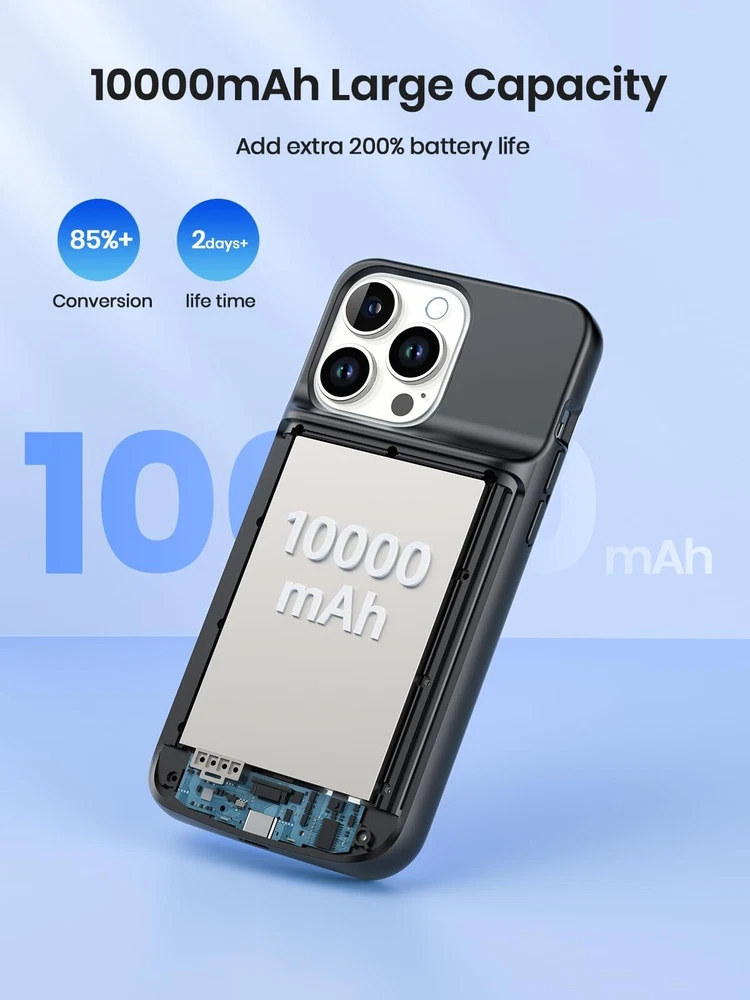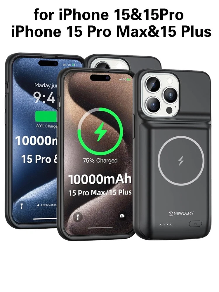【Compatible Devices】The battery case only fits for iPhone 15 Pro Max, iPhone 15 Plus. Doesn't fit for iPhone 15, iPhone 15 Pro, iPhone 14 Plus, iPhone 14 Pro Max, iPhone 13 Pro Max and other iPhone brand phone. Please check your phone model before buying. The charger case built-in TYPE C port. 【10000mAh High Capacity】The iPhone 15 plus charging case built-in 10000mAh Lithium-ion battery, powerfully extended 200% battery life to your phone, make your phone alive a whole day. It has passed CE, FC and RoHS certification and can be taken on board the plane. Perfect for daily heavy user, business trip or travel 【Magnetic & Qi Wireless & Wired Charging】 The extended battery pack with built-in magnetic module, can be charged with a wireless charger or mag safe charger for a quick and convenient wireless charging experience. Simultaneously charge your iPhone 15 pro max and the charger case via USB C cable. Your phone will be fully charged first then the charging case. 【Easy to Use&Convenient】The iPhone 15 Pro Max charging case makes installation and carry much easier and safer. Equipped with power level indicator LED lights, just press the button for 3 seconds to start or stop charging. 4 LED battery level indicators that let you know how much power you have (0--25%--50%--75%--100%). Product Specifications 1. Input: 5V/1.5A 2. Output: 5V/1.0A 3. Dimensions: 6.5"*3.28"*0.93" 4. Weight: 7.05oz 5. Charging Port: USB C What You Get 1*iPhone 15 Pro Max Battery Case 1*User Manual Important Note: 1. Support Qi wireless charging, magnetic wireless charging, Apple pay. 2. Access to music or calling with Bluetooth earphone while charging your iPhone 15 Pro Max/iPhone 15 Plus.