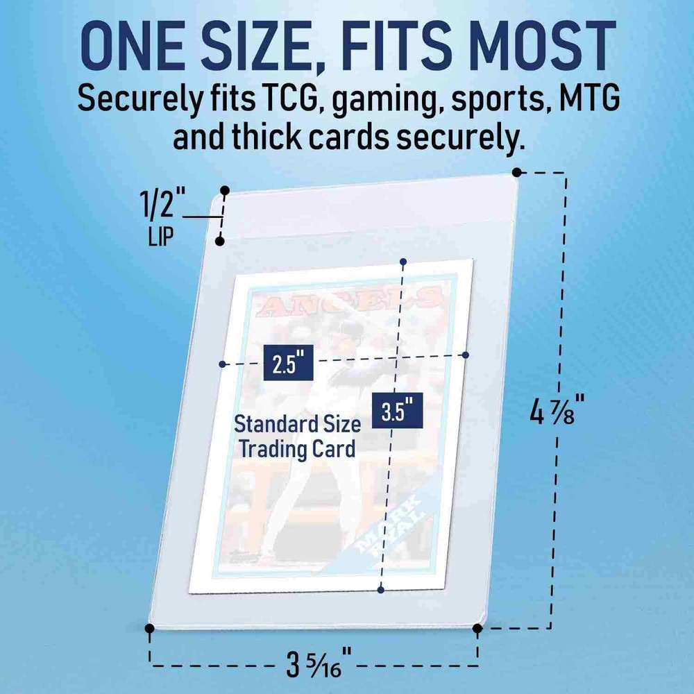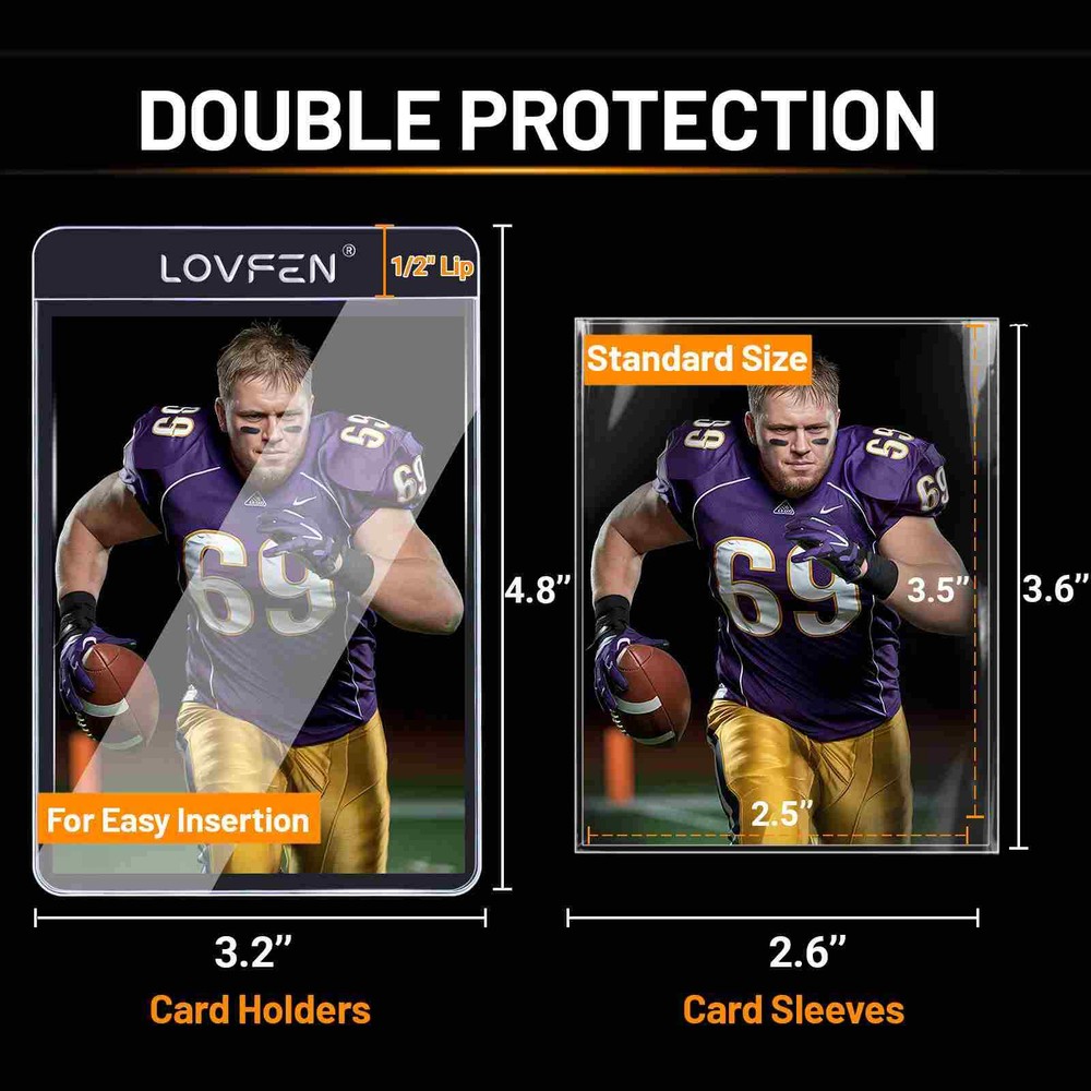 Protect,Store,Display your best-loved,unique,prized cards Secure your collection with confidence. Shield them from dust, moisture, and wear. These top loaders are made of clear material and can accommodate cards with a thickness of up to 35 Pt. Perfect for storing and displaying your valuable sports trading cards. Compatible with standard card sizes and are ideal for protecting your cards from dust, dirt, and fingerprints. Package Includes: 1000ct card holders and 1000ct sleeves Protect,Store,Display your best-loved,unique,prized cards Secure your collection with confidence. Shield them from dust, moisture, and wear. The best graded card submission sleeve in the market. These deluxe holders are a real time saver and offer sturdy protection. They work great when mailing in your cards for grading. Our Semi-Rigid Card Holders are made from rigid, stationary-grade PVC. It contains no plasticizers or stearates. Our high quality PVC does not migrate and will not harm your cards. Its slightly oversized for easy insertion and removal of standard sports trading cards. This product is used by Professional Sports Authenticator (PSA) and most PSA dealers for card submissions. The 1/2” Lip design Easy for cards Insertion and Removal, ensuring a smooth and hassle-free experience for collectors. Card Holder Size 3 5/16" x 4 7/8" (including 1/2" Lip) (LXW 84x124mm) Sleeves Size 66×91mm Holds 1 standard-sized 35pt trading card perfectly suited for MTG, TCG, Baseball Cards, Football Cards, Sports Cards and Game Cards. Package Includes: 1000ct card holders and 1000ct sleeves Payment Shipping details Return policy About us Contact us Payment We accept Paypal,Google Pay,VISA,Master Card,American Express and Discover. Shipping details We usually ship from US within 1-3 business days with tracking number by USPS or UPS. Return policy 30 days returns. Seller pays for return shipping. About us We are a trustworthy and professional eBay seller. Contact us If any problems about our product and service,contact us for free at any time via eBay messages. Brand LOVFEN Card Holder Type Semi-Rigid Holder Color Clear Compatible Card Size Standard Compatible Card Thickness 35 Pt. Country/Region of Manufacture China Features Acid-Free, UV Protection Material Rigid PVC Number of Toploaders/Card Holders 1000 Type Card Holder Year Manufactured 2025 Item Length 3 5/16 in Item Height 4 7/8 in