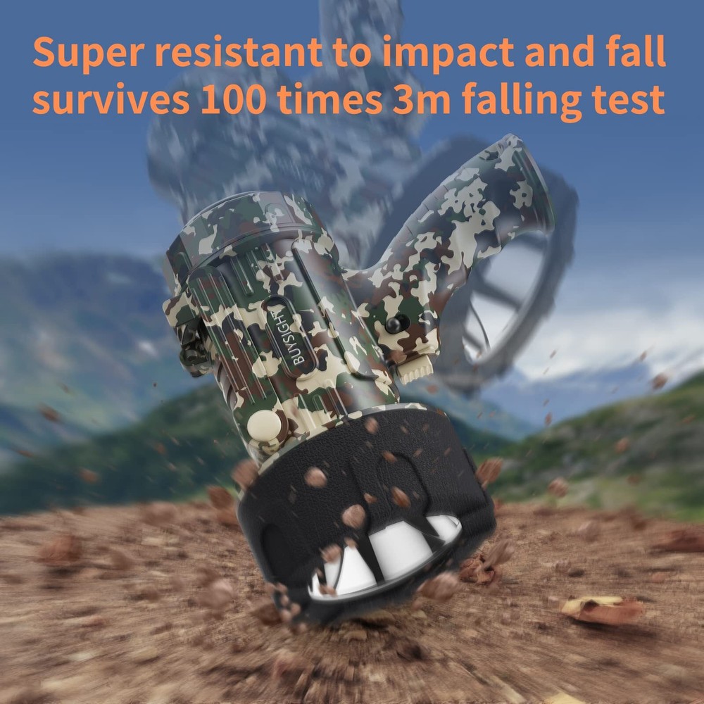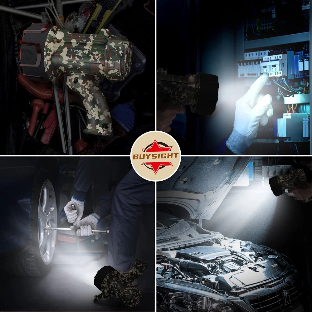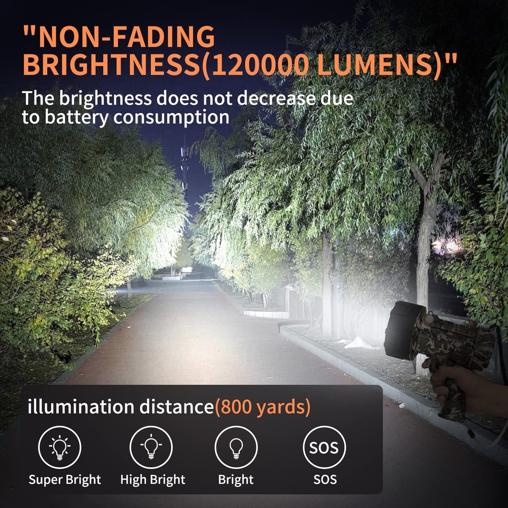🌞Powerful spotlight you met . Super Bright 1000,000 lumens Powerful XHP-70.2 LED Beads with three brightness settings: High (1000,000 lumens), Mediun(500,000 lumens) Low (200,000 lumens) and SOS Mode. At 1000,000 lumens. 550 yards illumination range significantly brighter than many higher-priced spotlights or flashlights. Removable filter enables both white and red light settings. White setting is for general illumination and red is perfect for searching animals. 🔋Rechargeable spotlight flashlight with serious lasting power - UP TO 20 HOURS. Stop searching for batteries that are never there when you need them.Made with 3 built-in ,long-lasting, rechargeable batteries with 10000 mAh storage power. A full charge made to last longer than virtually any other flashlight - from 10 hours at 1000,000 lumens to a whopping 20 hours at 200,000 lumens. Universal USB C charging port makes it easy to recharge in both car and home (Cable included). 🔧4 Years Guarantee & 24-Hrs online After-sale Service: rechargeable searchlights are tested to be up to the standard of 1000 cycles Battery life& 100,000 hours bead life. We have managed to reduce the rate of faulty items considerably, but not yet completely. We feel very bad about it and are actively working on solutions. If you receive a defective product, contact us and we will immediately send you a replacement unit without return even out of 30 days. ☔Impact resistant & Waterproof & Never Sink. Made from tough, impact resistant ABS and polystyrene to protect the system from drops and bumps while in use. Should you accidentally drop it in water while hiking, camping, sailing or hunting, no worries - it's waterproof up to 3ft deep, and floats to the surface of the water so it's easy to retrieve. 💪Upgraded larger size& lighter weigh design, more in line with the use of American habits, ergonomic design allows you to hold a long time not tired . Overpowering camouflage colored shell takes more colors to our hiking trip. Adjustable bracket equipped makes it a work light anytime, anywhere to free your hands. It’s also a large capacity power bank when you need.