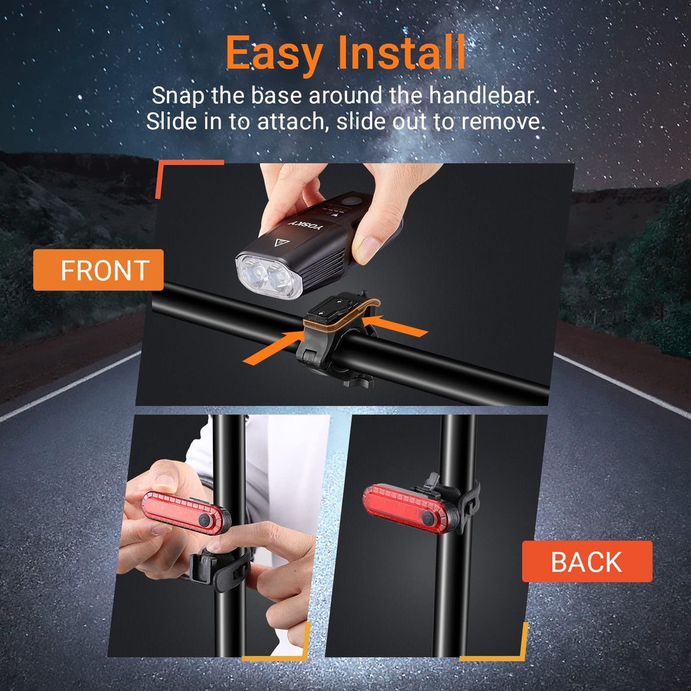 ⚡ SUPER BRIGHT AND SAFETY RIDING - The bike headlight use two XM-L2 LED beads,up to 1000 Lumens which is highly visiable even in dark outdoor,illuminate a pretty wide range,the angle up to 160°.The free bonus rear light is also bright and call attention to other riders and car drivers.Waterproof bike light set are not for Night Only,around 80% of cycling accidents occur in daylight!! ⚡ 4000mah Battery & USB Recharge: Our bike front light has a 4000mA rechargeable battery that can safely and quickly charge devices with USB port, such as PC, power bank, etc. The duration of bicycle front light: high brightness - 3.5h, medium - 5.5h, low - 7h. With an intelligent design to remember the remaining battery. The duration of bike rear light: constant brightness 4h, flashing 12h, fast flashing 6 hours, slow flashing 1h. ⚡ DURABLE AND WATER RESISTANT - Our bike headlight choose air aluminum alloy materials. durable more than you thought. also run long time, in high light run 4 hours, in middle light in 6 hours, in low light run 8 hours.Water resistant rated even to IPX5,which means protected against splashing water from any angle.It's best choice for rider to adventure or night practice, no matter what whether. ⚡ VERSATILE AND EASY TO INSTALL - Installs and detaches in under 15 seconds with NO tools required. bike light for night riding, camping, walking, home or office power failure ect. The bike light front and back is so bright that backs off darkness. ⚡ 100% SATISFACTION GURANTEE - Feel free to contact us, if you received is defective or you are not completely satisfied with our bike light set, we will reply you and solve it as soon as possible,hope have a nice shopping experience.