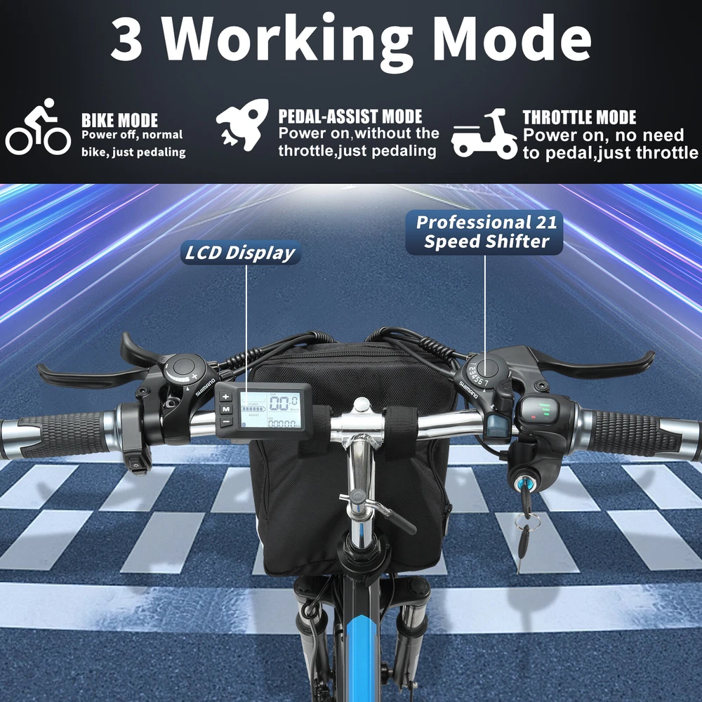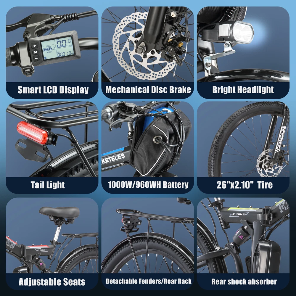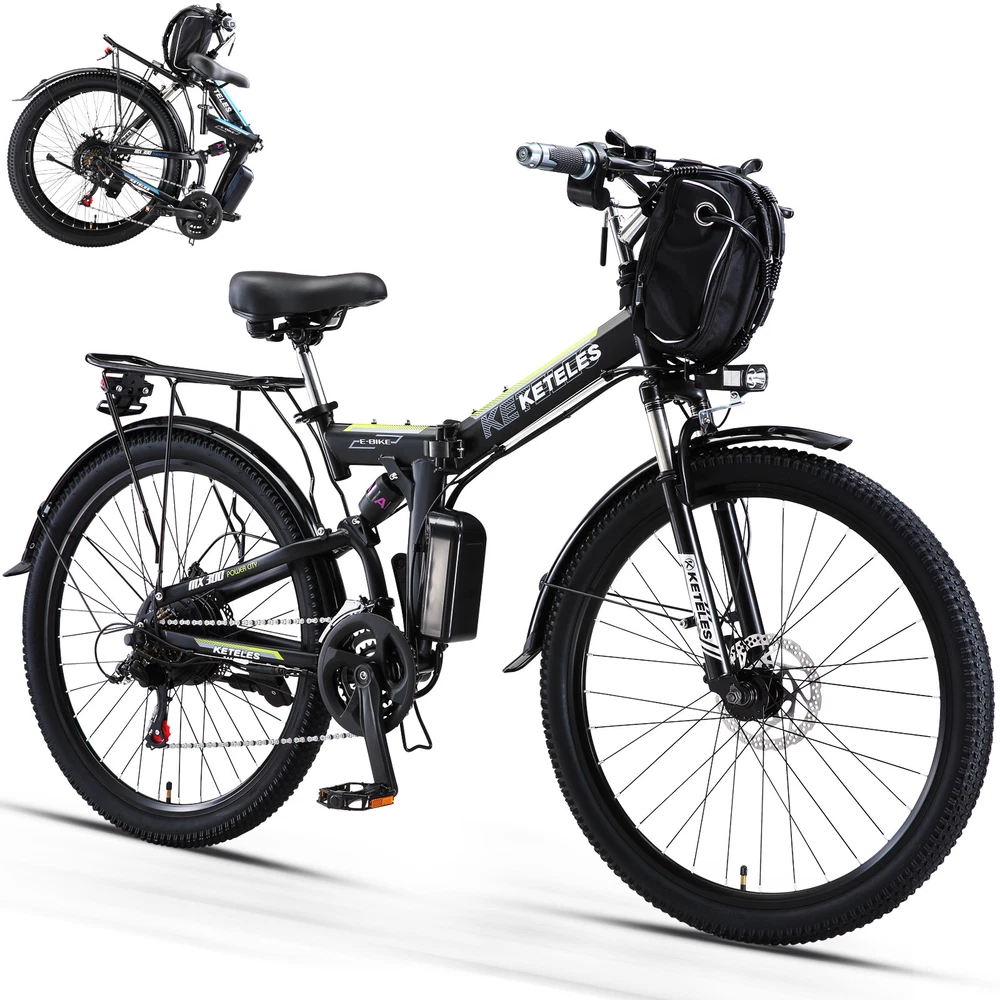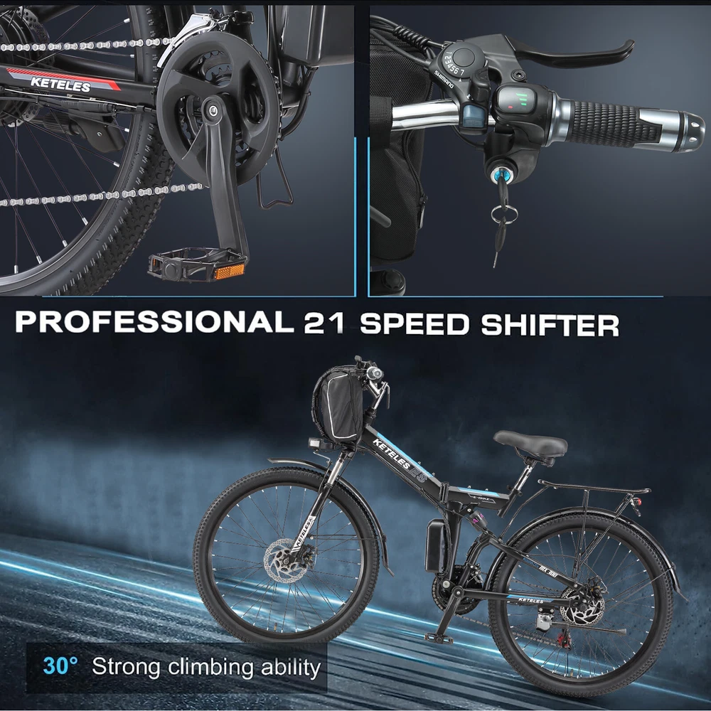 1000W Electric Bicycle KETELES 26" folding Mountain Bike 48V/20Ah for Adults US About this item: *【1000W POWERFUL MOTOR & REMOVABLE BATTERY】 ---Cityscape Electric Bike is equipped with a 1000W brushless motor, provide enough power for your daily outings.Up to 22mph Top Speed. 48V 960WH large removable battery is strong enough for these activities. The ebike can ride 50 miles by pedal assist after charging 4~5 hours, long battery life.And BMS protection in an IPX4 waterproof casing, mileage anxiety is a thing of the past. Embrace every journey with confidence. *【3 WORKING MODES】 --- KETELES Electric Bike is a powerful and cost-effective folding e-bike. 1. Pedal Assist Mode 2. Fully Electric Mode 3. Pedal Mode. Three riding modes switch easily for enjoying a long time travel, and also exercise. * 【 21-SPEEDS GEAR FLEXIBILITY】 --- This KETELES folding ebike has 21-speed gears. Seamlessly adapt to any terrain, from the bustling city streets to the rugged mountain trails. Embrace the freedom to explore and unleash your inner thrill-seeker. * 【COMFORT MEETS STYLE & RICH CONFIGURATION】 ---KETELES Electric Bike made of high-strength carbon steel frame and superior bike paint. Ergonomic and stylish step-thru design, enlarged comfortable seat.LED Headlights and tail light for safe riding.Please note every new bike has gone through road testing before packing, there may be some dust on the tires. * 【HASSLE-FREE SETUP & STELLAR SUPPORT 】 --- Jumpstart your biking adventure with KETELES's 90% pre-assembled e-bike. We stand by our commitment to quality and your satisfaction with a one-year warranty and dedicated 24-hour customer service. Any questions or needs? Reach out, and we'll ensure your KETELES experience is nothing short of exceptional. Specification: Bike Type E-Folding Bike Age Range Adult Brand KETELES Number of Speeds 21 Color Black-Blue/Black-Green/Black-Red Wheel Size 26 Inches Brake Style Disc Brake Mechanical Brake with Power Cut-off Feature Throttle Twist Throttle on the Right side of Handlebar Display Smart LCD display that shows speed, battery status, pedal assist level, etc. Range Fully Electric Mode Range: around 30~40km Pedal Assist Mode Range: around 50~60km Voltage 48 Volts (DC) Model Name MX300 Wattage 1000 watts Item Weight 26kg Maximum Weight Recommendation 330LBS Warranty 1 year Suggested Users Unisex-adult Charge time 4-5 hours Warm Tip ! 1.Please install the bicycle according to the instructions after receiving it. If you encounter any problems during installation, please feel free to contact us. If necessary, we can also send you installation demonstration videos to help you reduce the problems encountered during installation. 2.New electric bike passes road test before packing, therefore dust on the tires is inevitable. 3.Upon arrival, mark down the serial number, which locates on the middle axle tube, and register to vehicle management center. It is necessary to track your ebike while preventing loss. 4.Please be aware of the height of electric bike. Package Included: *1 x Electric bicycle * 1 x Headlight *2 x Fenders *1 x Charger *1 x Battery *1 x Tool kit *8 x Tools *2 x Pedals *1 x Taillight *1 x Rear rack *1 x Air cylinder *1 x Lock Note: Our products have been certified under UL2849 safety standards. Payment Delivery details Terms of sales About us Contact us Payment We accept Credit Card, Debit Card and eCheck payments through Payoneer. Delivery details 1. Thank you very much for purchasing our products. 2. All the items double checked well packed bafore shipping. 3. Itme will be dispatchec within 2 business day(not includes the holiday and weekend) after your payment. 4. We usually use Fedex or UPs logistics to transport your package, and the delivery time would be about 5-7 business days. 5. When you have completed your payment, please leave your correct phone number and address, you could contact us by courier for any quesiton. And keep your phone open, prevent the delivery staff contacting you and causing the package to be returned. Terms of sales We guarantee 100% customer satisfaction. We check all items before sending out, if you received an broken/ defective item, please take photos and send to us immediately. We only accept those case reported within 30 days. Please keep all package material, return items must be in good condition. About us Keteles was specialized in producing bicycle, mountain bike, electric bikes, folding bikes, and other bicycle products. Our products are characterized by elegant appearance, superior quality, assorted specification, novel design, safety and reliability. With a complete set of facility, a perfect quality insurance system and an advanced testing method, we have experienced designers, engineers, management personnel and workers. We always stress on product quality and new product development. We strictly stick to tenet of "emphasizing on quality, stressing on credit, seeking for little profit and pursuing for development". We have gained a good reputation among customers at home and abroad. With our strict quality management, reliable credit, powerful strength and comprehensive marketing network, we sincerely welcome customers to cooperate with us. We would like to accompany you to create a brilliant future. Contact us Our goal is to make sure you are a happy buyer and have a pleasant shopping with us. Please leave us positive feedback and 5 stars rate if you are happy with our item and service. Please contact us before leaving any 1 or 2 ratings, neutral or negative feedback or open any dispute. We understand the concerns and frustrations you might have, and will do our endeavor to resolve the issues. Please give us the opportunity to resolve any problem. We thank you for your effort to make this sale and purchase experience a happy one! If you have any question about us, feel free to contact us, Please allow 24 hours for a message reply! We are highly appreciated your Positive feedback, we will try 