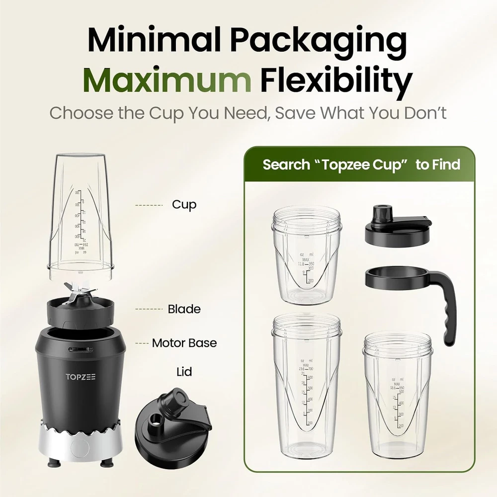 Blender for Smoothies, 1000W Slushie Machine, Bullet Blenders Black Product Details Brand: topzee Color: Black Special Feature: Lightweight Capacity: 1.5 Pounds Product Dimensions: 11"D x 10"W x 6.4"H Included Components: Blender Style: Countertop Blenders Recommended Uses For Product: Ice Crush Power Source: ac Number of Speeds: 20500 Voltage: 120 Item Weight: 5.92 pounds Country of Origin: China Item model number: BP100 Pro+ MaterialWattage: Acrylonitrile Butadiene Styrene1000 watts Is Dishwasher SafeBlade Material: YesStainless Steel 【Powerful Ice Crushing】TOPZEE 1000W powerful motor (Max 1200W) to make healthy nutrient fruit smoothie sand ice drinks what your taste. Provide a cool feeling in the scorching summer days. 【Excellent Milkshake Taste】TOPZEE 24oz portable blender cup can easily accommodate can easily make fresh fruit juice, milkshakes, and healthy foods, which helps maintain a healthy diet. 【Multi-Function Blender】TOPZEE personal blender is equipped with stainless steel 6-lades, which can easily crush ice cubes. Very suitable for mixing milkshakes, juices, milkshakes, sauces, jams, baby food. 【Easy Dishwasher Cleaning】The smoothie blender cups and to-go lids are dishwasher safe can be easily placed in the dishwasher to release your hands when you get home from work. 【Work & Life Companion】Whether it's fitness, rock climbing, swimming, rowing, cycling, golf and strolling or other outdoor activities, easy go cup is the ideal drinking companion. ADDITIONAL SERVICES 1: TOPZEE bullet blender provides 3 years of whole machine service&1 year refund for man-made damages.Your satisfaction is the driving force for our progress. ADDITIONAL SERVICES 2: TOPZEE blender provides 5 years accessories service. Smoothie Blender(Sunshine Team) R&D, CS, LOG and TZ BRAND team are dedicated to serving you. TOPZEE Customer Service Team 1 year refund for man-made damages TOPZEE Customer Service Team 3 year parts exchange service TOPZEE Customer Service Team-3 year non-human damage exchange service TOPZEE Customer Service Team 5 years of maintenance service TOPZEE service throughout the year (365 days), resolving customer issues within 3 hours