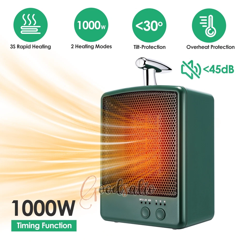 1000W Electric Portable Mini Heater Small Ceramic Heating Fan Home Office Floor ★SPECIAL TIPS: √ Ship within 24 hours Via USPS from NJ ,USA √ 100% New & Excellent Quality √ Professional Customer Service √ Strictly QC, Each set was fully tested before shipping √ Offer delivery with Tracking Number Feature: -- 3S Quick Heating: The heater is made of flame-retardant ABS, and also adopts PTC ceramic heating technology, can quickly heat up within 3 seconds, releasing a lot of heat to help you get rid of the cold quickly. -- Timing Function: The heater has 2 temperature levels, 500W low heat and 1000W high heat, and it also has a timing mode selection(1H/2H/4H), the timing time is 2-8 hours, you can easily adjust to get the comfortable heat you want. -- Tipping and Overheating Protection: The heat-resistant material and overheat protection function effectively reduce the risk of fire when the temperature is too high, besides, the heater will automatically shut down when it’s knocked over accidentally. -- Low Noise Mode: The working noise of the air heater is less than 45 decibels, which is quiet enough that it will not disturb your sleep, work, study and reading, at the same time, the heater has a stylish appearance and is also a good choice for interior decoration. -- Lightweight and Portable: Small size, won't take up much space, and equipped with a 4.3 feet of cord, can be placed on a table or nightstand, the comfortable handle design on the top of the heater allows you to move it anywhere. -- Wide Application: The heater helps to improve the comfort of the environment and heating needs, suitable for offices, rooms, desks, homes, bedrooms, and also a thoughtful gift for family and friends in winter. Specification: Product name: PTC ceramic heater Model: MQ-802 Colour: Black,Green Material: flame retardant ABS Rated voltage: 110V~/220V~ Rated power: 1000W Rated frequency: 50Hz Noise: 37-45dB Heating element: PTC Speed gear: second gear Timing function: 2-8 hours Operation mode: mechanical Applicable area: 21-30㎡ Heating method: 500W (low temperature); 1000W (high temperature) Support: 3 seconds fast heating; overheating protection; dumping power failure Power cord length: 1.3m/4.3ft Product size: 250*150*95mm/9.84*5.9*3.74inch Package includes: 1x Heater 1x Power Cord 1x Manual 1x Packing Box
