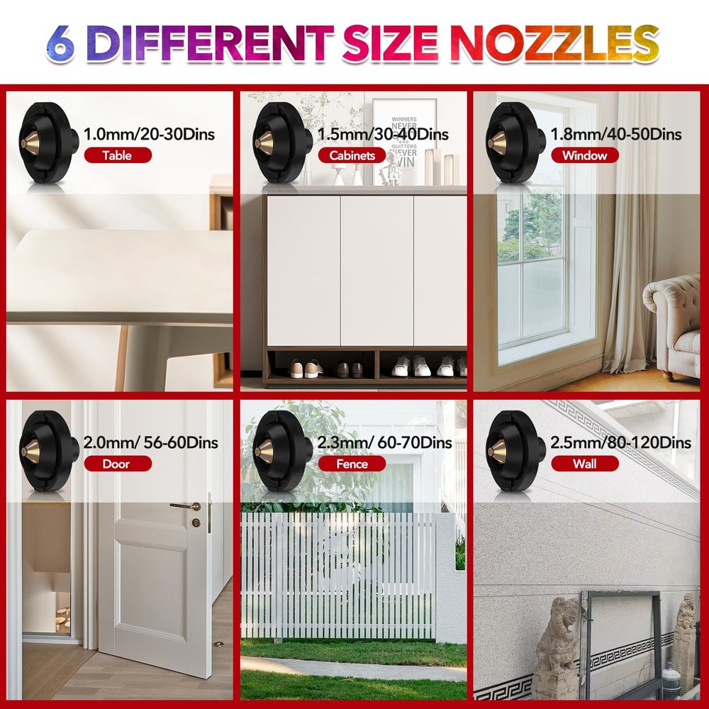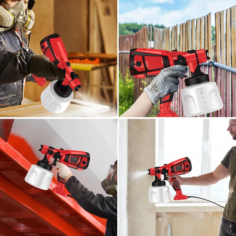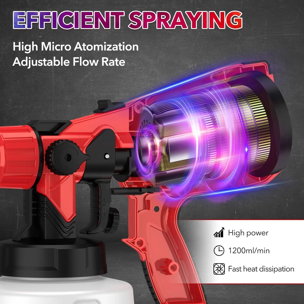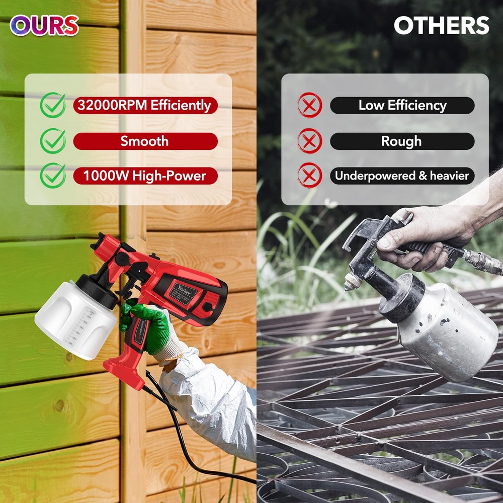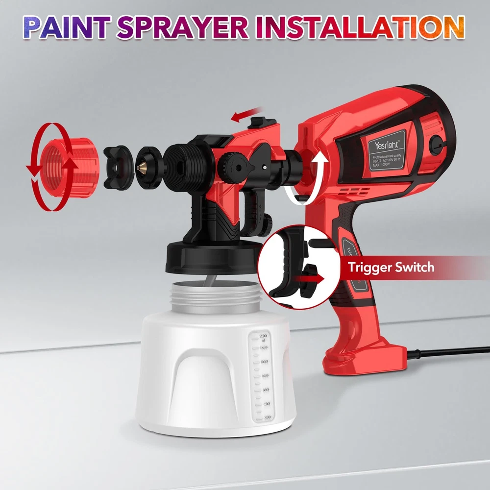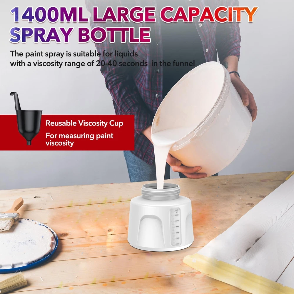 Paint Sprayer High Power Electric Spray Paint Gun High Capacity Container Easy to Clean for Furniture Cabinets Fence Walls Door Works Garden Chairs 6 NOZZLES & 3 SPRAY PATTERNS: 1000W Paint Sprayer is equipped with 6 size nozzles(1.0mm, 1.5mm, 1.8mm, 2.0mm, 2.3mm, 2.5mm), suitable for most painting projects, such as furniture, fences, walls, doors, garden tables and chairs, etc. The Spray Gun offers the flexibility to adjust between three different spray patterns: horizontal, vertical, and circular, making it suitable for a wide range of application scenarios 32000RPM ELECTRIC PAINT SPRAYER: The High Speed Cordless Paint Sprayer operates at 32000 RPM, maximum flow rate is 1,200ml/min, and comes with a large 1400ml capacity container for more efficient paint spraying, including those hard-to-reach spots where a roller simply can't go. The Electric Paint Sprayer offer a faster, more convenient alternative to rollers and brushes ADJUSTABLE FLOW CONTROL: The Portable Paint Sprayer features an adjustable spray width knob that allows you to precisely manage the spraying area and optimize paint usage for various projects. In addition, the flow control knob allows you to easily adjust the paint flow to meet a variety of spraying needs, achieve better spraying results, and have greater flexibility EASY TO USE & CLEAN: The Electric Paint Sprayer can be easily assembled with no tools, even if you are a beginner, you can easily get started after reading the manual. It is very important to clean the paint sprayer thoroughly after use, it comes with a cleaning brush and a needle to remove any hardened paint left in the nozzle, making it convenient and efficient for you to clean COMPLETE PAINT SPRAYER KIT: Paint Sprayer Kit includes 1*paint sprayer, 6*nozzles (1.0mm, 1.5mm, 1.8mm, 2.0mm, 2.3mm, 2.5mm), 1*cleaning needle, 1*cleaning brush, 1*viscosity cup, 1*paint filter, 10*paper funnels, 1*goggles, 1*gloves, 1*user manual. It has all the materials you need to get started, so that you do not need to purchase additional