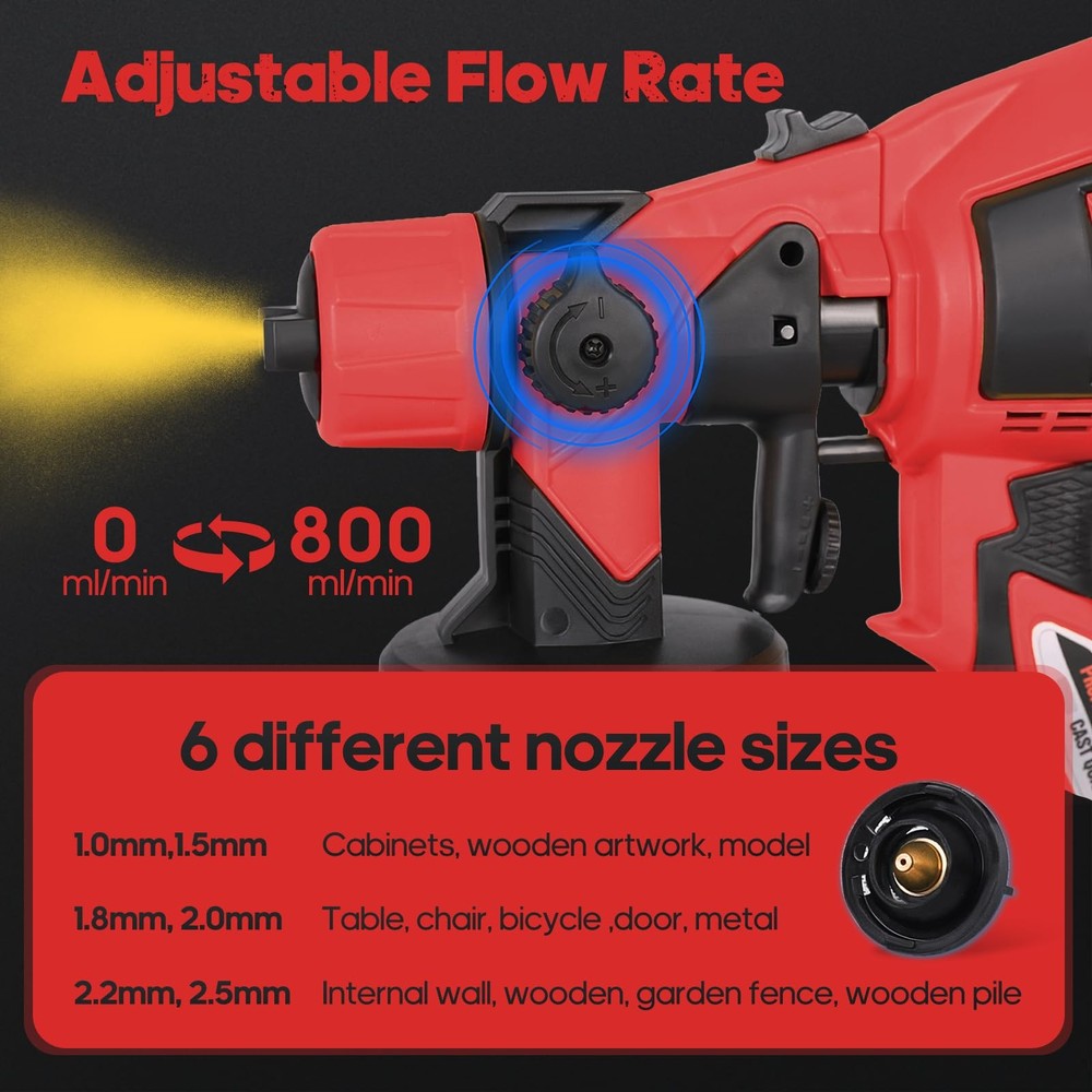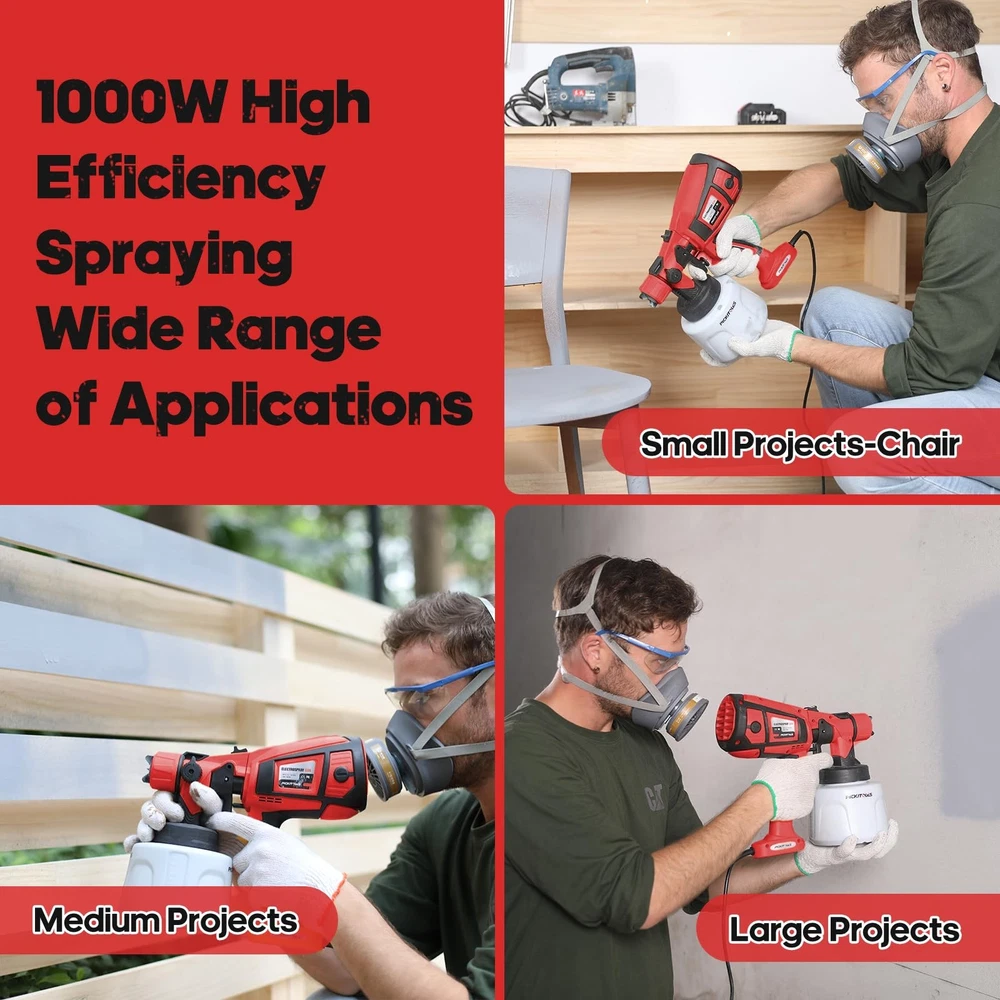 1000W Paint Sprayer HVLP Electric Spray Paint Gun for Painting with 6 Brass Nozzles & 3 Spray Patterns for House Painting Home Interior Wood Furniture Walls (Red) High-Efficiency 1000W Spray Paint Gun - Our powerful spray paint gun offers a maximum power of 1000W and a flow rate of up to 800ml/min, delivering exceptional spray results with a consistent and fine atomization compared to other paint sprayers. Versatile Nozzles and Spray Modes - Featuring 6 interchangeable nozzles and 3 adjustable spray patterns, this HVLP spray gun adapts to various painting requirements, making it the ideal tool for both detailed projects and larger surfaces. User-Friendly Design - The electric paint sprayer is equipped with an adjustable spray speed control knob, facilitating adaptation to various work requirements, ensuring comfort during use with its ergonomic grip. Additionally,included cleaning tools make maintenance a breeze. Wide Application Range - Perfect for a variety of projects, from simple furniture like tables and chairs to larger-scale tasks such as house painting or automotive refinishing, this paint sprayer for painting is designed to meet diverse painting needs efficiently. Complete Accessories and Excellent Customer Service - Your purchase includes the paint spray gun, 6x nozzles, 6x sealing rings, 5x paper funnel, 1x filter cup, 1x viscosity cup, 1x nozzle cleaning needle, 1x clean brush, 1 pair gloves 1x protective goggles and 1x clean cloth . If you encounter any issues during use, our dedicated support team is ready to assist you, ensuring a hassle-free experience with your paint sprayer.