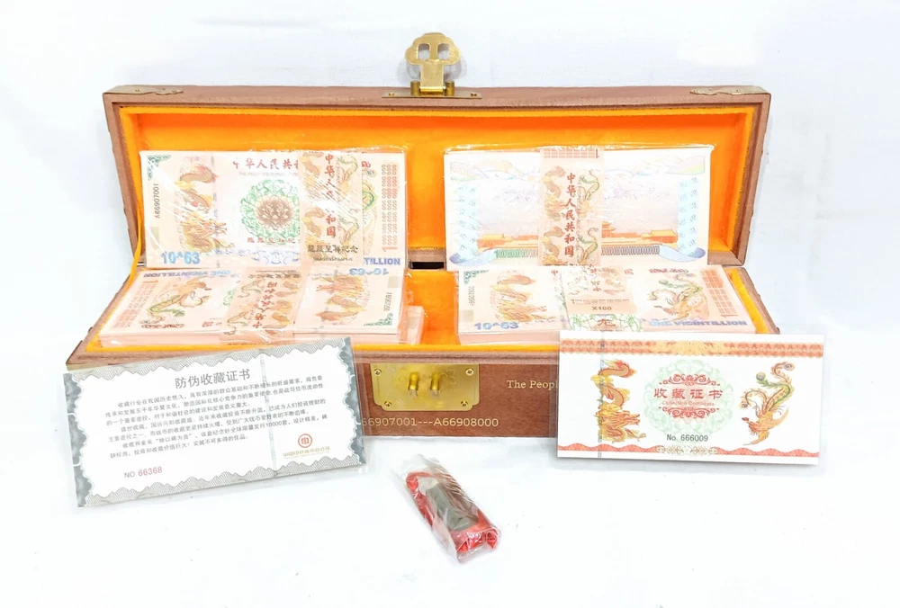 1000pcs 1 Vigintillion China Yellow Dragon Paper Note with Dragon Wood Box Collectible banknotes made by China Banknote and Minting Corp. In excellent, uncirculated condition. 10 bundles of 100 notes in Dragon Wood box. Denomination: 1 Vigintillion China Yellow Dragon Paper Note. Includes certificate of authenticity and bronze lock. Verified by a professional numismatist. Please ask any questions before purchasing. Buy with confidence! See our feedback. Stock info: I-15249anp08024 TERMS: THERE ARE NO TERMS! YOU ARE EITHER 100% HAPPY OR YOUR MONEY BACK! IF YOU HAVE ANY PROBLEMS OR CONCERNS WITH YOUR PURCHASE, PLEASE CONTACT US FIRST, BEFORE LEAVING FEEDBACK OR OPENING A CASE AGAINST US. OUR ONLY GOAL IS TO MAKE YOU HAPPY!!! WE WILL DO WHATEVER WE CAN DO TO ACCOMPLISH THAT GOAL! WE ACCEPT PAYPAL, VISA, MASTER CARD, AMERICAN EXPRESS AND DISCOVER. ABOUT US: Shores Wholesale is committed to customer service excellence, providing a variety of goods for purchase. Our operating hours are (EST): Mon - Fri: 9am to 5pm Sat: 9am to 3pm Closed Sunday If you contact us with a question after business hours, we will respond to your message at the start of the next business day.