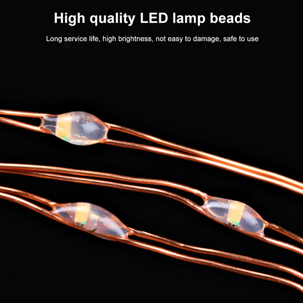 100~300LED Christmas Solar String Light Garden Yard Decor Waterproof Wire Light Description: *1. Solar Panel: 1.2v 150ma *2. LED: 5100/200/300LED *3. Ni-MH Power: 200LED: 800mAh, 100LED: 600mAh *4. Weight:130g, 190g, 200g *5. Packing Size: 14*7*9CM Features: *1. White Light: 50/100/200/300 light-emitting diode bulbs, 103 feet of high-quality silver wire and stable 360 degrees viewing angle, providing bright and white lights for your home, garden, patio, courtyard, etc. *2. 8 Lighting Modes: Including combination, fireflies flashing, waves, fading, chasing/flashing, fading slowly, twinkle/flashing and steady on, create a romantic atmosphere for your house. *3. Flexible and Durable: The copper wire can be bent to any shapes you want, and can wind around the tree trunks or terraces. The solar string lamp will not overheat after being used for many hours, which is durable and safe to use. *4. Automatic Switch: Powered by solar energy, it can work for 8 hours after being fully charged for 8-12 hours. Turns on automatically at night and turns off during the day. *5. IP44 Waterproof: Can withstand all kinds of weather including heavy rain and snow. Suitable for indoor and outdoor use without worrying about short circuit or weather damage. Operating Instructions: *1. Press the ON/OFF switch, the light string will work, and it will charge during the day (the light will not light up), and light up automatically at night. *2. Set to the required lighting mode by pressing the MODE key. Default brass wire. Note: *1. All pictures have been professionally color-corrected, but due to the different ambient light and different display equipment settings, there may be some deviation between the pictures and objects you see, please understand. *2. The data is measured manually, and there may be some deviation, but it does not affect the use. Package Includes: 1x Solar String Light Look , You may also like 30CM Meteor Shower Rain Tubes LED Light for Christmas Garden Yard Decor Outdoor 12.77 USD 14.19 USD Free shipping 10% off Outdoor Solar Fairy String Lights 8Modes Garden Party Decor LED Sting Light 10.74 USD 11.93 USD Free shipping 10% off 5M 10M Flexible LED Strip Light Sign Neon Lights Cuttable Silicone Tube Light US 17.71 USD 19.68 USD Free shipping 10% off 8 IN 1 LED Meteor Shower Rain Lights Fairy String Lights Yard Christmas Decor 14.79 USD 16.43 USD Free shipping 10% off 10/30M Solar String Light 8 Lighting Modes Waterproof Wire Lights Garden Secor 11.65 USD 12.94 USD Free shipping 10% off Christmas String Light Solar String Light 8 Modes Waterproof 100/200/300LED US 11.03 USD 12.26 USD Free shipping 10% off 10/20M Solar Fairy String Lights Garden Party Decor Christmas Tree Lights 8Modes 13.01 USD 14.46 USD Free shipping 10% off 8pc/set LED Falling Rain Fairy String Lights Valentine's Day Wedding Party Decor 13.52 USD 15.02 USD Free shipping 10% off 8 IN 1 Upgraded Meteor Lights TubesHome Garden Tree LED Falling Snowfall Lights 13.54 USD 15.04 USD Free shipping 10% off LED Window Curtain Snowflake Icicle String Fairy Lights Christmas Wedding Decora 12.84 USD 14.27 USD Free shipping 10% off 240LED Solar Fairy String Lights Garden Wedding Birthday Party LED Light Decor 11.51 USD 12.79 USD Free shipping 10% off LED Window Curtain Snowflake Icicle String Fairy Lights Home Wedding Decoration 13.82 USD 15.35 USD Free shipping 10% off