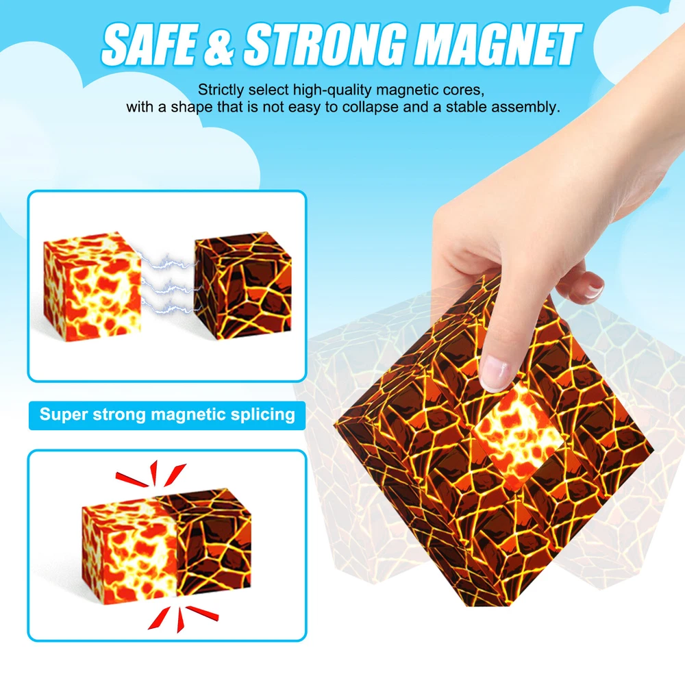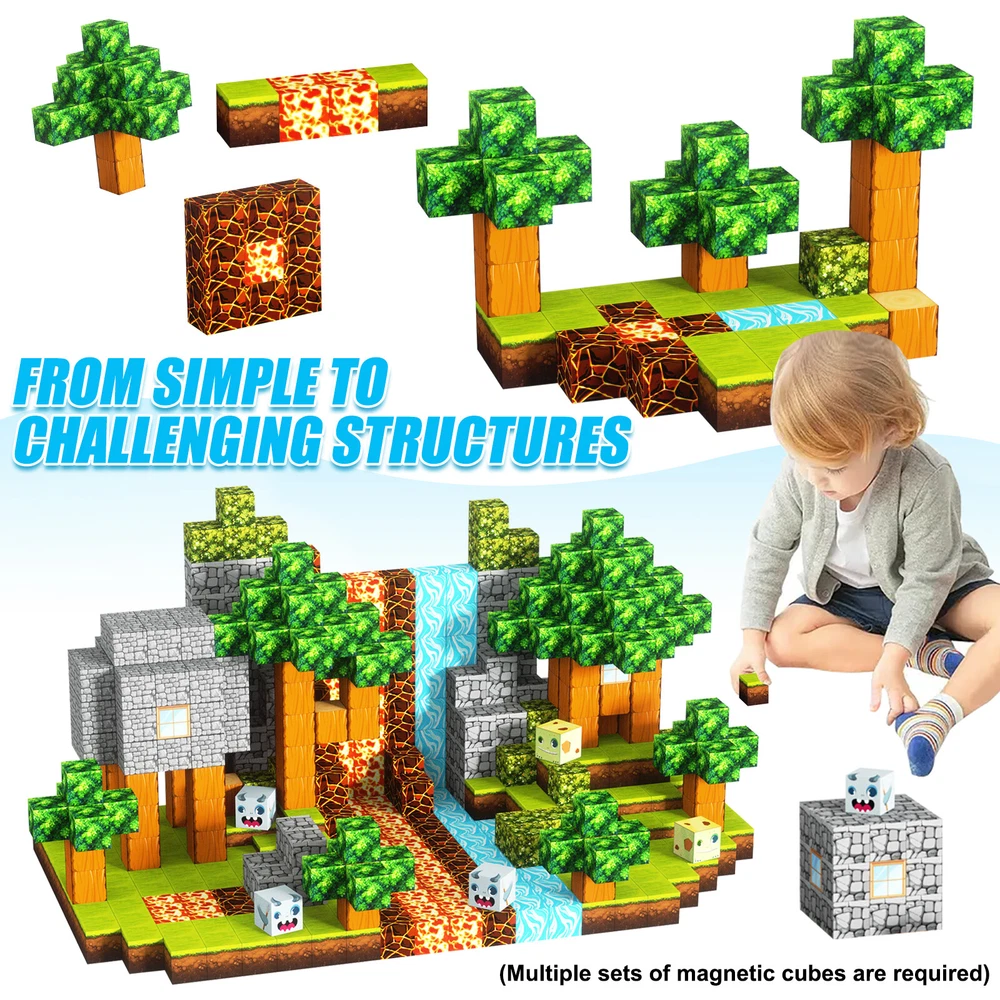 Product Description Features: -BUILD A FOREST SET: Get ready to experience the fun of magnetic toys with this new magnetic cube set! Build a forest collection, add the character cubes from our set, or your other toys, and start your forest adventure with role-playing fun and dress-up toy fun. Magnetic blocks open up a fantastic world of possibilities, from simple to challenging constructions (multiple matching sets required). Let your children's imagination run wild with our magnetic open-ended playsets! -Educational and fun: building and block toys inspire a wide range of skills in children. Building, rotating, destroying and rebuilding with magnetic blocks helps improve children's creative thinking, concetration and patience, cooperation, spatial and motor skills. The included creativity booklet guides and inspires children to explore the magnetic fantasy world. It's a fun solo activity that can also be done with friends and is a great alternative to screen time. -Supersensory Magnetic Toys for Kids: The 100 Piece Magnetic World Set combines UV technology and magnetic science to make your construction art more vivid and realistic than simple solid-colored cubes, offering rich patterns. More cubes, more possibilities to unleash your child's creativity. Kids will get everything to decorate their little castle or build a forest parking lot for their dolls to park their toy cars! -TODDLER AND BEGINNER TOYS MAGNETIC SET: Unlike other magnetic toys on the market, our magnetic cube set makes it easier for toddlers 1+ years old and up to stick the cubes together and make them sturdy. Rounded edges and proper size won't hurt little hands. Perfect STEM toys can help kids get deeper into the world of structures and learn about magnetism. Recommended toy gifts for toddlers and children ages 1-12 years old -EXCELLENT SCIENCE GIFT GIVING IDEAS: The magnetic cube is fun because it will keep kids of all ages busy for years to come. It is a great irritating kids toy for classrooms, toddlers, preschoolers, teens 1 2 3 4 5 6+ boys and girls. Perfect educational gift for birthdays, Christmas, Children's Day, STEM and school events. Attention: - Our initial set is 100pcs, and our main picture is divided into basic sets and advanced quantities, which vary from dozens to hundreds of building blocks, please pay attention to the scale and quantity of building, and purchase according to demand. - We put magnetic control to some challenge, develop careful observation, find building skills, and build high order patterns (watch our tutorial video). The difficulty of more than 300pcs big picture ☆☆☆☆ -☆☆☆☆☆ finally challenge it! Specification: -Material: high quality magnet/high quality plastic -Color: As shown in the picture -Quantity: total 100pcs -Size: single cube size 2.5cm/1inch Package Includes: -1x 100pcs magnetic blocks (12 patterns) -1x Instructions