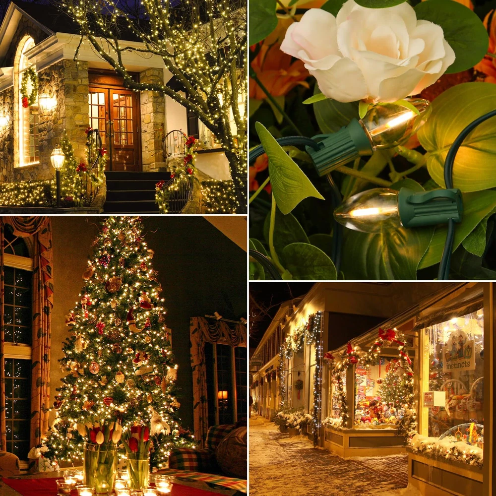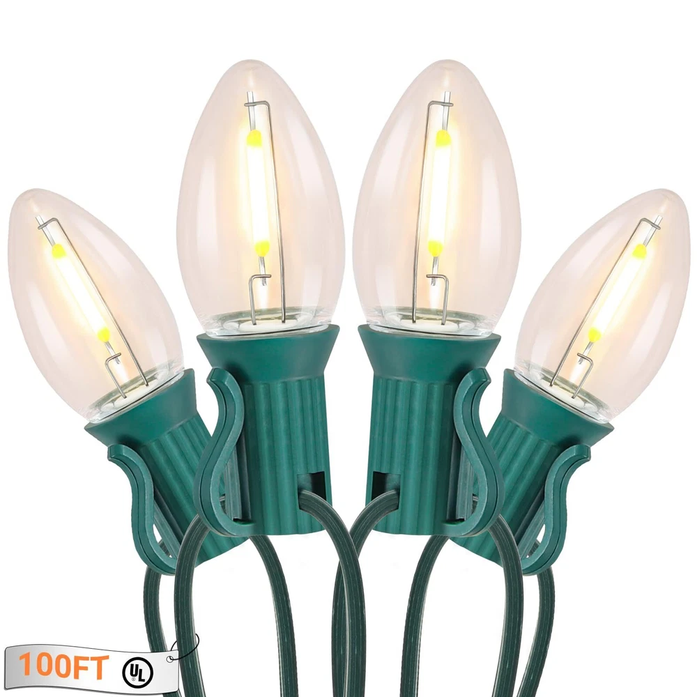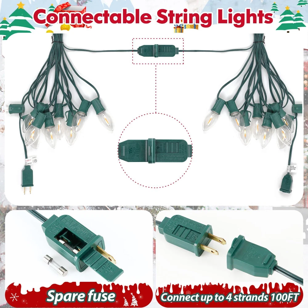 🎄Why do you choose C7 LED Christmas String Lights?🎄 👍Reliable Material Our C7 LED string lights for outside are produced with high quality plastic bulbs and a heavy-duty cord, making them able to withstand extreme weather conditions. IP65 waterproof ensures that they are safe to touch and perfect for both outdoor and indoor decoration. 🎉Easy to Install With a durable and flexible copper wire, these vintage hanging string lights waterproof are easy to install and can be shaped and molded to fit any space. The copper wire is also rust-proof and weather-resistant, so you don't have to worry about wear and tear. 🎊Indoor Outdoor Decoration Lights Our Christmas patio string lights are UL listed for indoor and outdoor use. Each light socket has a link that you can easily attach the lights to your Christmas trees, Christmas decor or other desired surfaces, quick & easy to set up your warm white c7 Christmas lights in minutes, adding an warm white glow to your outdoor garden path and welcome the coming Christmas. 🍾 Specifications - Bulb Type: C7 LED - Base Type: E12 (Candelabra) - Voltage: 120V - Wattage: 0.6W per bulb - Lifespan: Up to 25,000 hours - Power input: 120V~, 60Hz - Lighting mode: steady on 💛Warm Tips 1. Do not mount or place near gas or heaters, fireplace, candles or other similar source installation. 2. If the string light connected with more strings and do not work, please check the max connectable strands (4 strands 100FT) or make sure they are properly connected. 3. The string lights will keep lighting if bulb is broken, you can replace it with our additional spare bulbs. Safe and Durable String Light: Our c7 outdoor string lights come with advance materials and UL listed, which are safer than normal incandescent lights. The heavy-duty green cord made up with PVC cable jacket and high copper that can withstand the wear of indoor and outdoor use. The IP65 waterproof LED Christmas lights either with a built-in spare fuse (120v) for easy , ensuring safe and long-lasting use. Smoothly Dimmable Performance: Adopted advanced dimming technology, our dimmable hanging roof-line string lights with 90%+ dimmer switch in the market, allowing you to dim the brightness from 0%- 100% stable at will, creating the perfect atmosphere for Christmas Halloween holiday birthday party, family reunion or wedding celebration. (Please note: Dimmers are not included) 90% Less Bill Cost: Every C7 Christmas light string outdoor 100FT contains 66+1pcs E12 socket LED bulbs(1 spare bulbs). Each bulb built in high-efficiency led chip, consume 0.6W only while lasting 25000+hrs long lifespan, the low wattage light bulb is more than 90% energy efficient than incandescent bulbs. So you can enjoy the romantic atmosphere without wasting your money. End to End Connectable Lights: 12" lead with male plug, 12" spacing between bulbs, 18" tail with female connector. Our E12 commercial string lights 100FT are end to end connectable up to 432W (4 strands 100FT) to decorate your Christmas. And the C7 vintage clear bulbs are removable that provide flexibility for easy and custom designs. connectable LED Christmas lights perfect for fence, garden, patio, roof, backyard, Christmas decoration. Vintage Christmas Lights: Our C7 vintage Christmas Lights shatterproof glow a warm white lighting, combined with clear lights bulbs & green wire. It’s a perfect Christmas decoration light string for your home, holidays, winter, , backyard, garden, patio, wall, gate, yard, Christmas tree, window, party. You can enjoy the bright and romantic holiday atmosphere.