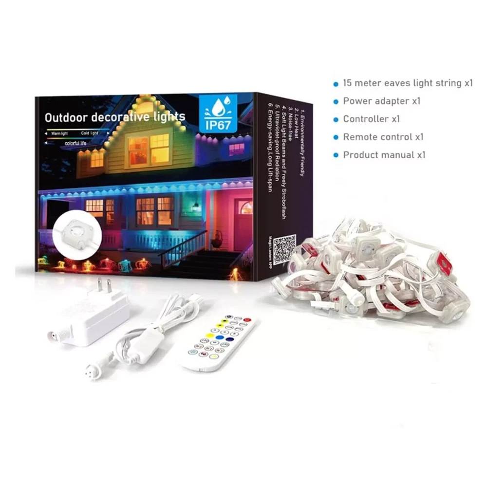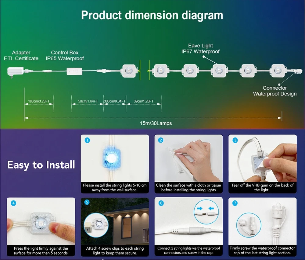 Smart Control Anywhere -- Manage your eternity outdoor lights effortlessly with the included 2.4G remote, providing long-distance control for convenient operation. Bluetooth control -- Unlock a world of color possibilities with endless color chasing modes and solid color options, easily adjustable through the intuitive smartphone app. Year-Round Outdoor Ambiance -- IP68 waterproof design ensures durability in all weather conditions, making these lights perfect for Halloween, Christmas, holidays, and any outdoor party throughout the year. Eye-Catching Triangular Lighting -- Stand out with a unique triangular lighting effect created by the lens design, adding a touch of elegance and flair to your house roof or outdoor space. Expandable Illumination -- With 30 LEDs and a 50ft length or 60LEDs and 100Ft, these lights are extendable to suit various outdoor spaces, providing a stunning visual display for any occasion. Light Source Type: LED Power Sourc: AC/DC Switch Style: alexa Light Direction: Adjustable Controller Type: Voice Control Connectivity Protocol: Bluetooth Average Life: 50000 Hours Material: Plastic Package Dimensions: 17.52 x 10.44 x 6.08 inches Included Components: Light kit inlcuded Bulb Features: Dimmable Light Color: Multicolor Occasion Easter, Christmas, Halloween Special Features Energy Efficient, Dimmable, Waterproof, Color Changing Switch Installation Type: Wall Mount Shade Color: Multicolor Luminous Flux : 26 Lumen Size : 100FT/50FT