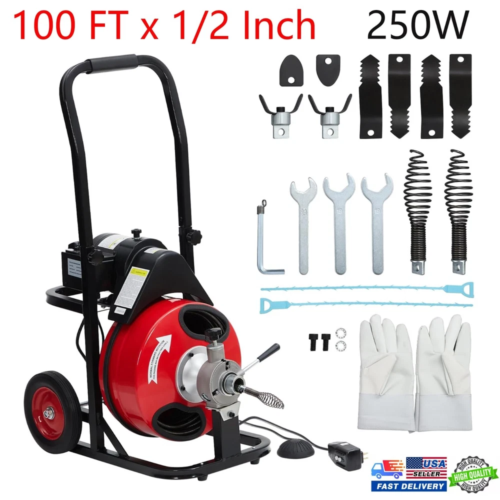 Description: 1. Material: The snake auger cleaner is equipped with 100 feet high-quality manganese steel cable, diameter is 1/2 inches, it has excellent resistance to breakage, rust and corrosion, without the hassle of tangles 2. Design: By using the CW/OFF/CCW knob and air-activated foot switch, you can easily control the steel cables to help you finish cleaning pipes efficiently. 3 Function: Our drain cleaning machine boasts a powerful 250W high-speed motor, ensuring reliable and efficient performance. And it has a semi-enclosed drum, allow you to conveniently observe the remaining cable length. To ensure safety, it has a built-in GFCI to protect the operator from electric shock. 4. Tip: Our drain cleaner machine is equipped with two shock-absorbing wheels allow for easy mobility on stairs and uneven surfaces. The detachable handle comes with a comfortable grip while allowing for easy storage when the machine is not in use. In addition, the tool hook makes it convenient for you to store and replace cutters and tools. 5. Occasion: It can go through various curved pipes from 1 to 4 inches to clear various clogs, keep the drainage smooth.This electric drain snake auger is designed to effectively solves clogging problems in pipes, floor drains, sinks, toilets and more. Ideal for helping eliminate unpleasant odors and troublesome cleaning, perfect for homes, restaurants, office buildings, factories and schools. Package Include: 1x Drain Cleaner Machine With Kits