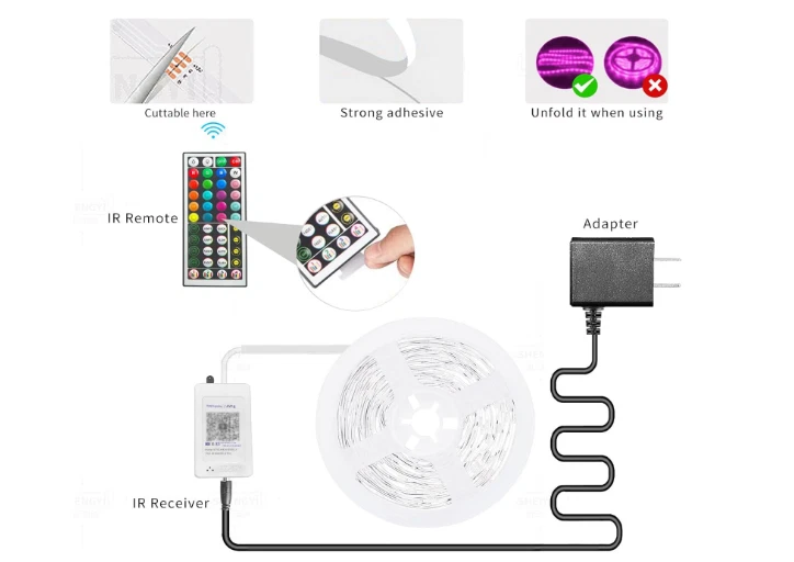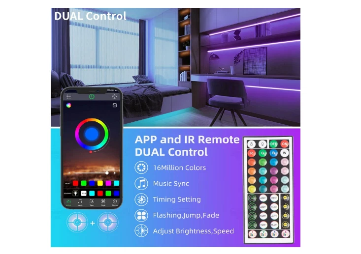 **100FT LED Strip Lights with APP & Remote Control** Transform your space with these versatile 100FT LED strip lights, perfect for adding vibrant, customizable lighting to any room or occasion. ### **Features:** - **APP & Remote Control**: Enjoy seamless control via Bluetooth or IR remote. Choose from 16 million colors, adjust brightness, and customize modes (Flashing, Jump, Fade) with varying speeds. - **Music Sync**: Built-in mic syncs the LED lights to ambient music, creating a dynamic party atmosphere effortlessly. - **Timing Setting**: Schedule the lights to turn on/off automatically at your preferred times for added convenience. - **Wide Applications**: Perfect for bedrooms, kitchens, ceilings, living rooms, and more. Ideal for holidays, parties, weddings, and celebrations like Christmas or Halloween. - **Easy Installation**: Simply peel off the adhesive backing and stick the lights to a clean, dry surface—setup is complete in minutes! Elevate your home decor and celebrations with these long-lasting, customizable LED strip lights!