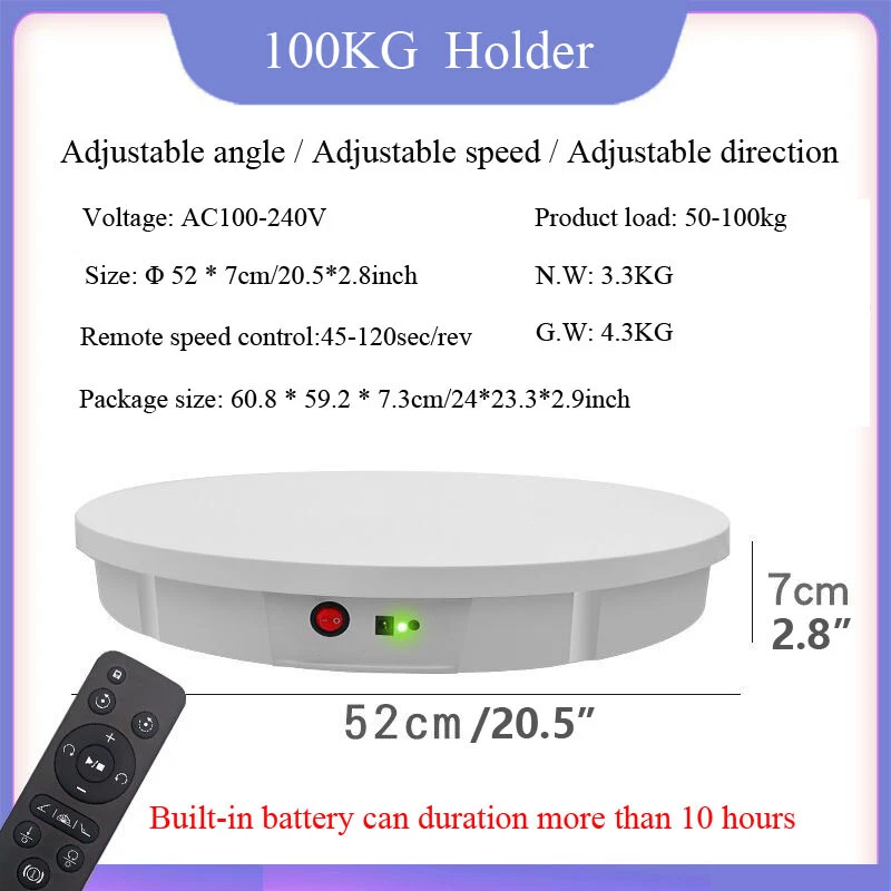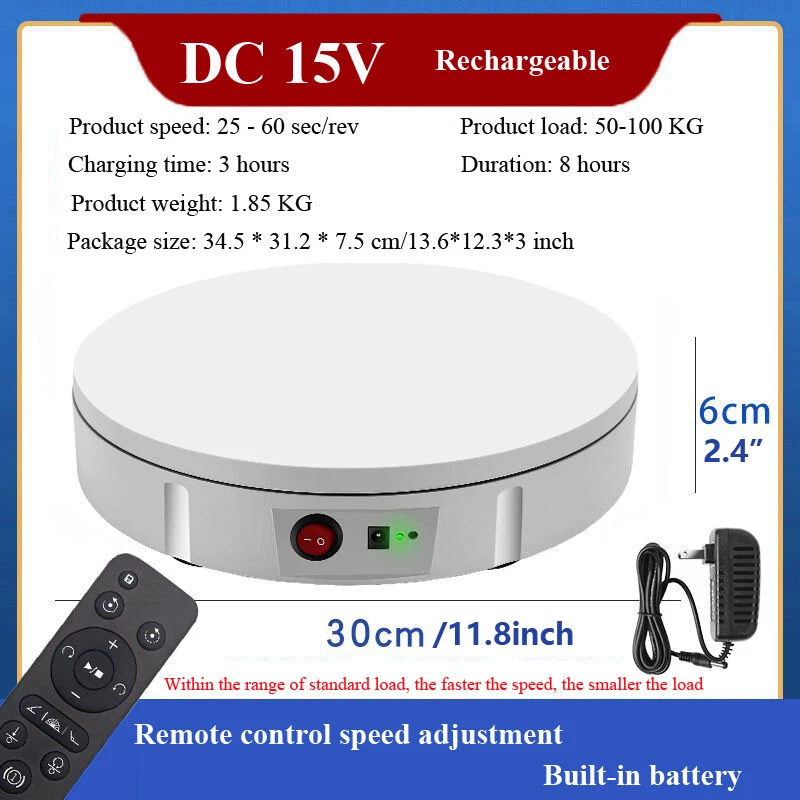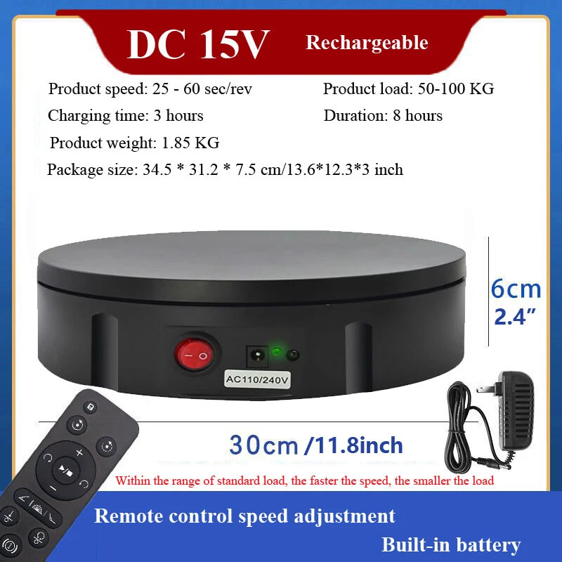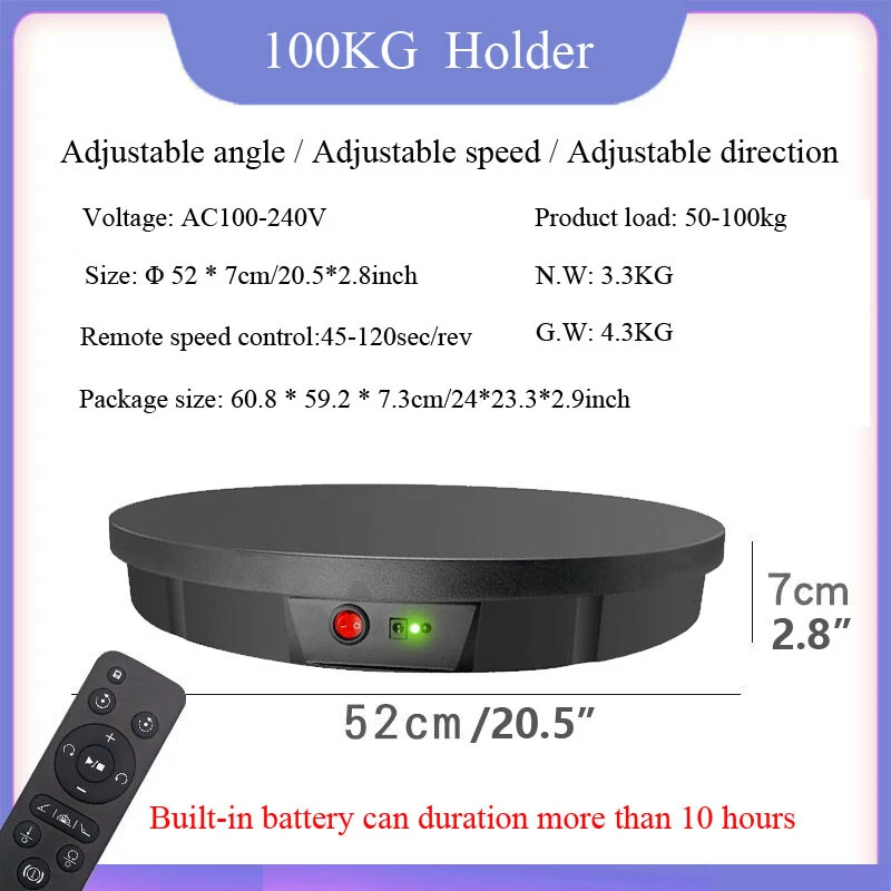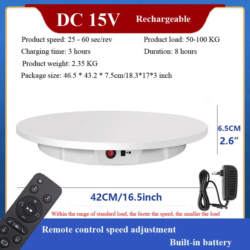 Store Categories Store Categories Outdoor Sports Business and industrial Batteries Home and garden Healthy and beauty Toys and doll TOOLS Accessory Other Product Description Features: 1. Remote control design 2. low noise rotation 3. Safe and durable 4. Easy to operate 5. The turntable can work for a long time 6. Two-way rotation 7. Rechargeable type can work without plug in power when it is full charged,also can work with plugged in power.accommodate your multi needs. 8. Wide range of applications,whether it's shooting products or videos, it can bring you more wonderful moments Specification: Voltage: AC 110-240V Diameter: 30/42/52/60CM (11.8/16.5/20.5/23.6inch) Speed: 25-60sec/rev-Diameter 30/42cm (11.8/16.5inch); 45-120sec/rev-Diameter 52/60cm (20.5/23.6inch) Bearing capacity: max 100KG Direction: two-way (remote control) Rotation mode: automatic rotation Charge Time: 3 hours ;Duration: about 8 hours (only apply for Diameter 30/42cm type) Charge Time: 3 hours ;Duration: about 10 hours (only apply for Diameter 52cm type) Charge Time: 3 hours ;Duration: about 12 hours (only apply for Diameter 60cm type) Includes: 1 x Set of Electric Turntable Note: The above endurance time is measured under idling conditions. The duration of this item after it is fully charged is specifically related to the items which its load bearing. Payment Policy Shipping Policy Returns Policy About Us Contact Us Payment Policy 1. We accept PayPal only. 2. All major credit cards are accepted through secure payment processor PayPal. 3. Payment must be received within 7 business days of auction closing. 4. If you have bought multiple items from me, you can send me one payment for all the items instead of paying for them individually. When you click the Pay Now button, eBay will automatically determine if there are other items you have won or purchased from me and will combine them for your review. 5. NOTE: Import duties, taxes and chargers are not included in the item price or shipping charges. These charges are the buyer's responsibility. Please check with your country's customs office to determine what these additional costs will be prior to bidding buying. Shipping Policy 1. We Ship to Worldwide. 2. Items will be shipped within 7-14 business day on payment received. 3. Item are shipped from Shenzhen using Airmail, reach most of the countries within 10 to 35. 4. Delivery time depends on destination and other factors, it may takes up to 40 business days. 5. We are not responsible for undeliverable address, we reserve the right to charge the shipping fee again for returned items due to wrong address. 6. If you do not receive your item by 30 business days, Please feel free to contact us via ebay mail system, we will try our best to resolve any problems with you. Returns Policy 1. You have 7 day to contact us and 10 days to return it from the date it was received. If this item is in your possession more than 7 days, it is considered used and WE WILL NOT ISSUE YOU A REFUND OR REPLACEMENT.There are NO EXCEPTIONS! 2. All Returned items Must Be in the original packaging and you MUST PROVIDE us with the shipping tracking number, specific reason for the return,and your ebay ID. 3. We will refund YOUR FULL WINNING BID AMOUNT, upon receipt of the item in its original condition and packaging with all components and accessories included, AFTER BOTH Buyer and Seller cancel the transaction form ebay.OR, you may choose to have a replacement. 4. Return shipping is to be paid by the Buyer. About Us 1. We strive for our customer satisfaction at best possible. If you have any questions, please feel free to email our service specialists 24 Hours a Day, 7 Days a week. We will reply you ASAP. If no response within 24 Hours, please check the spam in your mail box. 2. We greatly appreciate your POSITIVE feedback. Please do NOT leave negative feedback without asking for help. Our aim is to provide Top Level Customer Service, normally so we will try our best to solve any problem you have. 3. Please DON'T leave negative or neutral feedback if you haven't received item in 30 days, because we have mentioned the shipping time repeatedly. Contact Us Our customer-oriented service strives for positive feedbacks with all 5 star selling ratings . Please feel free to contact us via eBay message once you have any question before you giving us negative feedback or open case. Business time: GMT8 (9:00-18:00) from Monday to Friday Copyright © 2023 Dianxiaomi