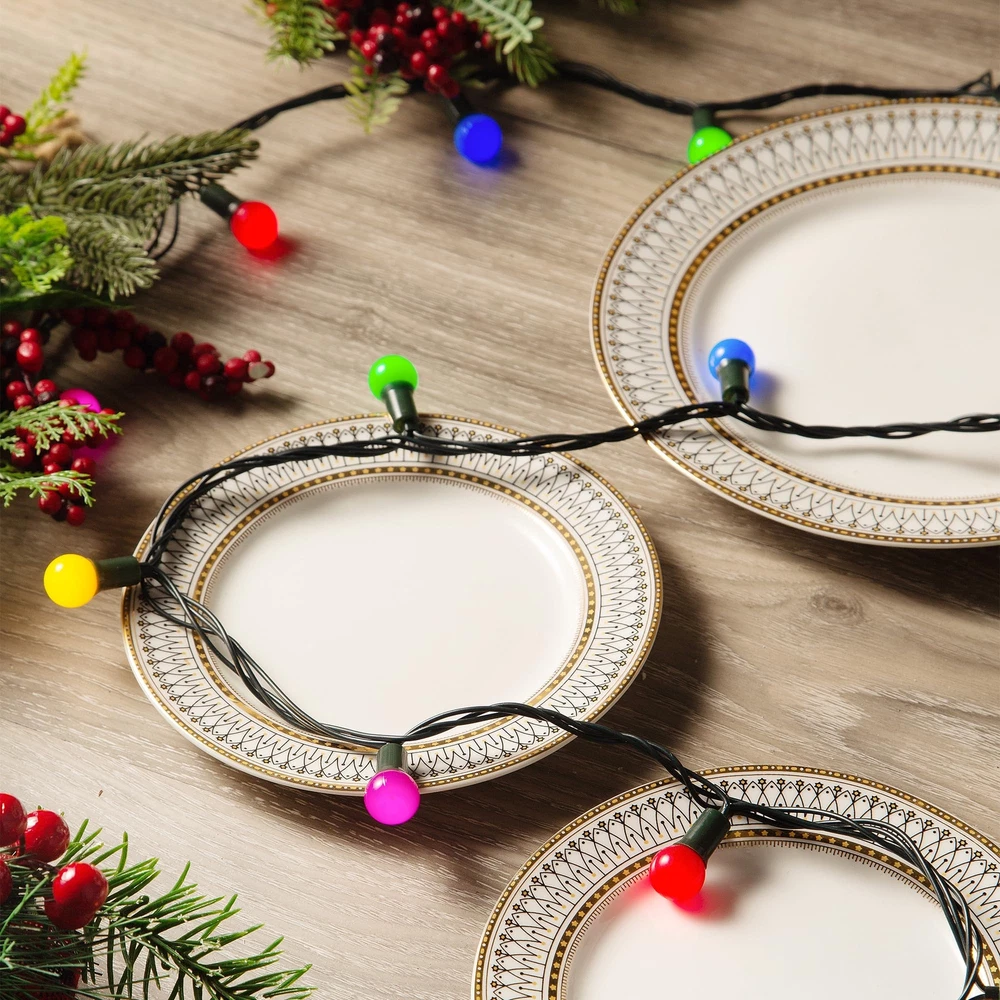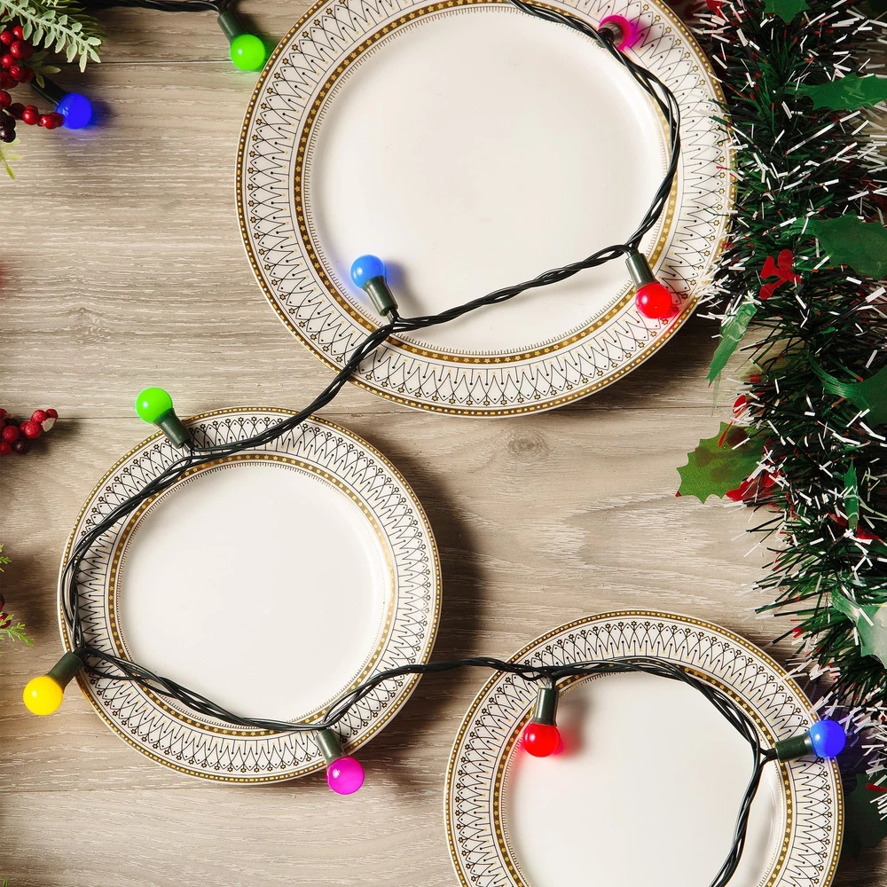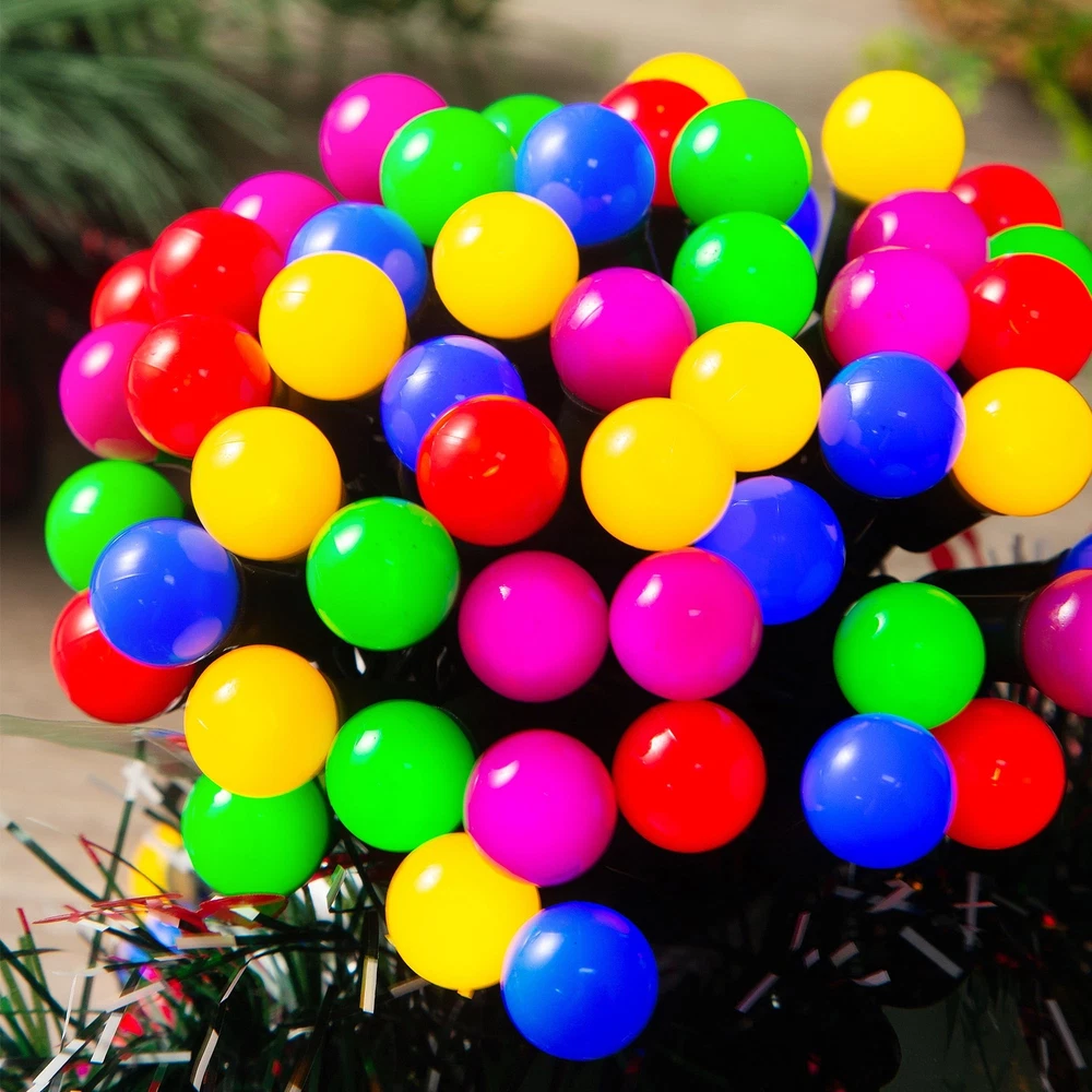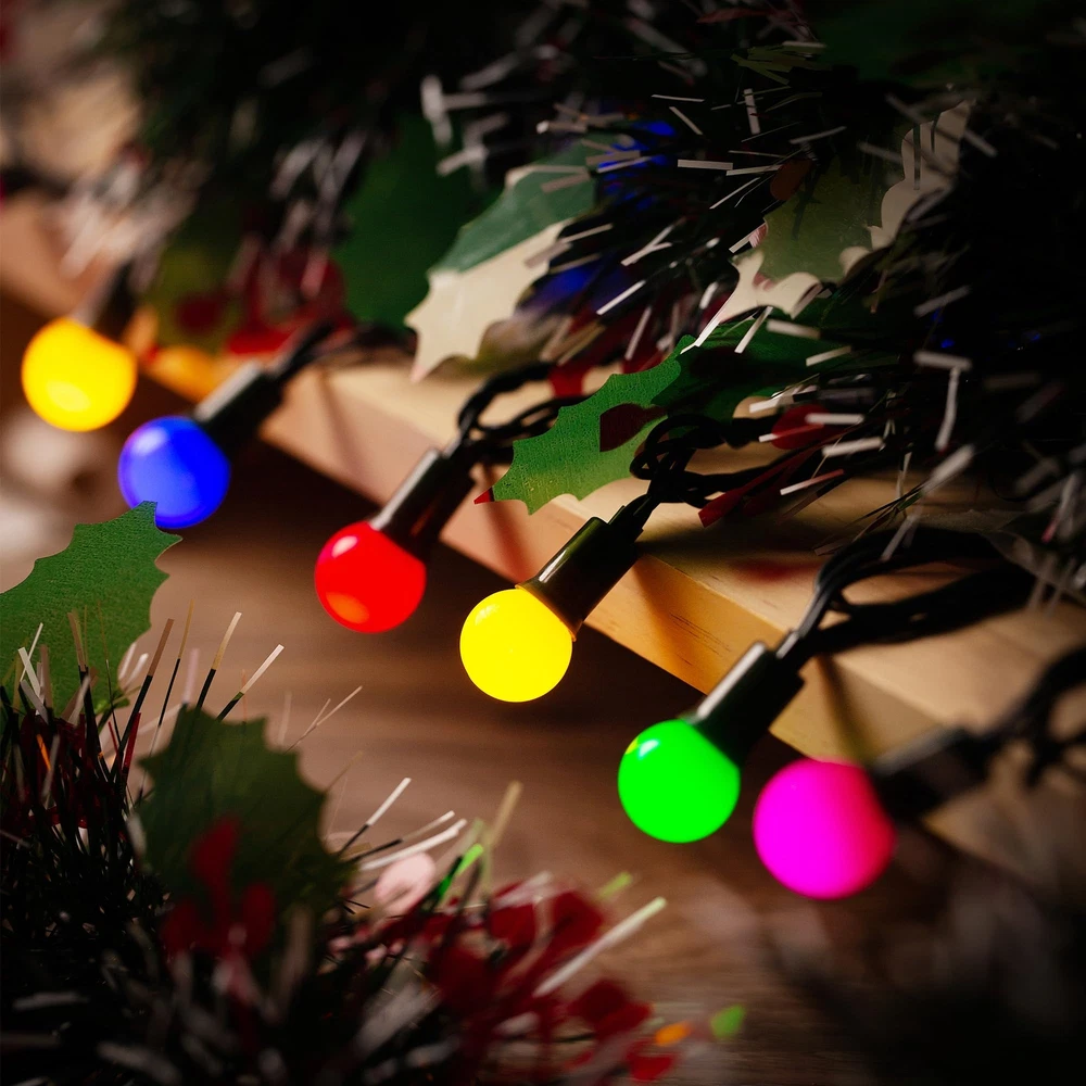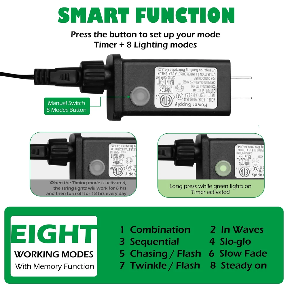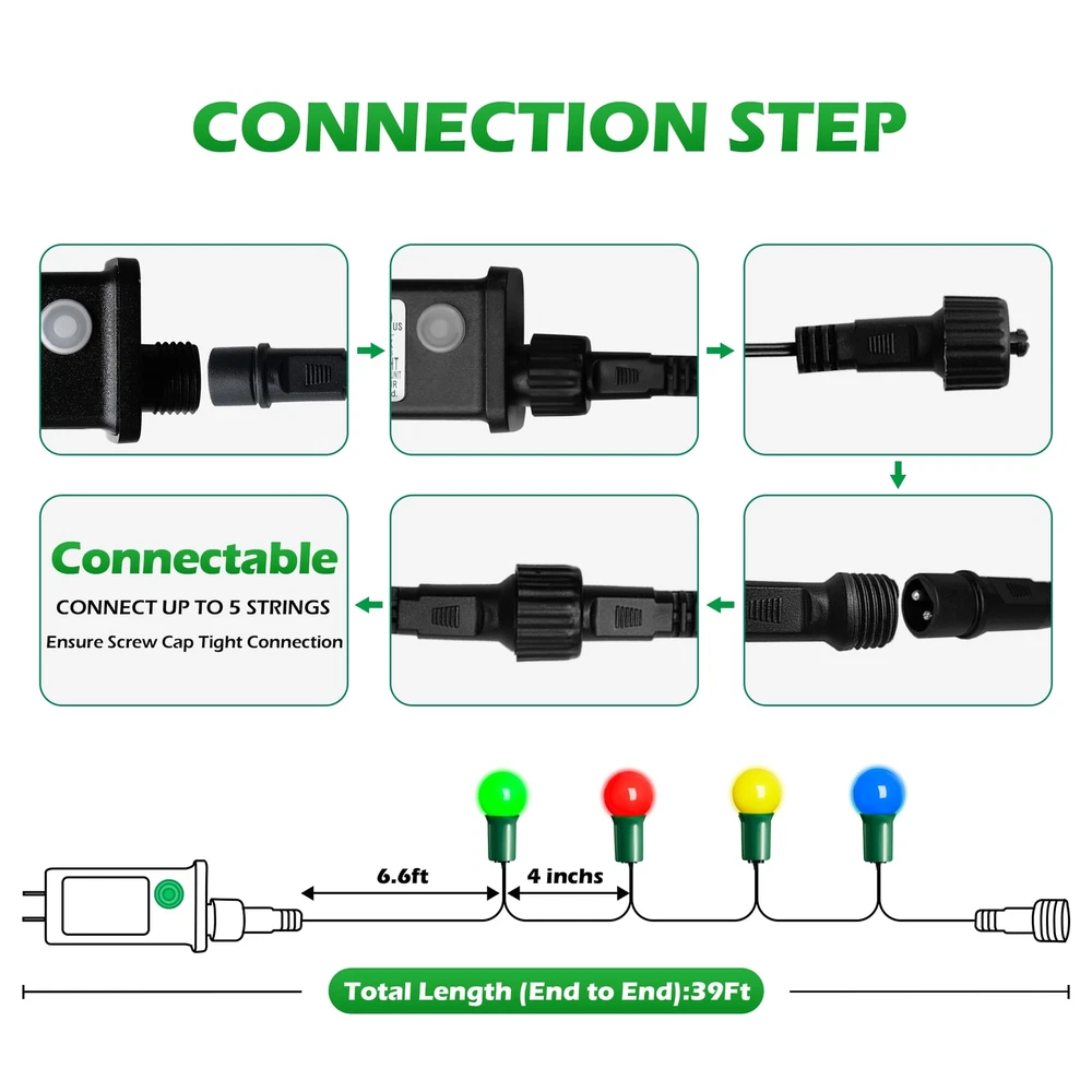 Specifications: Bulbs: 100LED Lights Color: Multi Color Wire Color: Dark Green Total Length: 40ft Wire with Light: 33ft Lead with Male Plug: 6.6ft Lead with Female Plug: 4 inch Space between LEDs: 4 inch 100 GLOBE LEDS - 100 globe bulbs spaced on dark green cord, total length 39 ft. 4 inch spacing, 6.6 feet lead. A string of lights, a collection of multi color lights, create a stunning pattern of light 8 LIGHTING MODES & TIMER FUNCTION - This twinkle lights have 8 modes to fit different occasions, moods, feelings, holidays, festivals, anniversaries. The Christmas lights come with timer function. Long press 3s until the button's green lighting light up, that mean the timer is activated; if the green light off, it means the timer is inactivated SAFTY COMES FIRST - Safe plug design makes the Christmas fairy light with touchable while working and safe for kids or pets. Ideal for both domestic and commercial use HEAVY RAIN SNOW PROTECTION & MEMORY FUNCION - High waterproof rank make it can withstand heavy rain and snow, perfect for indoor and outdoor decorations. And string lights come with built-in memory chip to save the last mode setting, no need to manually set every day END TO END CONNECT - 39ft fairy string lights with 100 multi color christmas LED lights. And end-to-end connection that allows up to 5 strands connected together to illuminate a wider range