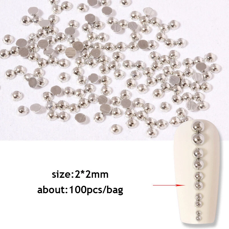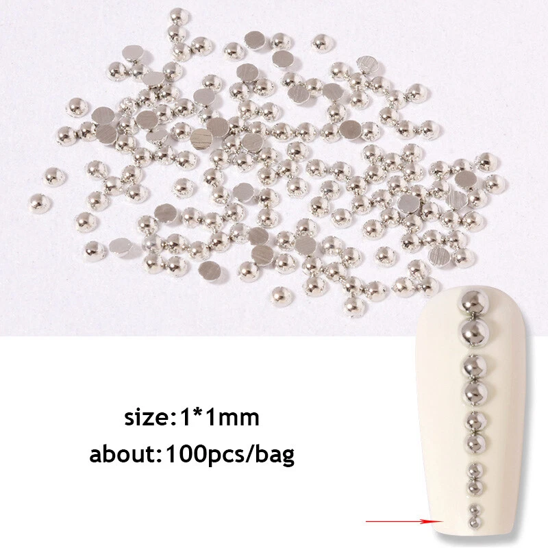 Color: Gold,Silver Shape:Semicircle Quantity:100pcs/bag Size:1mm,2mm,3mm Type: Nail Art DIY Charms Decorations Usage: Nails, Bags, Shoes, Cell Phone, Box, ect. Package: 1 bag 100pcs Metallic Beads Nail Art Decorations