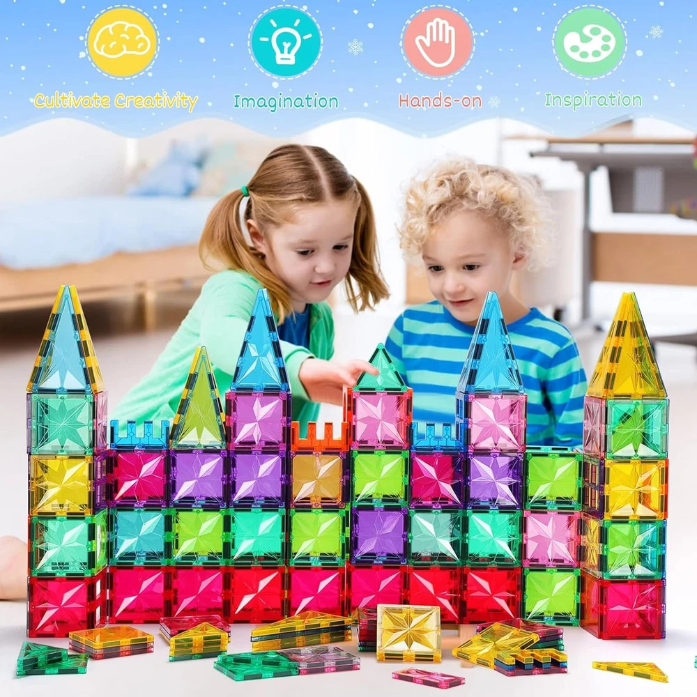 Introducing our Extra-Large Magnetic Building Tile Set – the perfect blend of fun, affordability, and creativity for your children! Join countless satisfied customers who have added this set to their carts and experienced the joy of imaginative play. Here's why our magnetic tiles stand out: Hours of Creative Play: Watch your kids (ages 2 to 8) engage with this set daily since Christmas. The set is HUGE, providing endless possibilities for building towers, houses, trains, cars, airports, and more! Versatility & Value: Unlike sets that offer only squares and triangles, our set includes windows, bases with wheels, and a variety of shapes, making it more exciting and affordable for your little builders. Educational Fun: Foster creativity and spatial awareness as your children build castles, houses, trucks, and entire towns. The set is not only entertaining but also an educational tool for developing fine motor skills. Durable and Safe: Designed for kids of all ages, our magnetic tiles pass the durability and safety test. Give the gift of quality construction that stands up to the boundless energy of young builders. Parent-Approved: Don't just take our word for it – read reviews from satisfied parents who have witnessed the durability and entertainment value of our product. A perfect gift for any child who loves to build! Screen Time Solution: Keep your kids away from screens as they immerse themselves in hours of quiet and creative play. This set provides a wholesome alternative for imaginative activities. Perfect for Gifting: Ideal for birthdays or special occasions, these magnetic tiles are sure to delight your child or grandchild. Even great for classroom activities! Say goodbye to ordinary building sets and "add to cart" for a magnetic experience that's totally worth it! Your kids will thank you for the endless hours of building fun and imaginative exploration 【- UNLEASHING IMAGINATIONS】Experience the joy of play and learning with Magnetic Tiles. Special Diamond/Star Pattern Kids Toys: Eye-catching diamond patterns with transparent facets, creating a dreamy and colorful castle-like appearance when refracted by light. Strong Magnetic Building Tiles Set: Our 100-piece magnet tiles toys, including 2 cars, feature strong magnets securely sealed for a worry-free play experience. Vibrant Design: Enjoy visually stimulating magnet building tiles with round edges and smooth surfaces, creating a magical experience for kids. Refill or mix with other brands for more pieces, unlocking endless possibilities in building models.Perfect for imaginative play. Learning in Play: STEM Magnet Toys for Toddler .Encourage cognitive development with our magnetic tiles for kids. From shape recognition to creative construction, these toys foster learning and 3D spatial thinking. Ideal for Gifting and Collaboration: A perfect gift for toddlers and preschoolers, the 100-Piece Set encourages imaginative play and learning. Great for birthdays, Children's Day, Kindergarten Graduation, and Christmas. Also, fosters collaborative learning in classrooms and kindergartens, igniting creativity and teamwork.