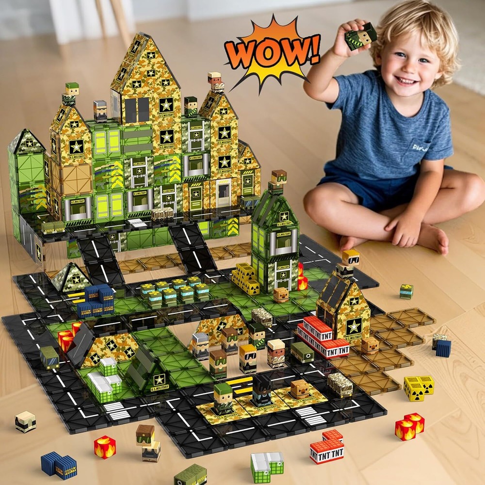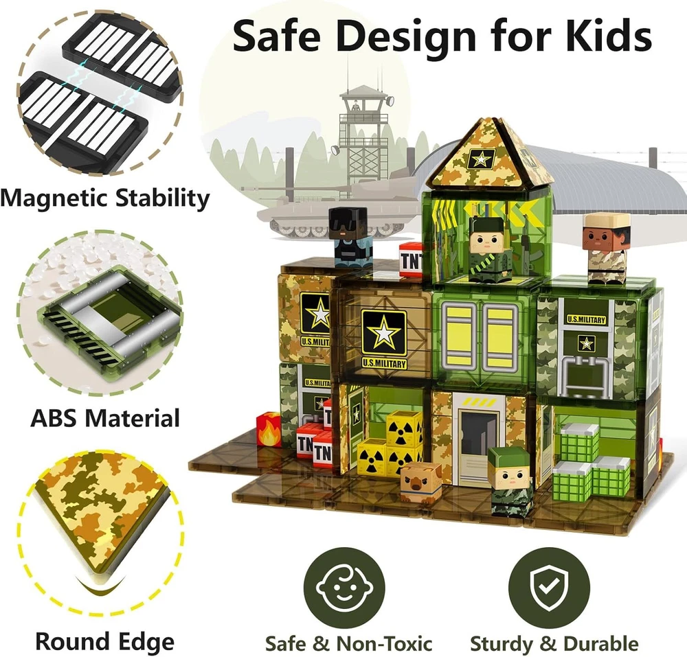 100PCS Magnetic Tiles Building Toys with Army Men, STEM Magnetic Building Blocks for Kids Ages 3-5 4-8, Magnet Tiles Sensory Educational Toys Games Birthday Gift for 3 4 5 6 7 8+ Year Old Boys & Girls Item Description Hours of Military-Themed Fun: Keep kids entertained with our army magnetic blocks, tanks, and army men! they’ll build bases, command missions, and enjoy imaginative play—without being glued to screens 100pcs Army Magnetic Tiles Set: Includes 60 magnetic tiles and 40 magnets cubes—featuring 8 soldier action figures and gear like 2 helicopters, 2 trucks, 2 armored vehicles, 2 hounds, and more for creative military-themed building Safe & Sturdy for Kids: Made from high-quality ABS plastic with smooth, rounded edges, these magnetic blocks are gentle on little hands, built to last, and perfect for worry-free playtime Compatible with Major Brands: Works with most magnetic tile sets and pairs well with toy soldiers or army playsets, encouraging hands-on building, creative thinking, and problem-solving skills Perfect Gift for Boys Girls: Great for birthdays, holidays, or classroom rewards, this army magnetic set inspires hands-on building at home, in class, or outdoors—perfect for kids ages 3–8