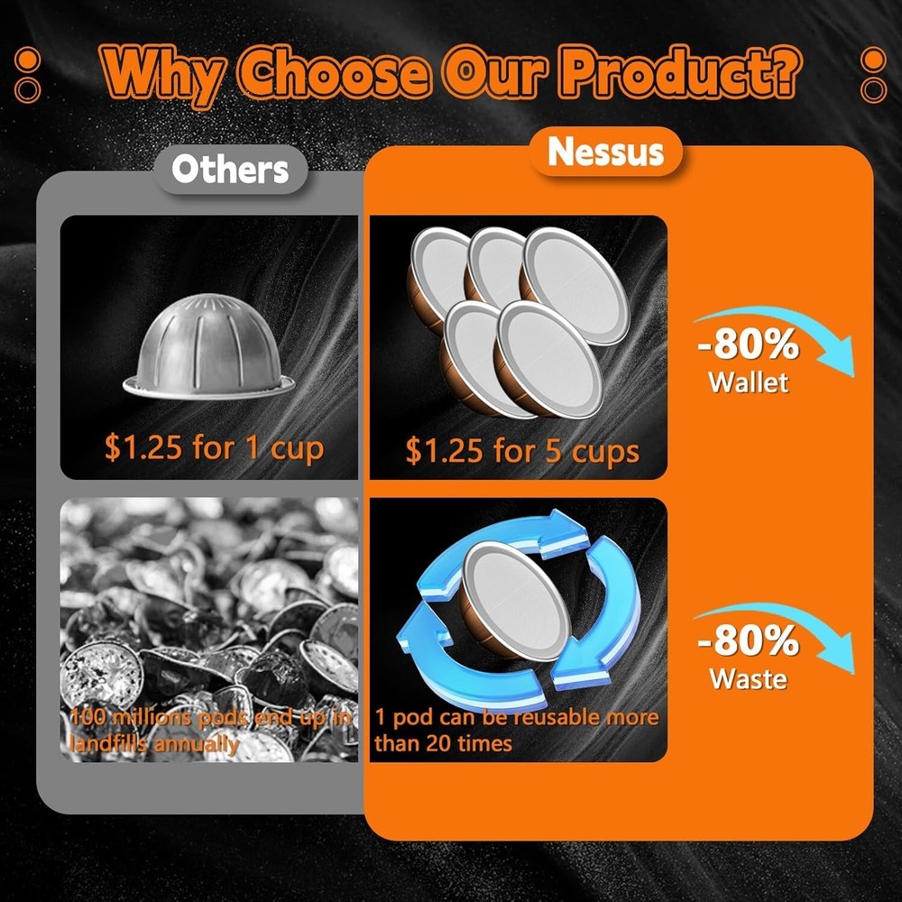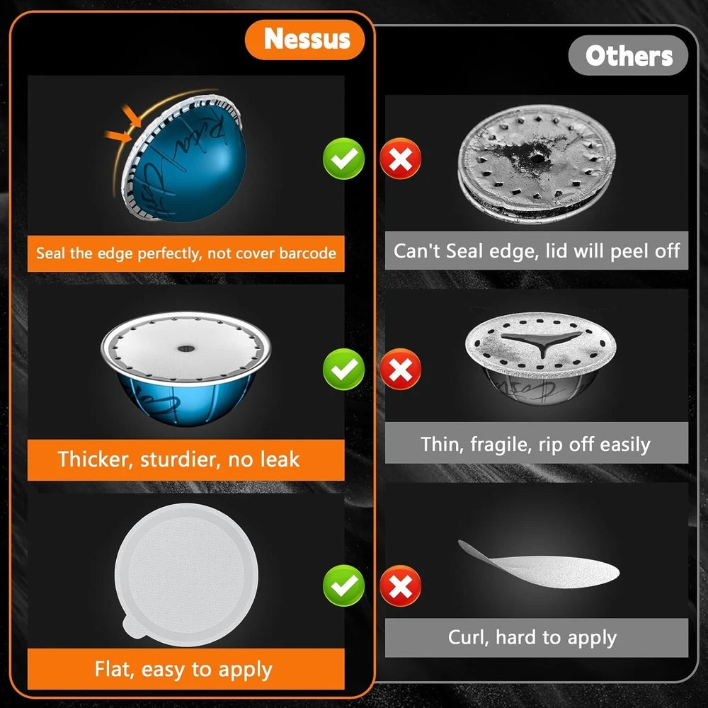 Aluminum Foil Lids for Nespresso Vertuo Reusable Pods, 100 PCS Foil Seal Cover for Refill Espresso Coffee Capsule, Compatible with Nespresso Refillable Capsule Material Aluminum Color Sliver Style Modern Shape Disk About this item PERFECT SIZE & ADHESION: Say goodbye to foil waste, weak coffee, and machine damage caused by ill-fitting seals. NESSUS foil lids easily position reusable vertuo pods without covering the barcode. Plus, they feature food-grade adhesion that keeps your pods airtight and well-sealed, so you can prefill them and enjoy fresh coffee anytime. SAVE YOUR MONEY: Specially designed for Nespresso pods vertuo, NESSUS 100pcs foil seal lids help you easily refill and reuse your vertuo pods, saving money and reducing waste, providing convenience and high efficiency for your coffee life. EASY TO REFILL: Refilling your vertuo reusable pods with the NESSUS refillable pods kit is simple and hassle-free. Just put the empty capsule into the holder, add your favorite coffee powder, and use the NESSUS foils to align with the raised edge of the holder. Then, press the top cover to get a new capsule. UNLOCK ENDLESS POSSIBILITIES: Unlike being limited to a small variety of coffee blends, NESSUS Aluminum foil covers give you the ability to select the coffee of your choice. Whether it's your morning fuel or a relaxing moment shared with friends, Foil Lids for Nesprsesso reusable pods cater to your pursuit of coffee excellence, which make excellent gifts for coffee lovers. 100% SATISFACTION: Whether you seek the perfect flavor or long-term protection for Nespresso vertuo machine, Nessus aluminum foil seals will be your ideal choice. By choosing our refillable pods seals Lid, you can achieve a win-win situation in terms of saving money and being environmentally friendly.