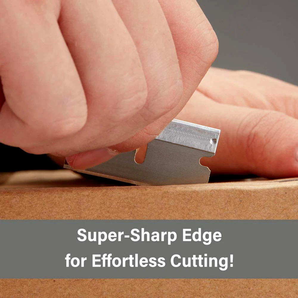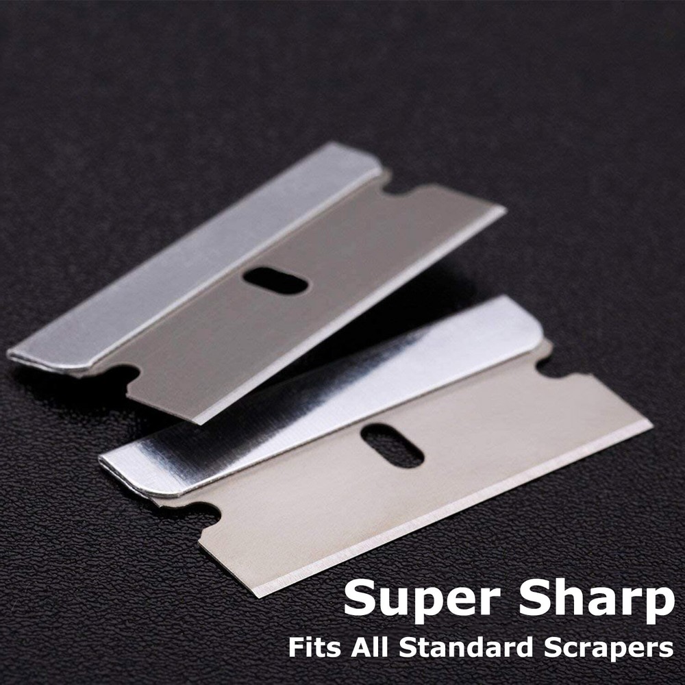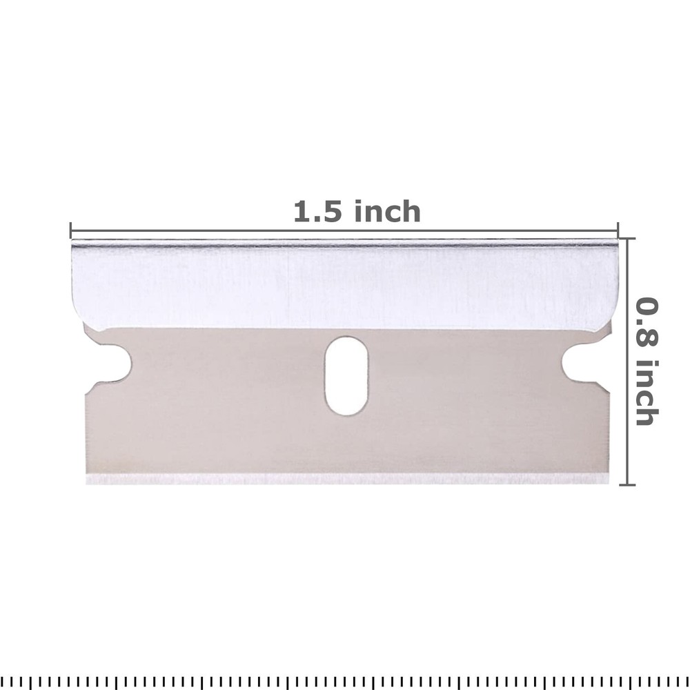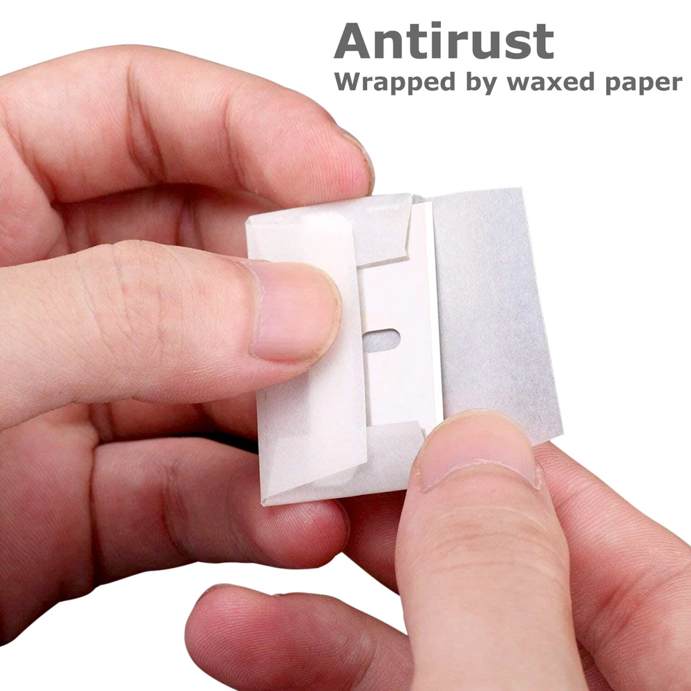 100 PCS Razor Blades Single Edge Extra Sharp Heat Treated Safety Knife Scrapers Features Single Edge Extra Sharp Laser Sharpened Each Blade Protected By Sleeve Heat treat blades Perfect for use as or in scrapers Specifications Material: Steel Quantity: 100pcs Dimensions: 1.5"x0.8" Items Included 100 PCS Razor Blades