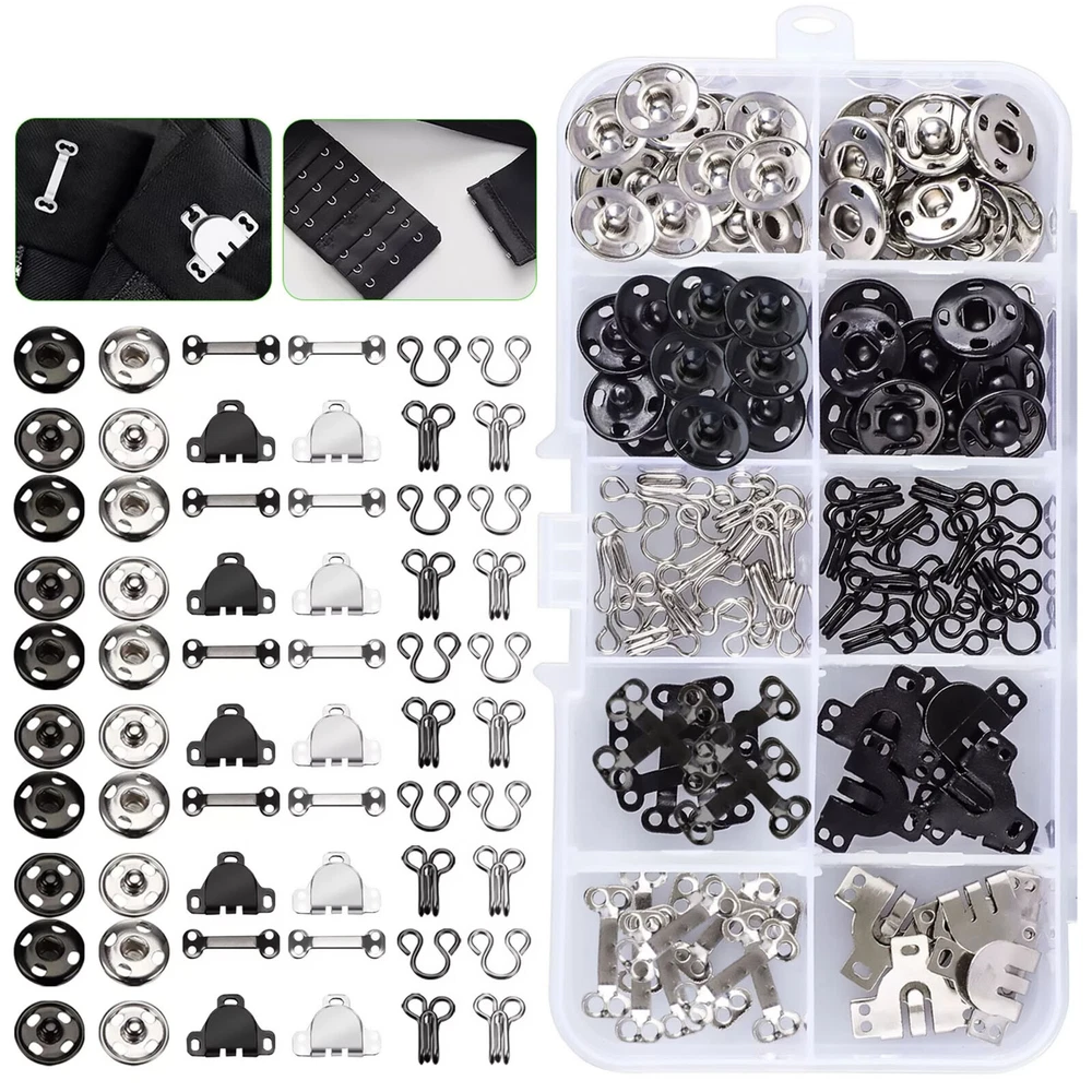 NEW-00023 100Pair Sewing Hooks and Eyes Set Snap Buttons Clothing Button Sewing DIY Kit PRODUCT DESCRIPTION Features: Quantity: 100 pairs 3 styles 2 colors sewing hooks and eye set hook and eye closures kit, enough for daily use. Bra Sewing Hooks and Eyes: 40 pairs; closure can application on brassieres, bustiers, corsets and other fine lingerie, fastening on a skirt, dress or pants. Skirt Sewing Hooks and Eyes: 20 pairs; the 2 parts could be buckle together side by side, you can apply them to fix up your broken pants, dresses, skirts, trousers, slacks, sweaters, etc. Sew-on Snaps Buttons: 40 pairs; hard, sturdy and durable, not easy to get erosion. High Quality: Our snap buttons are made of high-grade environmentally friendly copper, which is bright, strong, durable and rust-proof. Easy to Use: You can use a sewing machine and hand-sewn without hammers or punching. Specifications: Type: Hook and Eye Latch Kit Quantity: 100 Pair Color: Silver, Black Material: Iron Head Style: Round, Button Package Includes: 40 Pair Sew-on Snaps 40 Pair Bra Hook and Eye 20 Pair Pants Hook and Eye Shipping Contact Us Our products have been sent to the US warehouse. All items will be shipped via WINIT CORPORATION. In 2-5 working days, you will receive your items. Thank you and have a nice day. If you have any question about us or items, please contact us, we will reply it as soon as possible. Shipping Our products have been sent to the US warehouse. All items will be shipped via WINIT CORPORATION. In 2-5 working days, you will receive your items. Thank you and have a nice day. Contact Us If you have any question about us or items, please contact us, we will reply it as soon as possible. PaymentShippingReturn policyAbout usContact us Copyright © - Tongtool All rights reserved | Design:Tongtool