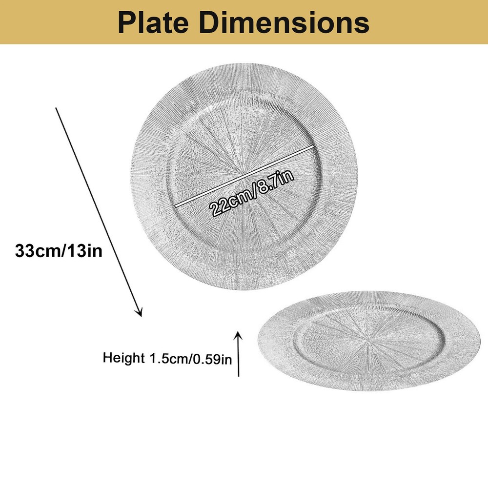 Store category Sign Up Now ! You may also like Product Description Bullet Points: Enough Quantity: Catering to event planners and homeowners, these 100 pieces of gold textured round dinner plates provide a sufficient quantity, ensuring an efficient tableware solution for any reception needs Improved Table Setting: Constructed from high-quality gold PP, these charger plates feature a distinctive textured surfaces for a sophisticated design. Improve your dining experience while making your guests feel special and valued with this elegant addition to your table setting Maintain a Clean Table: Our gold charger plates boast a wide edge design and suitable size that effectively prevents food spillage, making each dinner party easy. Each plate is approximately 13 inches in size and also increases stability and practicality Wide Application: Improve your dining experience with these gold charger plates that add a touch of elegance to any occasion. Perfect for weddings, birthdays, and cultural events, they're suitable for both indoor and outdoor dining and make your food look more attractive, adding to the fun of dining Simply Clean: Improve your table setting with these exquisite gold charger plates that are crafted for easy use and convenient maintenance. Simply wipe them clean with a damp cloth and store them at room temperature for their next use Add an elegant touch to weddings and special events with our bulk gold charger plates. With a sufficient quantity and unique texture on the surfaces, these plates also increase stability and practicality. Store at room temperature for long-lasting use. Specifications: Product name: Sliver Charger Plate Product color: Sliver Product material: PP Product size: about 33x33x1cm/13x13x0.4 inches Packing List: 100* Sliver Charger Plates Notes: 1. Due to different lighting and screen settings, the item color may be slightly different from the picture. 2. Due to different manual measurements, please allow a 1-2cm difference in size. Payment Delivery details Terms of sales About us Feedback & DSRs Payment Before you palce an order, please kindly make sure that you have a paypal account. We accept PAYPAL payment only. Payment should be completed within 2 days after auction closed, or unpaid dispute will be filed for an closing auction. An unpaid case will be filled after 4 days. Delivery details We ship to your eBay address. Each package will be shipped to US by UPS Regular Parcel with tracking number. Please check your shipping address carefully before checkout, it can't be changed if order completed. All items will be shipped within 1-2 business day upon receipt of payment.Orders placed on weekend will be shipped within 3 days. If you do not receive your item in 7-10 business days.please contact us immediately for further assistance. We will be responsible for any damages or losses incurred in the shipping process. About us We maintain high standards of excellence FIVE STAR and strive for 100% customer satisfaction! Positive Feedback is very important to us. We hope that you contact us immediately Before you give us neutral or negative feedback, so that we can satisfactorily address your concerns. We promise to offer the lowest price and high quality produce. Our working time: From Monday to Friday(9:30 am to 18:00pm), we don't working on holidays ,hope you can understand and know that , thank you. Please always talk to us via ebay Message. We appreciate your business and look forward to growing our e-Bay sales with satisfied customers. Feedback Contact us If you have any questions, please feel free to contact with us by ebay Message during our business hours ( 9:30a.m. to 5:30 p.m.), or email us through eBay, we will try our best to help you to resolve it. For any presale or after-sale questions,please do feel free to email us! Due to the time difference, each email will be replied within 1 working day,and weekend will be delayed a bit. Feedback