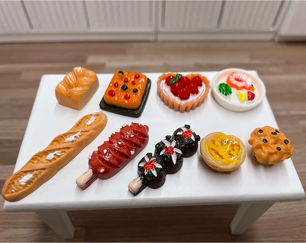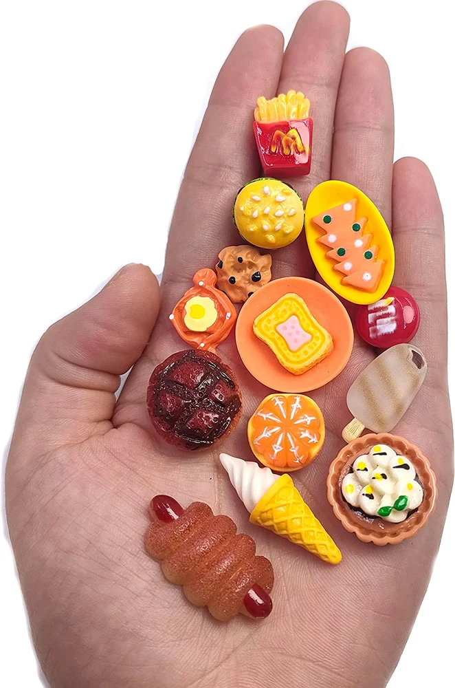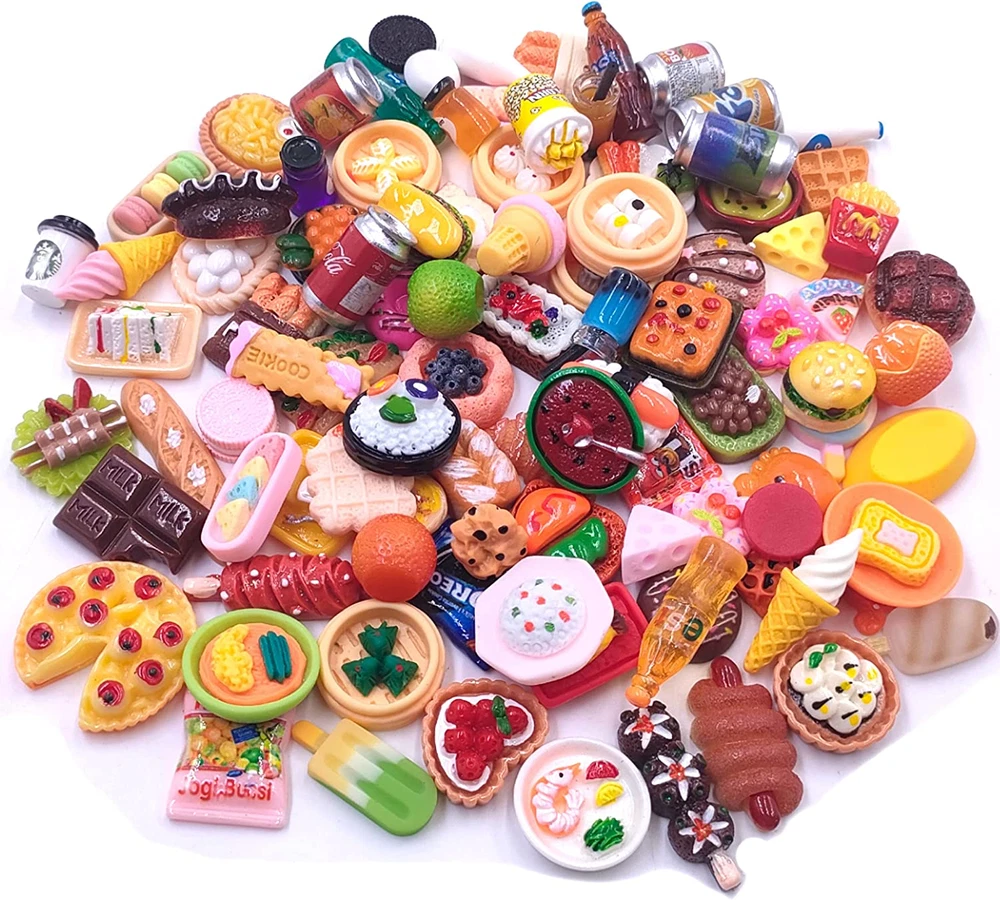 SUPER VALUE ——100pcs miniature food toys set come with different style mini food, nclude: food, beverage bottles, beverage cans, burgers, French fries, cakes, milk tea, bread, chocolate, ice cream, milk, beverages and more. Enough quantity and style offers you starting pretend food play,help to relieve stress, develop creativity and imagination, bringing you lots of fun. SAFE MATERIAL——Made of high quality resin,hand-painted with exquisite details.Mixed Color and Mixed Shaped by Random.These food modeled toys are lifelike and eye-catching, attractive looking and bright color offers hours of fun for kids and adults.Mini and hard material can be applied for your long-term use. WIDE RANGE OF USESG——these tiny cute food toys are not only great addition to dollhouse ,Livingroom, Bedroom, Diningroom,Study Room, Sewing Room, Bath Room, Play Room , but also nice decoration to hairpins, sewing, scrapbooking, mobile phone, picture frame, stationery boxes, miniature garden, potted landscape, window display etc. Or embellishment to any other DIY project as you like. PERFECT GIFT - Miniatures make a perfect gift for Birthdays and festival to friends who like arts and crafts, family who likes DIY etc.Great for adding life atmosphere for your dollhouse, containing foods suitable for dinnertime and teatime, you can serve meals for dolls or friends, which can great adding life atmosphere for your dolls, help pretend play in kitchen set cooking. NOTICE -- Small parts for choking hazard. Not for children under 12 yrs. avoid swallow, accompanied by adults to play with . Some style might be out of stock and will be replaced with others, please subject to the actual product received. Features: Package includes: 100pcs Miniature Food Drink TablewareToys Cute miniature ornaments set, mini drink bottles and food Package, Including: hamburger, French fries, coke, milk tea, ice cream, Sandwich, cakes, bread, drinks, juice, doughnuts, biscuits, etc. assorted delicious pretend food toys help you to prepare a big meal for your dolls Lovely gifts: Realistic and appealing Dollhouse accessories are nice presents for a friend that likes to do arts and crafts with miniatures, serving as nice decorations for miniature garden, dollhouse kitchen, shadowbox scene, terrarium and action figures photography. Mini size: The miniature food toys are small and lightweight so that you can carry them easily. Lifelike design with nice workmanship make the mini food toys a nice choice for holiday decoration, and these decors can make the dollhouse more attractive and stylish.Suitable as birthday gifts, children's gifts and Christmas gifts for your family or friends who love ornaments and pretend games. Note: Small items, please keep away from people under 12 years old to avoid choking risk.