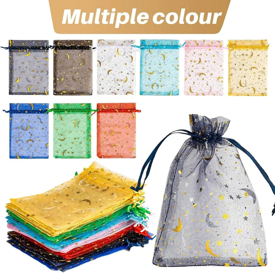 Moon Star Organza Bags:Compared with solid-color organza bags, stars and moons patterns make people feel more romantic and dreamy. They are very suitable for use as party favor bags on Valentine's Day, weddings, anniversaries and other occasions. They can be used to hold greeting cards and small gifts and given to friends and guests to share happiness and joy Storage Bags:The goodie bags are soft and delicate and will not scratch the items inside the bag. It can be used to store various small items, such as candy, jewelry, handmade soap, flowers, spices, etc. The drawstring design makes it easy to store and take out Mesh Bags Drawstring:Organza bags have good air permeability and can be used to store dried flowers, spices and other items, emitting fragrance and refreshing the air. Mesh bags can also be used as bubble bags to store small pieces of soap For Small Business:The favor bag has a translucent feature, which can show the items in the bag when it is packaged. It is suitable for stores and small businesses. Use elegant and exquisite packaging bags to display small items and increase the attractiveness of the goods