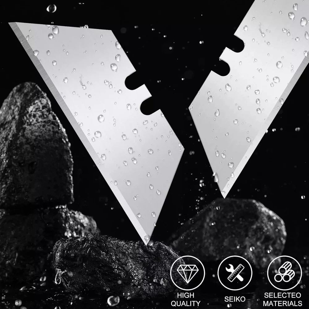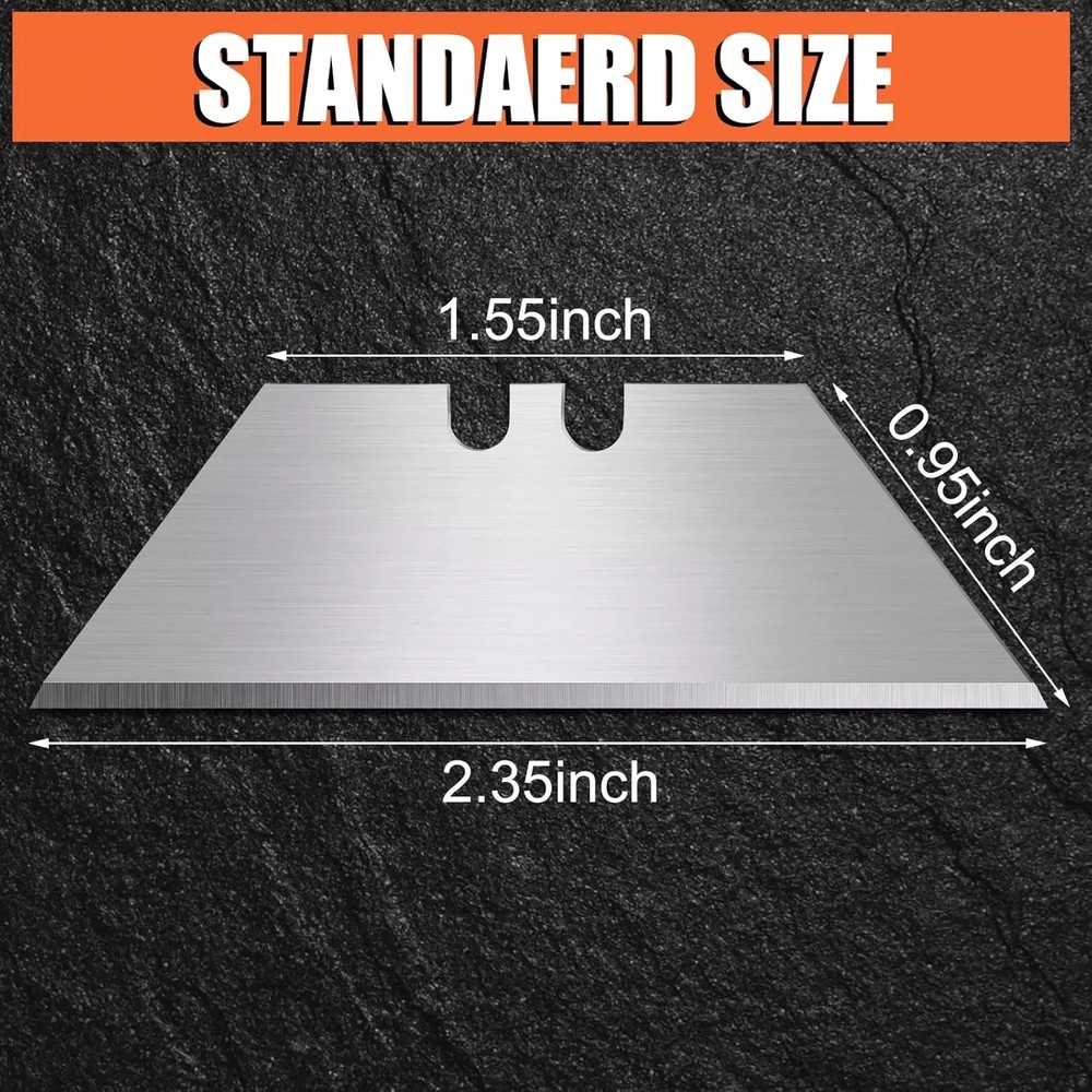 HIGH QUALITY SK5 HIGH CARBON STEEL: SK5 High carbon steel material is chosen to make razor blades utility knife blades refills high hardness and wear resistance. The excellent material makes utility blades for box cutter not easy to rust break and deform, have a longer service life, and are heavy-duty and practical utility knife blades. STANDARD BLADE REPLACEMENT: The razor blades utility knife blades refills are 1.26 inches wide at the top, 2.36 inches wide at the bottom, and 0.75 inches high. Standard size, suitable as a replacement blade for most folding knives, box cutters, and retractable knives, is a commonly used household tool. SHARP AND DURABLE: The razor blades utility knife edges are precisely sanded, polished, sharp, and durable, with good cutting performance. Use box cutter blades refills to cut quickly and the incision is smooth, great for cutting leather, rope, paper, carpet, rubber, cardboard, pipes, and more, and suitable for most DIY projects. PORTABLE PACKAGING: 100 pieces of box cutter blades refills are packed in 10 plastic storage boxes, 10 pieces in each box, convenient for daily use and carrying—enough quantity, perfect for sharing with family and friends to start your handmade creations. WARM TIP: If you encounter any problem using utility blades for box cutter, please get in touch with us immediately. We will solve the problem for you as fast as possible. In daily life, for the safety of your children, please put the razor knife blades where your children can't touch.