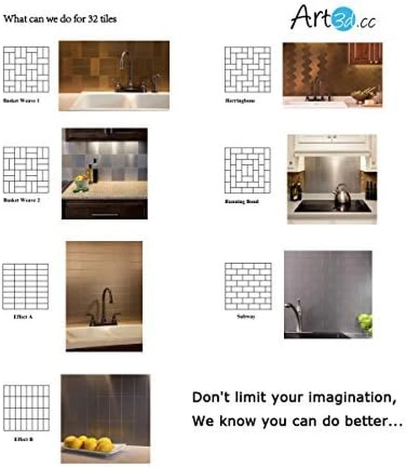 Store New Arrivals Add to Favorite View Feedback 100-Pieces Peel and Stick Tile Kitchen Backsplash Metal Wall Tiles, Brushed Aluminium Subway Description Item model number FBA_A16021P100 Style subway backsplash tile Item Thickness 0.15 Inches Pattern Solid Country of Origin China Warranty Description 2-year warranty Batteries Included? No Unit Count 100.0 Count Batteries Required? No Finish Metal surface Material Aluminum Installation Type Peel and Stick Item Display Dimensions 6 x 3 x 0.15 inches Coverage 11.8 square feet Edge Style Square Edge Form Factor Rectangular with square edges Item Package Quantity 1 Water Resistance Level Water Resistant Item Weight 14.08 ounces Size 100 tiles Special Features Heat Resistant, Lightweight, Flexible, Humidity Resistant, Scratch Resistant Special Feature Heat Resistant, Lightweight, Flexible, Humidity Resistant, Scratch Resistant Part Number FBA_A16021P100 Mounting Type Wall Mount Color Aluminum Finish Type Metal surface Global Trade Identification Number 00712809586400 Shape Rectangular Recommended Uses For Product Bathroom, Kitchen Is Discontinued By Manufacturer No Product Dimensions 6"L x 3"W Number Of Pieces 100 10% Aluminium + 60% Composite material + 30% Self adhesive glue back Texture : Premium Metal Wall Tiles, natural mental design wall art for interior wall décor Features : Peel and stick on wall, Light weight and heat shield, Flexible and humidity resistant Size : Cover 11.8 square feet, size of each plate: approximate 6" X 3" (15cm x 7.5cm) Easy to Use : The wall decals are easy to use and can stick the wood straight onto your existing wall Applications : Kitchen island walls, bathroom backsplashes, bedroom walls, laundry rooms etc Product Description Art3d metal wall tile is made of brushed aluminum with a durable scratch, splash and heat resistant polyurethane finish. With a peel and stick backing, these self-adhesive tiles transform a space with little work. Perfect for a bathroom or kitchen backsplash or feature walls. These easy to cut tiles don't require spacers or grout and bend to create perfect corners with less cutting and no wasted off cuts. Lightweight tiles are easy to work with and allow maximum adhesion. Each tile measures approximately 3-inches x 6-inches x 0.15-inches deep (75 x 150 x 4mm). Art3d metal backsplash tiles can be installed in minutes over a clean and sleek surface without any mess. Features: - Peel and stick installation, no glue, no grout - Fire-resistance and light weight - Easy clean and maintenance - Create a high end, professional look with these metal tiles. If cutting tiles, one of the following tools will be needed: - Jig saw or chop saw (recommended) - Hack saw - Hole saw or coping saw (for circular cuts or outlet cutouts only). ABOUT US We offer the best prices around on high quality products. Our E-store includes media such as books, movies, music and games while offering electronics, toys, sporting apparel, clothing, tools, general home, garden items and more. SHIPPING We are always working hard to ensure your package arrives as soon as possible. Please understand that some factors like weather, high postal traffic, and the performance of shipping companies are outside of our control. We offer free shipping to the lower 48 states and ship within 2 business days of payment, usually sooner. We do not accept P.O. Boxes. Please provide a physical address. RETURNS We offer a 30-Day Return Policy on items which you are not completely satisfied with. You have the option for a full-refund or an exchange of the item. No returns are available on items shipped outside of the USA. PAYMENT We accept PayPal. CONTACT US This page content is yet to come Please ad us to your favorite seller and visit again later Thank You