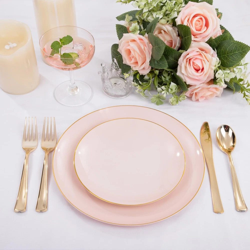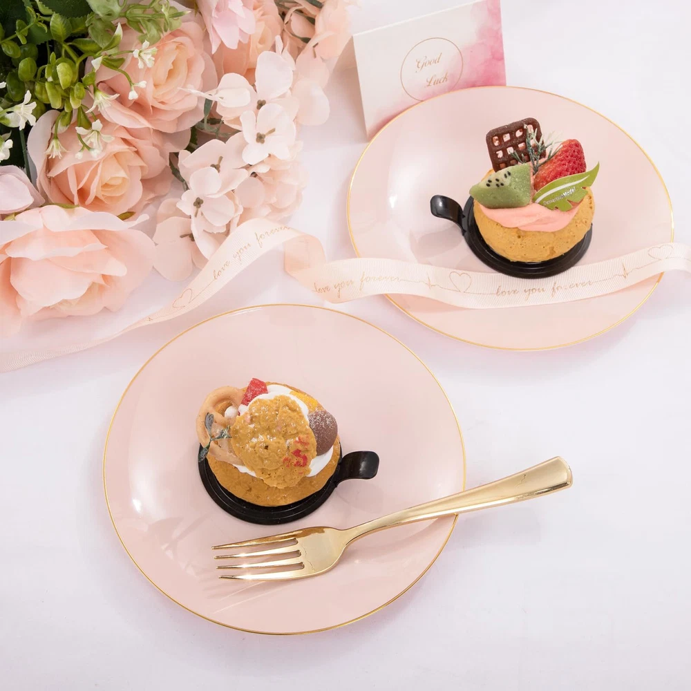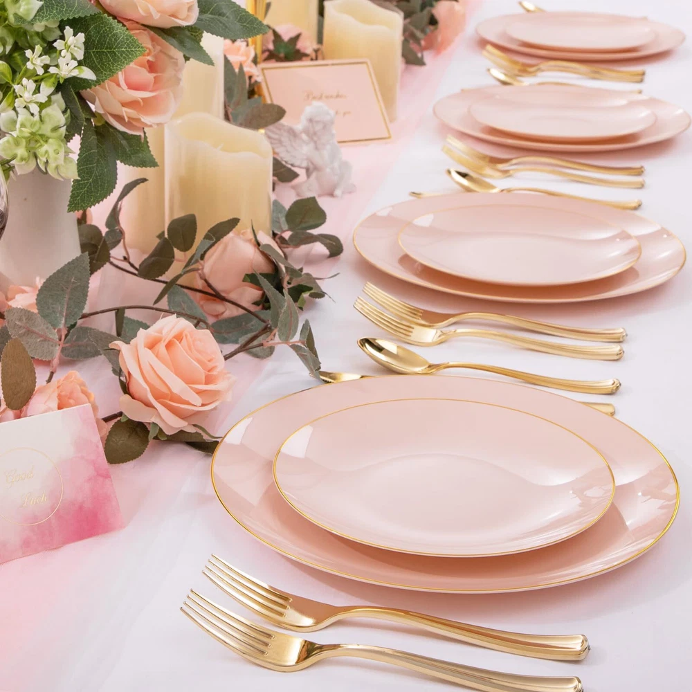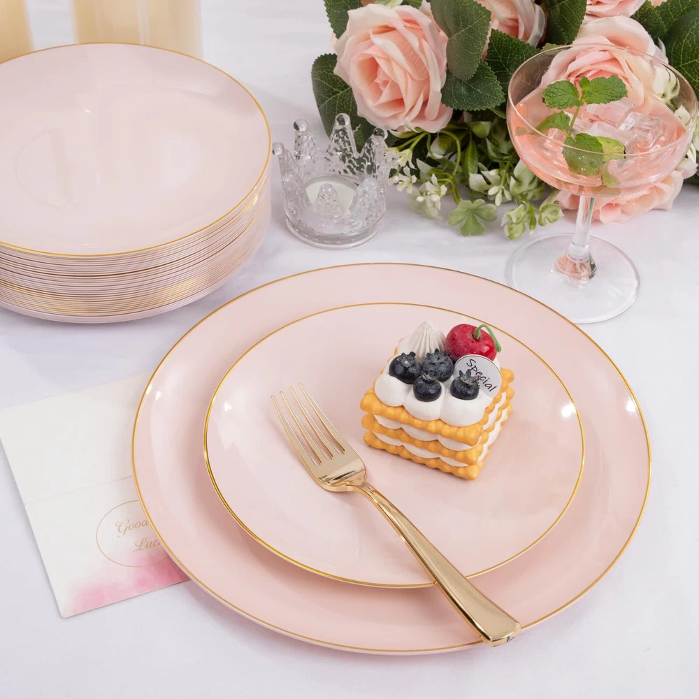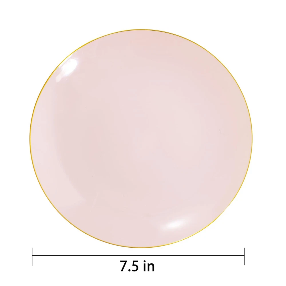 Premium Quality: Expertly made using heavyweight plastic construction for long-lasting strength, these pink plastic plates are resistant to breaking, bending and snapping. BPA-Free and non-toxic, this pink disposable plates are 100% food grade plastic ensures a safe eating experience for you and your guests. Elegant Appearance: 7.5inch gold rim plastic plates can hold more food and the gold rim make pink and gold plates look more refined and luxurious. For Every Occasion: This pink gold plates that is suitable for a variety of social events and occasions, such as for weddings, birthday parties, holidays, picnics, Suitable for banquets and all occasions. Good Value: Want more time to celebrate with your family? You can get rid of the pink plated plates or you can wash the pink dessert plates by hand and reuse them. Premium Set of Dinnerware: Our gold trim plastic plates are excellent options that you will get everything you need in this kit - plates (100 7.5inch dessert plates), which are perfect for events that you need to feel fancy or special.