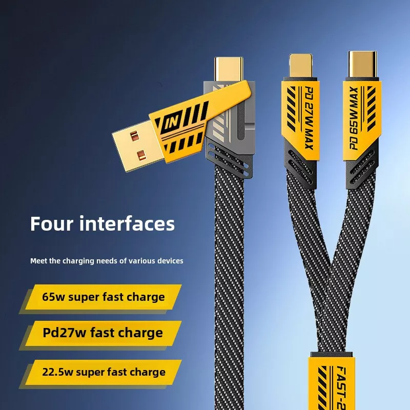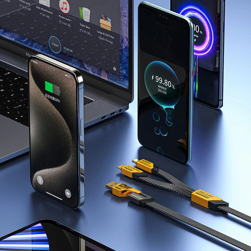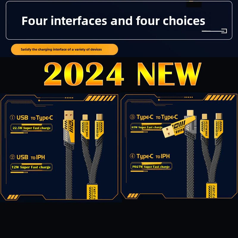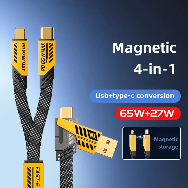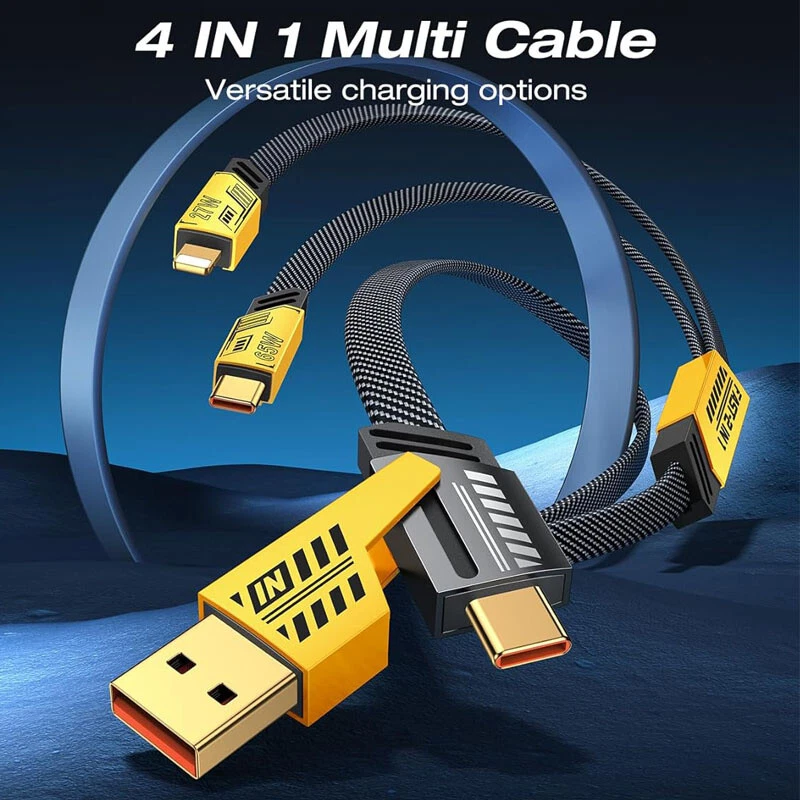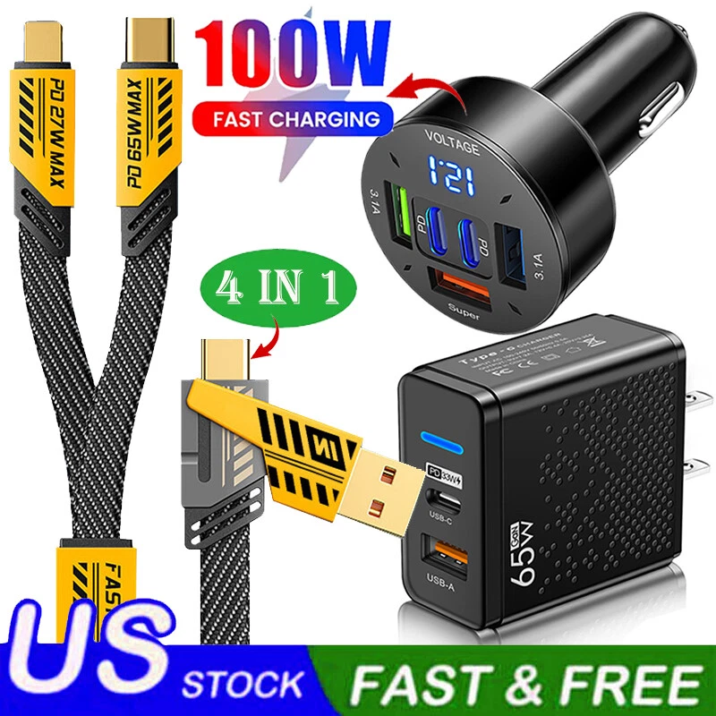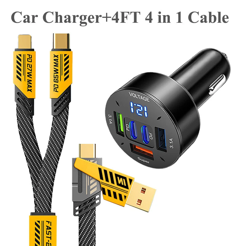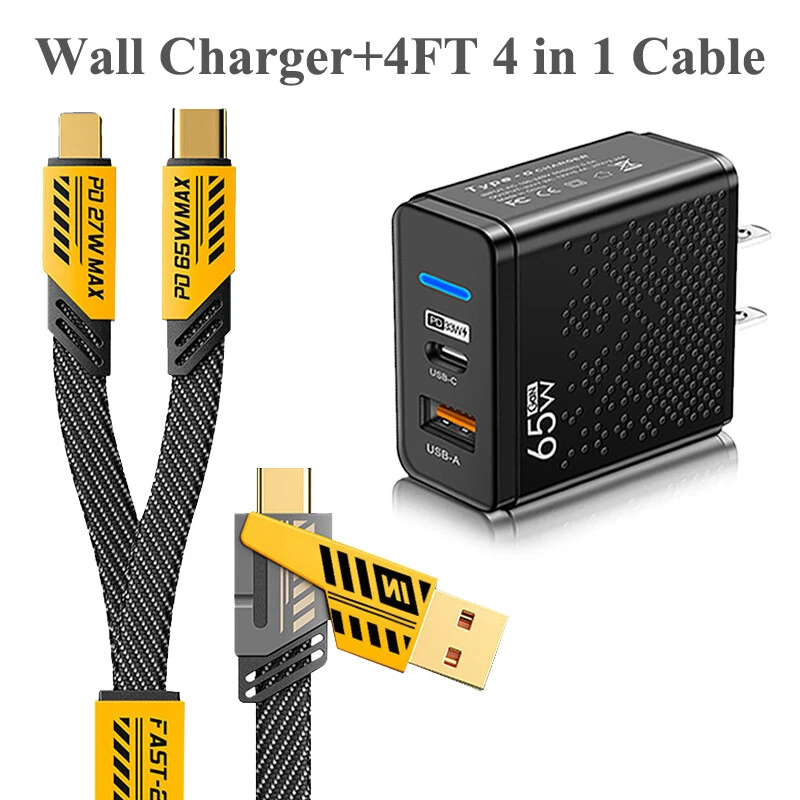 arameters: Product material: ABS + Aluminum alloy Length: 1.2m(1%-1.5% discrepancy ) Input interface: TYPE-C / USB Output interface: USB TO / For IOS Working voltage: 5V-20V Power: Downward with 65W, IOS27W Features: 1. [Multi Protocol Adaptation]: Used on multiple device models, supporting iPhone/MacBook/iWatch/Airpod, Charging Adapter, Smart Watch, Headphone, Smartphone 2. [Fast Charging]: When used with the fast charging protocol charging head, it can be charged to 80% in 40 minutes. It supports IOS27W fast charging and For Android 65W fast charging. It also suport Your own original fast chargine head too. 3. [Multi Charging Cable]: The USB C cable can be used to charge multiple devices at the same time. It has three different interfaces: USB A to C, USB C to C, USB C to L, and USB A to L. You can use it to charge your iPhone, iPad, MacBook, Android phones, and other devices. 4. [Bold Wire Core]: The 4 in 1 USB type C cable is made of flat braided nylon fiber, which is more flexible, and tangle-free than traditional cables. It is also anti-winding, which can effectively prevent the cable from tangling and knotting, and save you a lot of time and effort. 5. [High Speed Transmission] 480Mbps/S transmission speed, charging/data transmission synchronized. 6. [with Various Devices] :The USB C cable is with various devices, including the latest iPhone, iPad, MacBook, Android phones, and other devices. Note: 1. Please allow a bit error due to manual measurement. please make sure you do not mind before you bid. 2. The color may have different as the difference display, please understand.