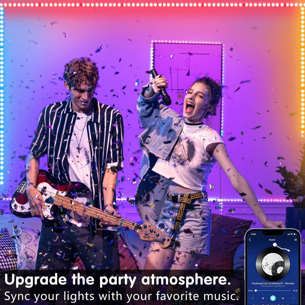 Keepsmile 100ft Led Strip Lights (2 Rolls of 50ft) 100FT, Multicolor Product Details Color: Multicolor Brand: Keepsmile Indoor/Outdoor Usage: Indoor Special Feature: Remote Controlled, Timer, Waterproof, Motion Sensor Light Source Type: LED Power Source: Corded Electric Light Color: Multicolor Theme: Music Occasion: Easter, Engagement, Wedding, Christmas, Graduation, Prom, Mardi Gras, Anniversary, Homecoming, Birthday, Halloween, Thanksgiving Style: Modern Material: Plastic Controller Type: app control,remote control Connectivity Protocol: Bluetooth, Remote Control, App Control Connectivity Technology: Bluetooth Number of Light Sources: 540 Voltage: 24 Volts Wattage: 36 watts Included Components: Power Adapter, User Manual, 2 rolls 50 ft led strip lights, Remote, Controller Item Weight: 0.71 Ounces Number of Items: 1 Control Method: App Water Resistance Level: Not Water Resistant Wireless Communication Technology: Bluetooth Manufacturer: Keepsmile Part Number: HU-XI-27 Item Weight: 0.706 ounces Package Dimensions: 10.12 x 7.13 x 0.67 inches Item model number: Z-100FT Special Features: Remote Controlled, Timer, Waterproof, Motion Sensor Batteries Included?: No Batteries Required?: No Bulb Features: Dimmable Package Dimensions : 10.12 x 7.13 x 0.67 inches; 0.71 ounces Item model number : Z-100FT Manufacturer : Keepsmile Color: Multicolor Brand: Keepsmile Indoor/Outdoor Usage: Indoor Special Feature: Remote Controlled, Timer, Waterproof, Motion Sensor Light Source Type: LED Power Source: Corded Electric Light Color: Multicolor Theme: Music Occasion: Easter, Engagement, Wedding, Christmas, Graduation, Prom, Mardi Gras, Anniversary, Homecoming, Birthday, Halloween, Thanksgiving Easter, Engagement, Wedding, Christmas, Graduation, Prom, Mardi Gras, Anniversary, Homecoming, Birthday, Halloween, ThanksgivingEaster, Engagement, Wedding, Christmas, Graduation, Prom, Mardi Gras, Anniversary, Homecoming, Birthday, Halloween, Thanksgiving See more Style: Modern APP Control and Remote Control: Stick 100 ft led lights around the ceiling, under the cabinets, under the bed frame, and easily control these 100 ft led light strips using either the Keepsmile app or remote control. Music and Light Dance: 100 ft led lights for bedroom Comes with a high sensitivity audio sensor that flashes in sync with music, you will get amazing experience from the new gorgeous, natural and dynamic light effect. Special Timer: The led lights for bedroom 100+ ft can be used as a light alarm clock, you can set the wake-up time and end time to turn it on/off automatically, your kids will love it. Flexible Led Strips:100 ft led strips lights can be bent without worrying about corners. EASY TO INSTALL: The LED strips have a strong adhesive that allows them to be securely attached to wood or walls. Widely: Anniversary,Birthday,Christmas,Easter,Halloween,Independence Day,Mardi Gras,New Year,Prom,Thanksg Note: These 100 foot LED strip lights are Not Waterproof.