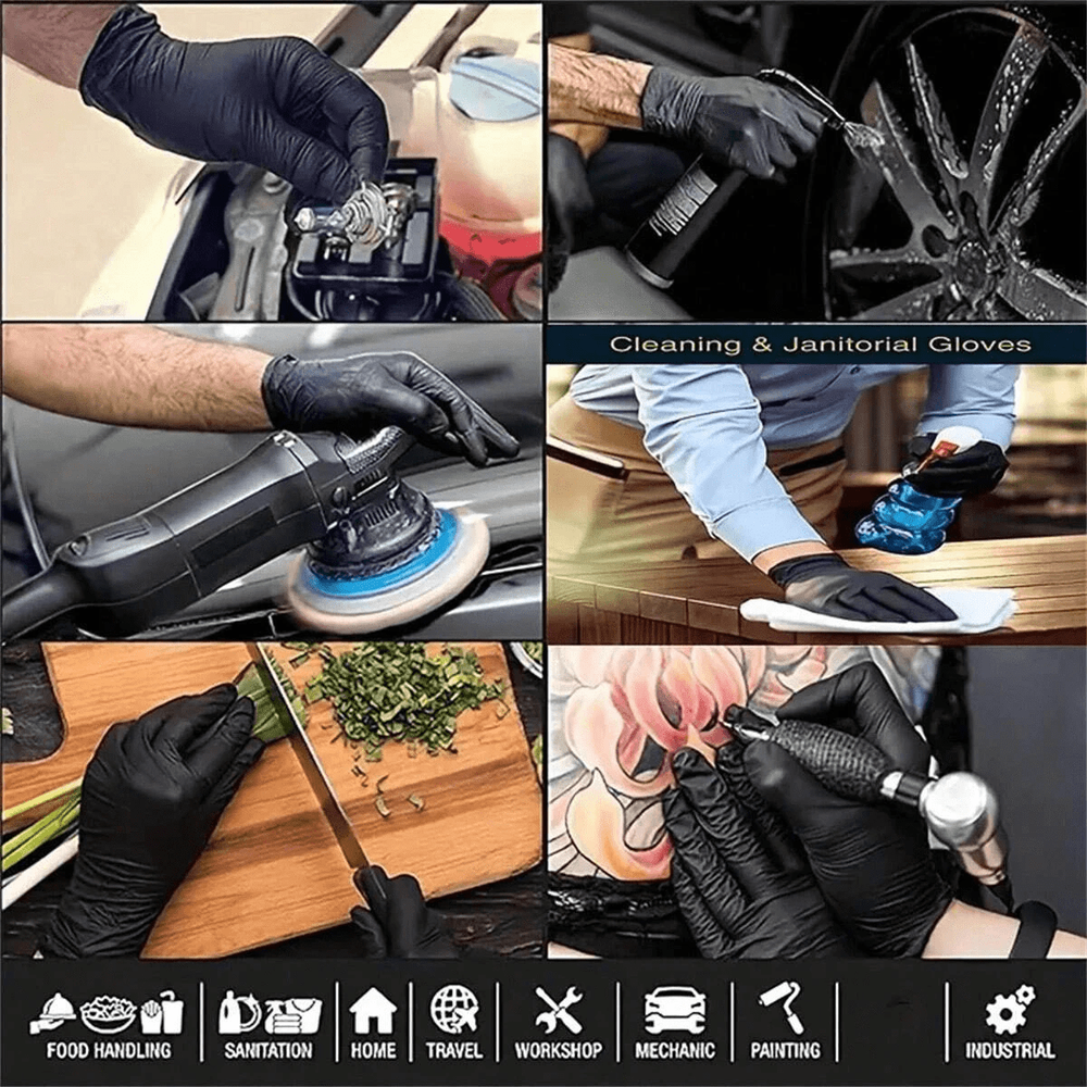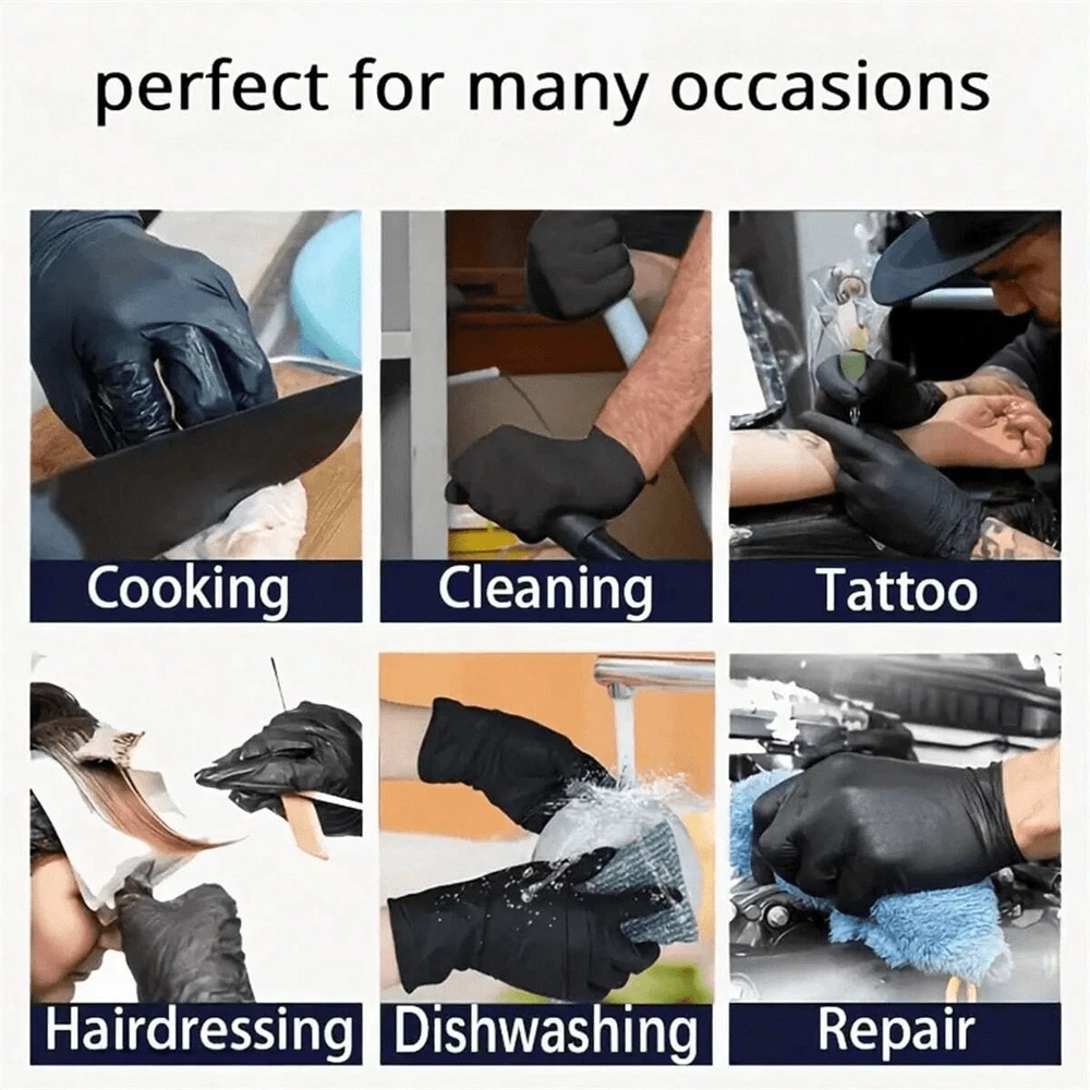 These gloves are a game-changer! Super durable, comfortable, and versatile—perfect for cleaning, cooking, or salon work. The latex-free, powder-free design makes them safe for sensitive skin, and the snug fit ensures no slips. Love the combo of black and blue for easy sorting. Great value for 100 high-quality gloves!