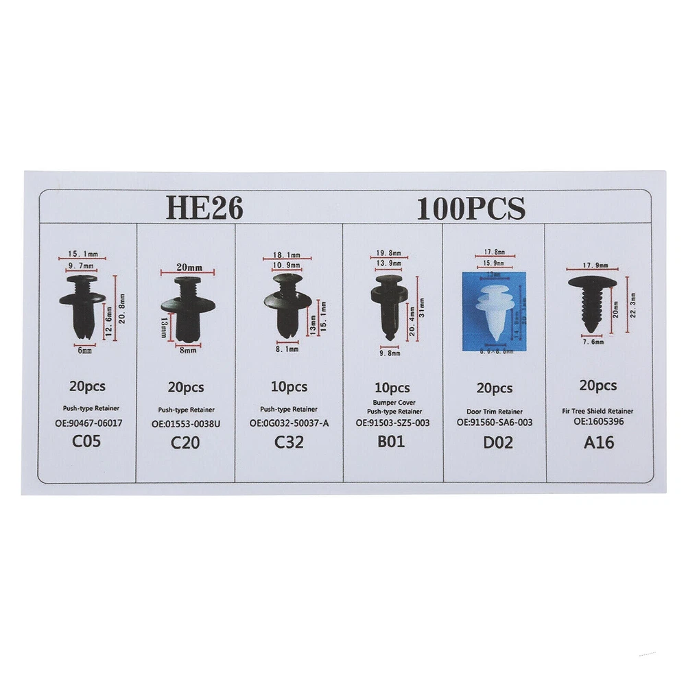 For Toyota Fixing Fastener Kit Bumper Fender Liner Push Type Retainer Clips car Description: Features: Various fasteners to meet the needs of different parts of the car. Used widely for car fender, bumper, door or other car surface. High quality plastic material, durable and long service life. Note: All vehicles have a range of different clips used on them. Different models have different sizes and there are no universal clips. Please check as much as possible before buying. Package including 100pcs Clips + 1 Plastic Box Clip of C05 Screw Type Clip Retainer Rivet Condition: Brand New Material: Black Nylon Size Approx: Head Diameter: 15mm Stem Length: 12mm Fits Into 6mm Hole For GM Replace 20426301 For Mazda Replace 9926-50-625 For Toyota Replace 90467-06017 For Toyota Replace 90467-06017-20 For Toyota Replace 90467-06017-41 For Auveco A14260 Clip of C20 Fender Liner Clip Splash Shield Blind Rivet Fits For Mazda Replace FB01-56-964 Fits For Honda Replace 90675-SB3-003 Fits For Nissan Replace 63876-95596 Fits For B16 B18 B18C B20 H22A EK9 EG6 Fits For Accord Civic Prelude CR-V Del Sol CRX Fits For INTEGRA GSR S2000 AP1 MUGEN Fits For TYPE R Si Condition: Brand New Material: Black Nylon Size Approx: Head Diameter: 20.6mm (0.81") Stem Length: 9.5mm (0.37") Fits Into 8mm (0.32") Hole For Auveco A16000 Clip of C32 Push-Type Retainer Black Nylon Head Diameter: 20mm Stem Length: 13mm Fits Into 8mm Hole Fits For Mazda 6 2002-2006 Fits For Mazda 323 1998-2003 Fits For Ford Aspire Fits For Mazda Replace B092-51-833 Fits For Ford Replace MB-455-56143 Fits For Kia Replace MB455-56-143 Fits For Nissan Replace 09409-09302 Fits For Hyundai Replace 86590-28000 For Auveco A17632 Clip of B01 Front & Rear Bumper Retainer Push Type Clip Condition: Brand New Material: Black Nylon Head Diameter: 20mm Stem Length: 18mm Fits Hole Size: 10mm For Honda Replace 91503-SZ5-003 (1996-On) For Acura Replace 91503-SZ5-003 For Auveco A20564 For PAS9282, PAS938 Clip of D02 Interior Trim Board Retainer Clip White Nylon Top Head Diameter: 13mm Middle Head Diameter: 16mm Bottom Head Diameter: 18mm Stem Length: 15mm Stem Diameter: 8.5mm x 8.5mm Overall Length: 20mm Fits For GM Replaces 94858299 Fits For Geo Prizm 1998-On Fits For Toyota Replaces 90467-10161 Fits For Sienna, Solara & Tercel 1990-On Fits For Previa 2007-On, Corolla 2003-On Fits For Lexus LS460, LS460L 1990-On For Auveco A18876 Clip of A16 Radiator Yoke, Fender & Bumper Shield Retainer Christmas Tree Type Clip Black Nylon Head Diameter: 17.8mm Stem Length: 20mm Stem Diameter: 7.6mm For GM Replaces 1595864, 1605396 For Ford Replaces 388577S For Ford Replaces W705589-S300 For Auveco A11146, A15414 We offer free returns with any orders within 30 days from the date of delivery. No restocking fees, no administrative fees, no return shipping fee, and no hassle! We will email you when a prepaid return label is ready to download from your ebay account. You just have to print it out and drop the package off at a USPS facility. When we get it back, you will be notified and credited for the full price of the items/products that are returned. Since the shipping fees go directly to the delivery service, we are not able to refund any shipping costs. For warranty returns passed the 30 days, please call or email us so we can make sure we are providing you with the best possible support.