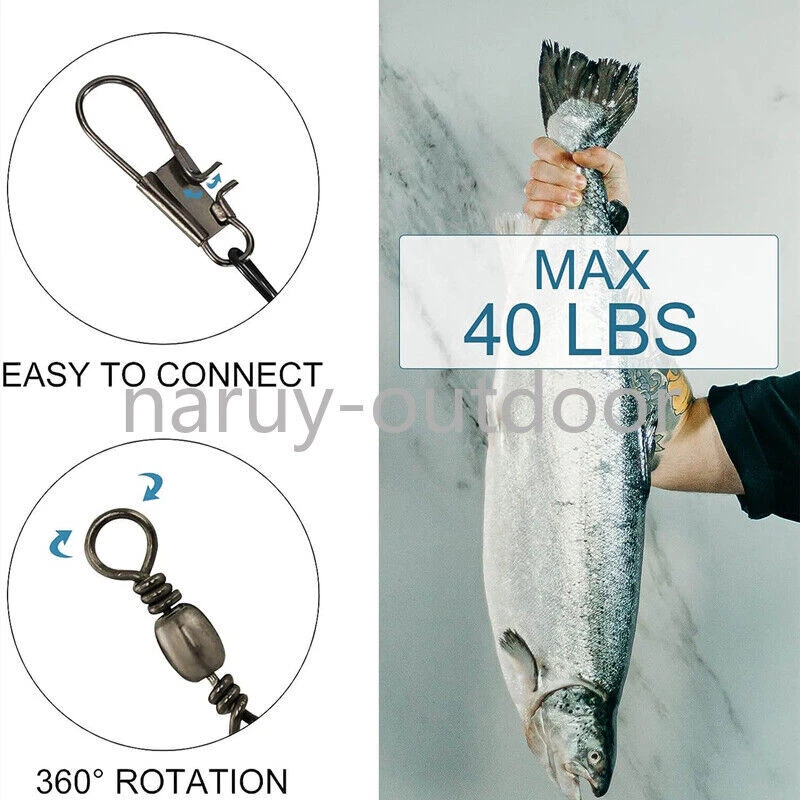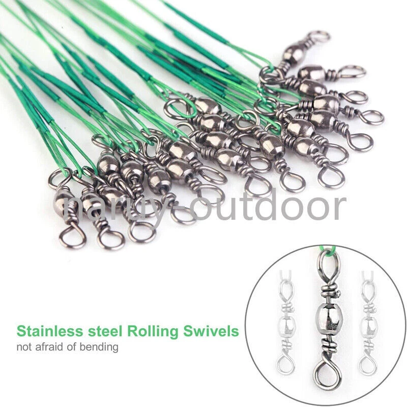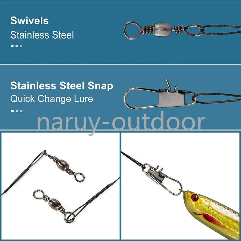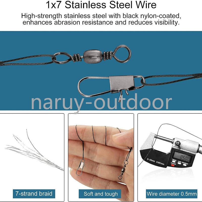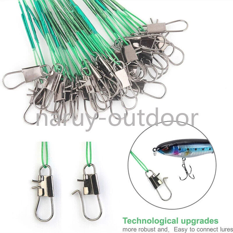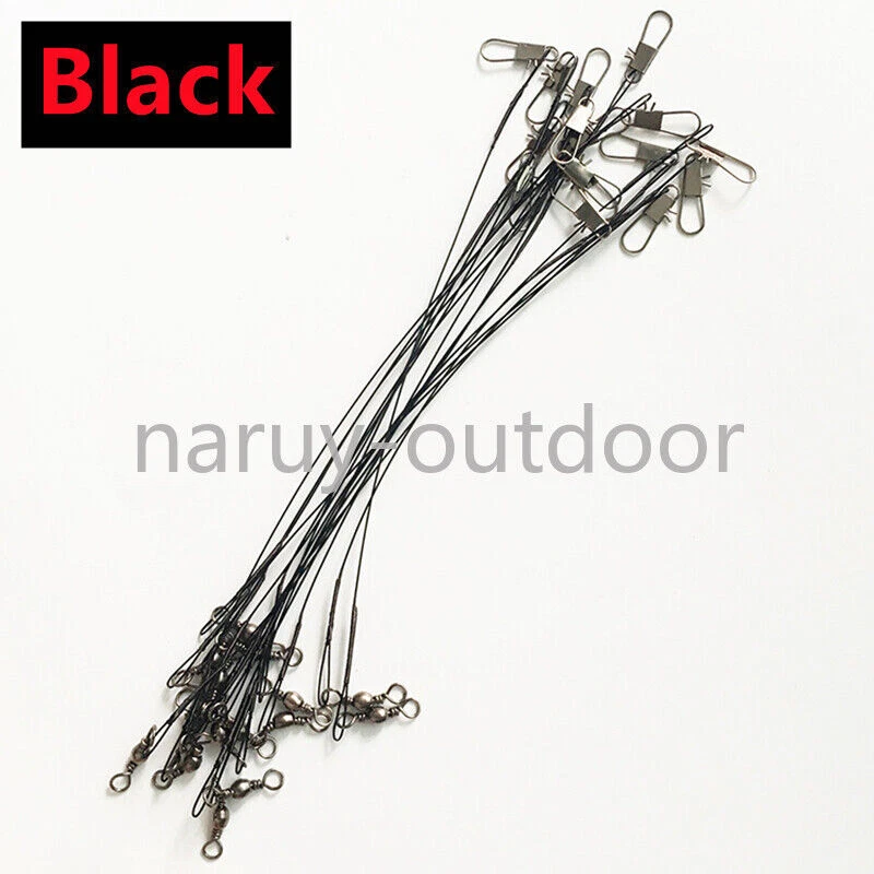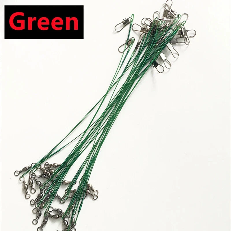 Features: 1)Fishing tackle leader: made of premium stainless steel, nylon-coated, to ensure these high-quality leaders are tough enough for sharp teeth, stronger. 2)Perfect fishing equipment leader, corrosion resistant, durable, and tough enough for fishes with sharp teeth, with swivel and clip, is easy to connect fishing lure, fishing bait, fishing hooks, weight set. great for use in both saltwater and freshwater. 3)Fishing accessories of steel leaders are great for toothy fish, such as pike, catfish, trout, crappie, striped, bass, eagle claw, northern pike. Details Color: green / black / silver Length: 10cm,15cm, 20cm, 25cm, 30cm Package: 100PCS Fishing Wire Leader Notice: 1.Due to the difference showing indifferent monitors, the picture may not reflect the actual color of the product. 2.Please allow 1-2CM error due to the manual measurement. Hope you can understand. Thank you!