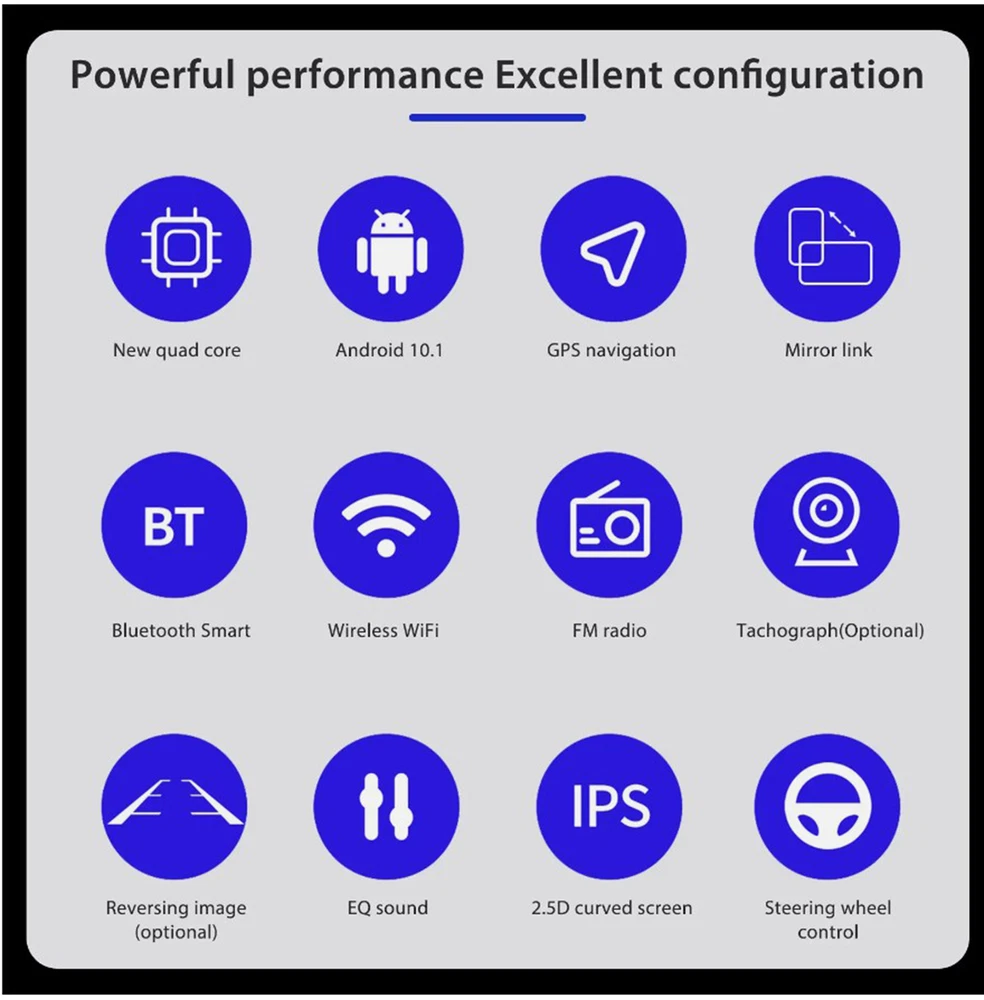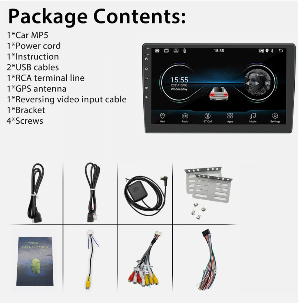 Product Description: Description: This car MP5 player has a built-in 10.1-inch high-definition digital screen and has better performance and more powerful functions. And it is also equipped with Bluetooth function, which can be connected to mobile phones, and supports hands-free calling, safer driving, and Bluetooth music playback. Stylish and new design is adopted, and it can perfectly match your car. It is also high-quality and easy to install and use. Specifications: Specification: Navigation: GPS navigation Screen size: 10.1 inches Voltage: 12V Operating system: Android 13 Bluetooth: support Reversing image: support RAM: 1G ROM: 16G Voice control: support Machine weight: 1.25KG Screen resolution: 1024x600 Panel size: Trapezoid Panel light: White light Host depth: 55mm Apple CarPlay Android Auto: support Mirror Link: support (Apple/Android) Radio band: FM Power: 60W Working temperature: -10-60°C Reversing image: Support (camera option) Steering wheel control function: support Video output: Yes Dual screens at the same time: support Built-in offline map: Yes Wireless WIFI: Support Bluetooth model: Version 5.0 Radio frequency: FM 87.5-108MHz Square control line: Yes USB interface: 2 USB ports Reset button: Yes Button: touch button RCA: 2 audio output, 2 audio input, 1 reversing input, 1 video output Front aux audio input: None DVR function: support DAB function: None OBD function: None TV function: No DVD core machine model: No 4G/3G: No Supported audio formats: MP3/ WMA / WAV / APE / FLAC Supported video formats: RM / RMVB / AVI/ MP4 / MKV/ 3GP Picture format: JPG Languages: Indonesian/Malay/Czech/Danish/German/English/Spanish/Italian/Filipino/French/Croatian/Italian/LatVial/Lithuanian/Hungarian/Dutch/Norwegian Bokma/Malay/Polish/Portuguese/Romanian Slovak/ Finnish/Swedish/Vietnamese/Turkish/Greek/Bulgari/Asian/Russian/Ukrainian/Hebrew Urdu/ArabicLanguage/Persian/Hindi/Bengali/Thai/Khmer/Korean/Chinese/Traditional Chinese/Japanese Feature: -Car Stereo: This Car Stereo is equipped with 10.1 inch big screen. High revolution, supports 1080P ultra clear video. 2.5D arc edge anti-scratch tempered glass screen, durable and not easy to break. -GPS Navigation, WIFI Supports: Car stereo double din with New GPS navigation function, supports offline/online mode, real-time positioning and accurate navigation. Android software installation is available. Free access to the Internet, giving you a wonderful Internet experience. -Bluetooth 5.0: Built-in Bluetooth 5.0 version, supports hands free phone calls and music playing, making driving safer. File transfer can be faster and more stable and music playback quality is improved. -FM Radio, Steering Wheel Control: FM radio, high-definition broadcast radio, you can choose your favorite stations and listen to news, music and program anytime. RDS: TA, AF, PTY are supported. Steering wheel control is available, which is easy to learn and operate. -Wireless Carplay: You can choose wired connection or wireless connection to carplay, connect to Apple mobile phone, access mobile phone address book, mail, notification, map navigation, music, video and other information, and realize voice control. -Wireless Android auto: The Wireless Android auto car system can closely integrate the user's Android phone and player, and realize navigation, make calls, send and receive information, listen to music and other operations through data cable connection; Package Include: 1*Car MP5 1*Power cord 1*Instruction 2*USB cables 1*RCA terminal line 1*GPS antenna 1*Reversing video input cable 1*Bracket 4*Screws Note: 1. Please allow minor differs due to manual measurement. 2. The picture may be a little different from that of real item due to the different display and different light. 3. Due to different producing batches, product details might be a little different. If you mind the difference, please buy with caution. Thank you for your understanding.