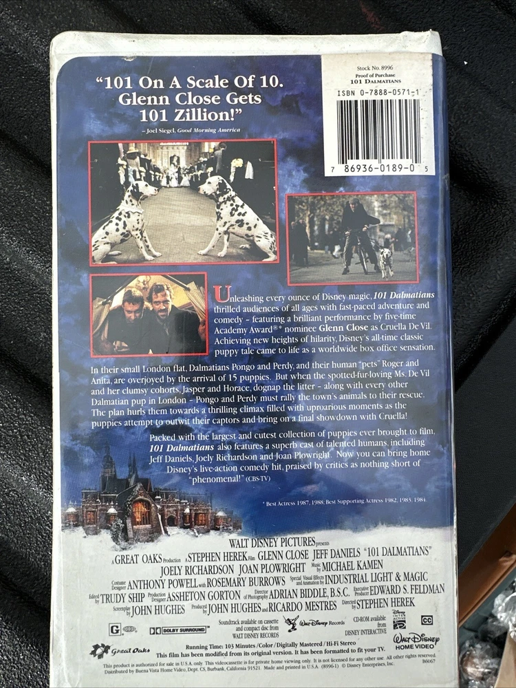 101 Dalmatians (VHS, 1997, Clam Shell) Glenn Close-Jeff Daniels Live Action