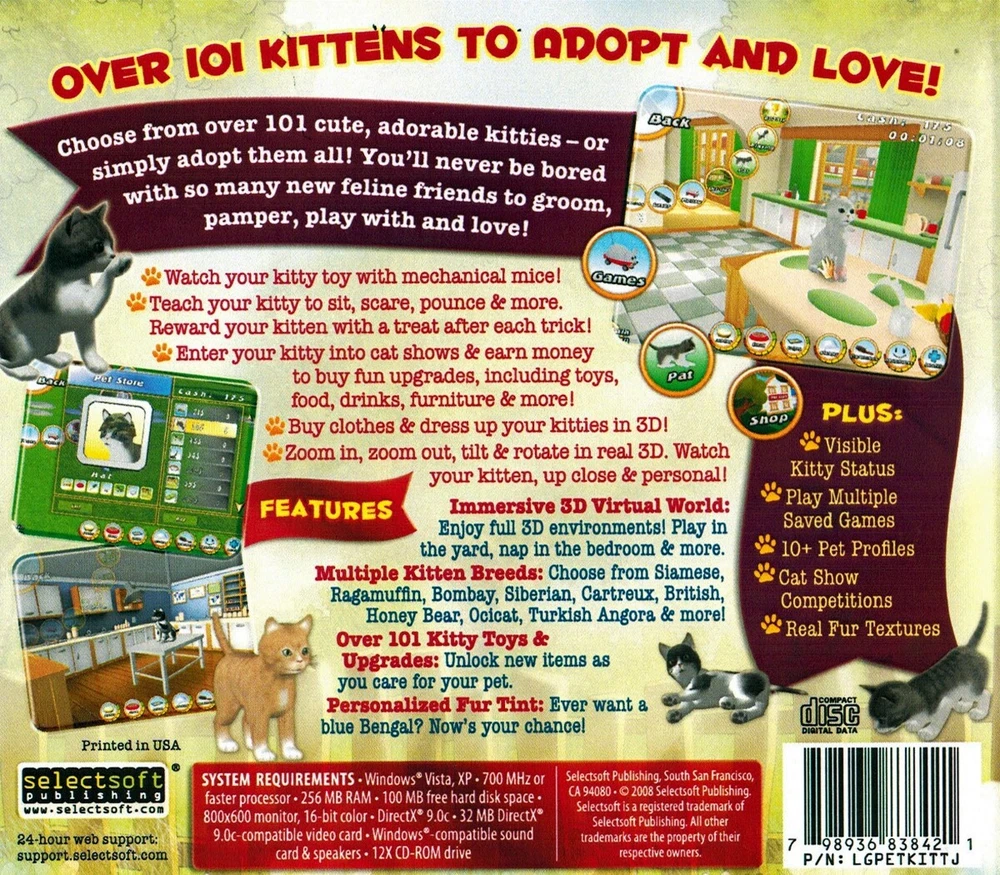 Current Discount Offers Serving the eBay Community Worldwide Since 1997! PlayPets 101 Kitty Pets Adopt & Love in Immersive 3D Virtual World Watch your kitty toy with mechanical mice! Teach your kitty to sit, scare, pounce & more. Reward your kitten with a treat after each trick! Multiple Kitten Breeds: Choose from Siamese, Ragamuffin, Bombay, Siberian, Cartreux, British, Honey Bear, Ocicat, Turkish Angora & more! Personalized Fur Tint: Ever want a blue Bengal? Now’s your chance! Play in the yard, nap in the bedroom & more. Plus: Visible Kitty Status Levels; Real Fur Textures. Features: Reward them with a treat after each trick! Enter pet shows & earn money to buy fun upgrades, including beds, food, magic hats & more! Buy clothes & dress up your pet in 3D! Zoom in, zoom out, tilt & rotate in real 3D. Watch your pet, up close & personal! Immersive 3D Virtual World: Enjoy full 3D environments! Over 101 Accessories & Upgrades: Unlock new accessories as you care for your pet. Play Multiple Saved Games; 10+ Pet Profiles; Pet Show Competitions System Compatibility Tested Works With Windows XP, Vista, 7, 8 & 10 Product Condition / Packaging Each is New in Sealed Retail Case With Cover Artwork Product Notes Outside USA : Product compatibility untested outside USA. Please see below. Shipping Ships in secure, protective packaging with delivery tracking. Orders ship first-in first out, usually early in posted handling time period. Please see "Shipping & Payments" section above for shipping services, with rates and estimated delivery dates. For any question, including special handling request, desired expedited shipping services (and rates) not shown or other, please eBay Message. Any current/subsequent contact or Paypal-payment note may not be seen prior to order shipment. Outside USA: Each bundled Item (pre-identified as a "Bundle" in listing) counts as only a single item to minimize shipping charge Payment We accept payment through eBay Managed Payments system. eBay system will automatically charge sales tax as applicable. Service / Support We are here to service all pre- and post-purchase questions. Returns always accepted within 30-days for any reason; buyer responsible for return delivery. Per eBay guidelines, please eBay Message us prior to posting any feedback other than positive, or taking other action, to provide us opportunity to resolve any issue. We do not claim to be product experts for each of 1000s software & DVD titles offered, but with 20+ years experience, may be able to help troubleshoot installation. (For post-installation usage help, please refer to on-screen documentation usually accessible within software, or in "help" file, else possibly available on Internet). Outside USA: Though compatibiilty tested within USA only, orders regularly fulfilled outside USA with rarely any reported issue. Our business hours: 9am - 6pm Pacific Time USA, Monday - Friday (except US Postal Holidays). eBay Message us (cyber-deals) by clicking on either: "Contact Seller" link in your order for this item in your Purchase History - (Best Method) "Ask A Question" link below in the Questions & Answers section on this listing page