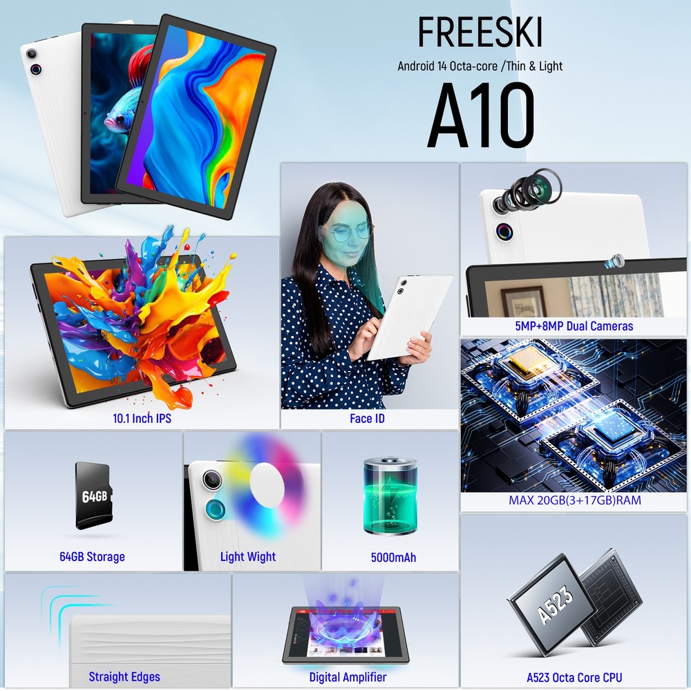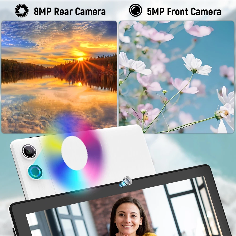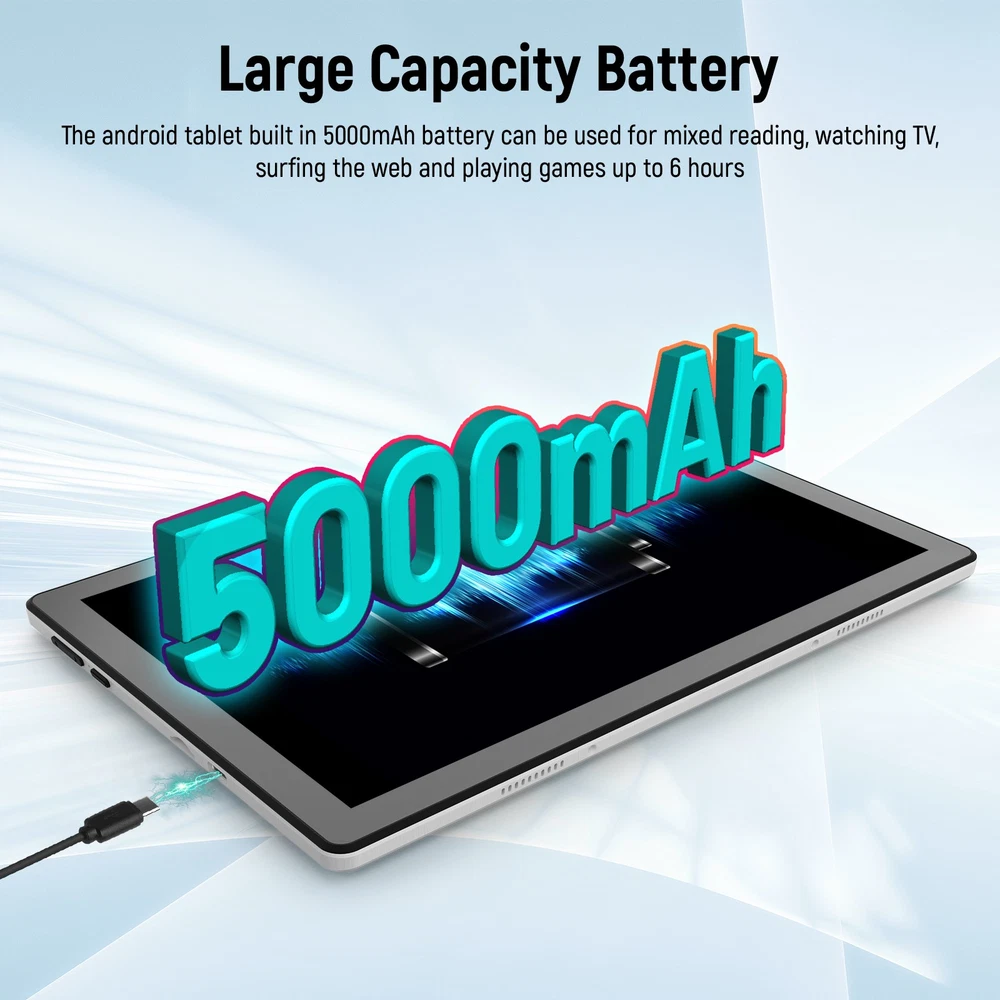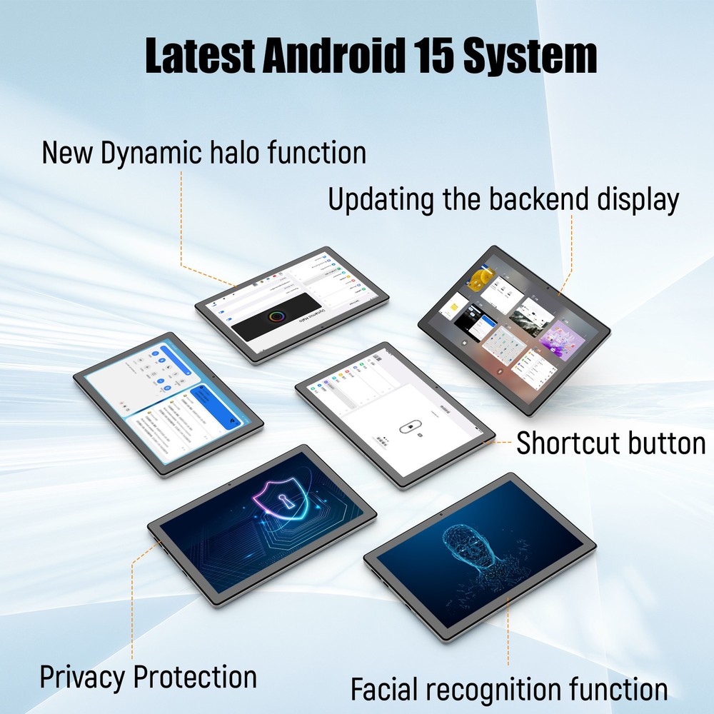 About this item 🏆【Latest Android 15 Tablet】This tablet is powered with the latest Android 15 OS2.5, which improves the tablet's performance and efficiency giving users more control over their data and personal information, and allows you to further customize your device and enhance user protection and accessibility features. Updated includes new themes, AI-generated wallpapers, safety, data privacy and improved functionality for a range of accessibility features. This makes the tablet easier and more efficient to use and a great companion to your life! 💾【20(3+17)GB+64GB+1TB Expansion+ 8-Core CPU】This Android tablet has max 20GB RAM(3GB RAM + 17GB virtual RAM) and 64GB ROM storage, it can be expanded with a micro SD cardthat allows for an expansion of 1TB of memory (SD card is not included). Tablet runs with new generation ultra-high performance and low power consumption Octa-Core 2.0GHz CPU, achieve faster and more stable running and storage speeds. With the Mail G57 graphics processor, you can play popula games/watch video with great smoothness and enjoy that without the stress of running out of storage space. 📞【WiFi 6+Bluetooth 5.3+Face Unlock】This 10 inch Android 14 tablet uses 6th generation WIFI technology, supports 5G&2.4G dual-band WiFi, which allows you to search the network quickly and freely, and provides a better network connection with lower latency, stronger signals, and faster speeds. Furthermore, the tablets support face recognition for unlocking, allowing your privacy is more privacy. Furthermore, the tablet is compatible with Widevine L1, which allows you to stream high-definition video on Netflix, Amazon Prime Video, and other platforms, with smoother and faster operation. 🎬【Widevine L1+Functional Tablet】This android tablet is compatible with Widevine L1, which allows you to stream high-definition video on Netflix, Amazon Prime Video, and other platforms, with smoother and faster operation. Besides, it is equipped with rich functions like face recognition, child protection, screen Split, make your tablet experience more convenient. A good companion for your or your kids. 🔋【Long Lasting Battery & 5MP+8MP Dual Camera】The 10 inch tablet is powered by a long-lasting, reusable 5000mAh Li-ion battery that easily gives you up to 8 hours of reading, browsing, watching movies, and playing games, giving you more time for entertainment and surfing the web. The Android 14 tablet is equipped with 8MP+5MP, which allows you to freely shoot such as people, sports, snow etc., allowing you to enjoy shooting with out this tablets. 🎁【Ideal Choice for Gifts】The tablets 10 inch with lightweight and slim design, only 9mm thin body, it is a good choice for birthday or a gift for family and friends. We provide a one-year warranty for this octa-core Android 14 tablet. If you receive any problematic products, please feel free to let us know. We will provide you with a satisfactory and professional solution within 48 hours. Go and get this 10 inch tablet.